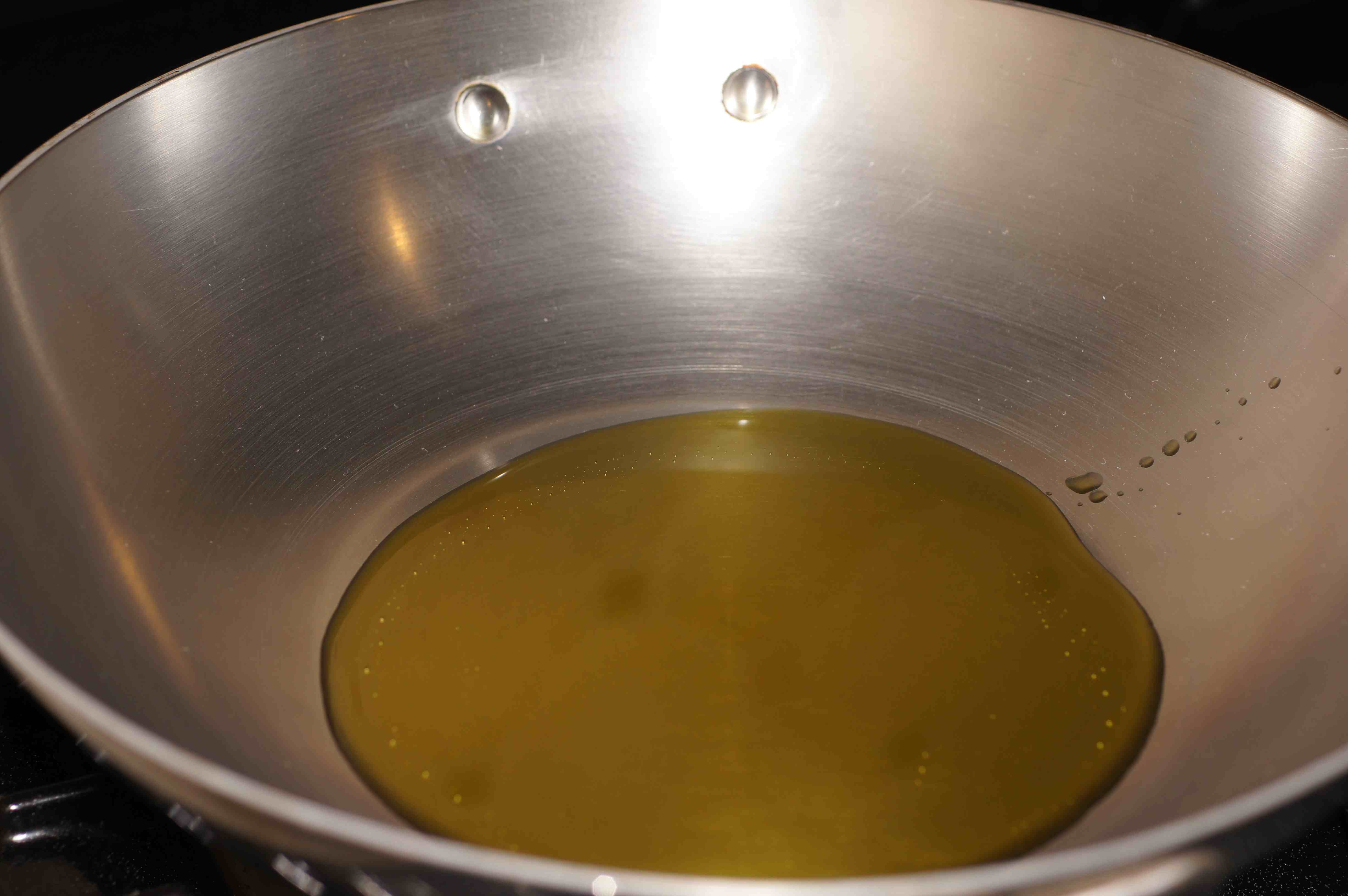 Add olive oil to the sauté pan over medium-high heat.
