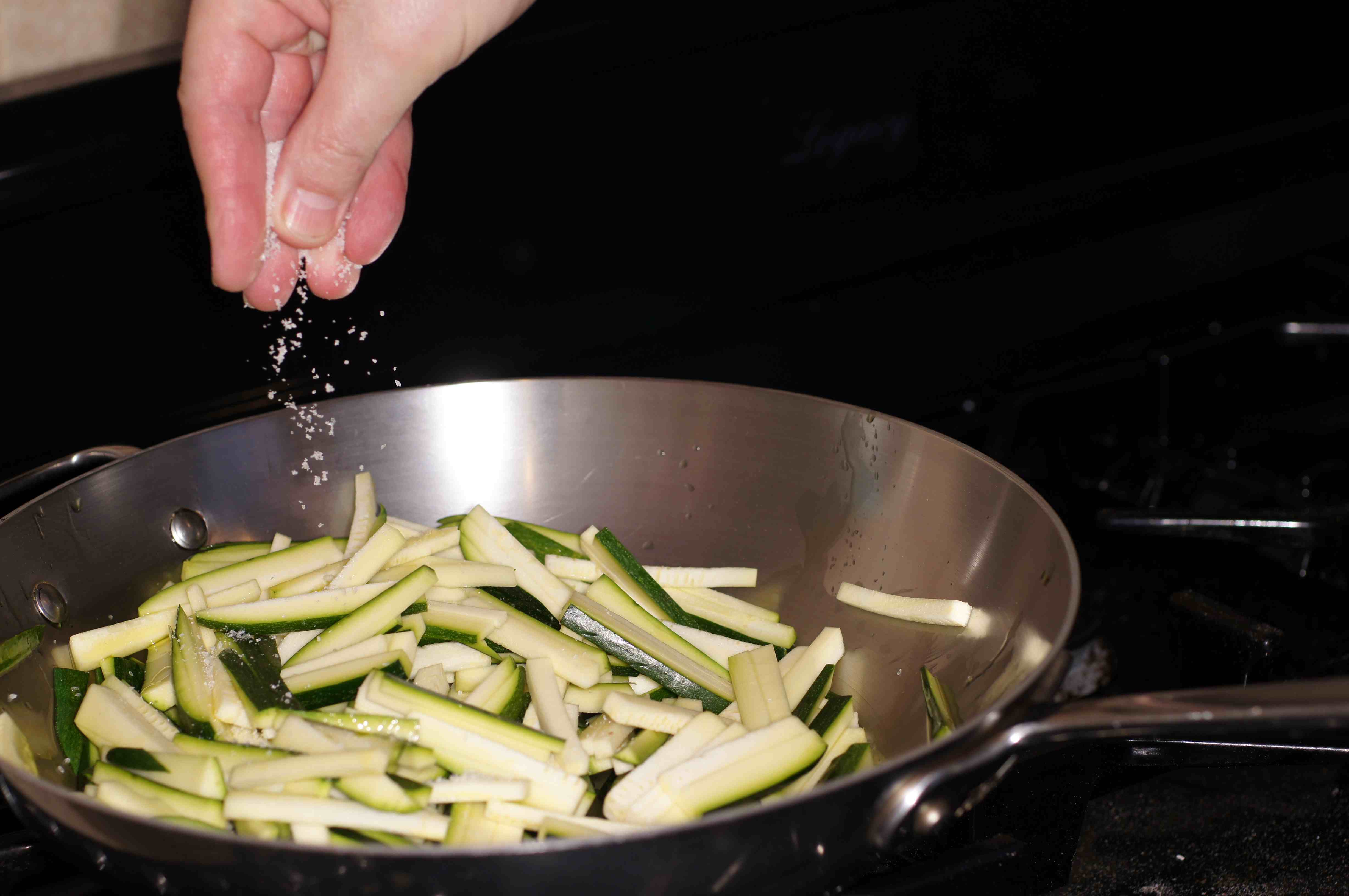 When the oil is hot, roughly 1 minute, add the zucchini
