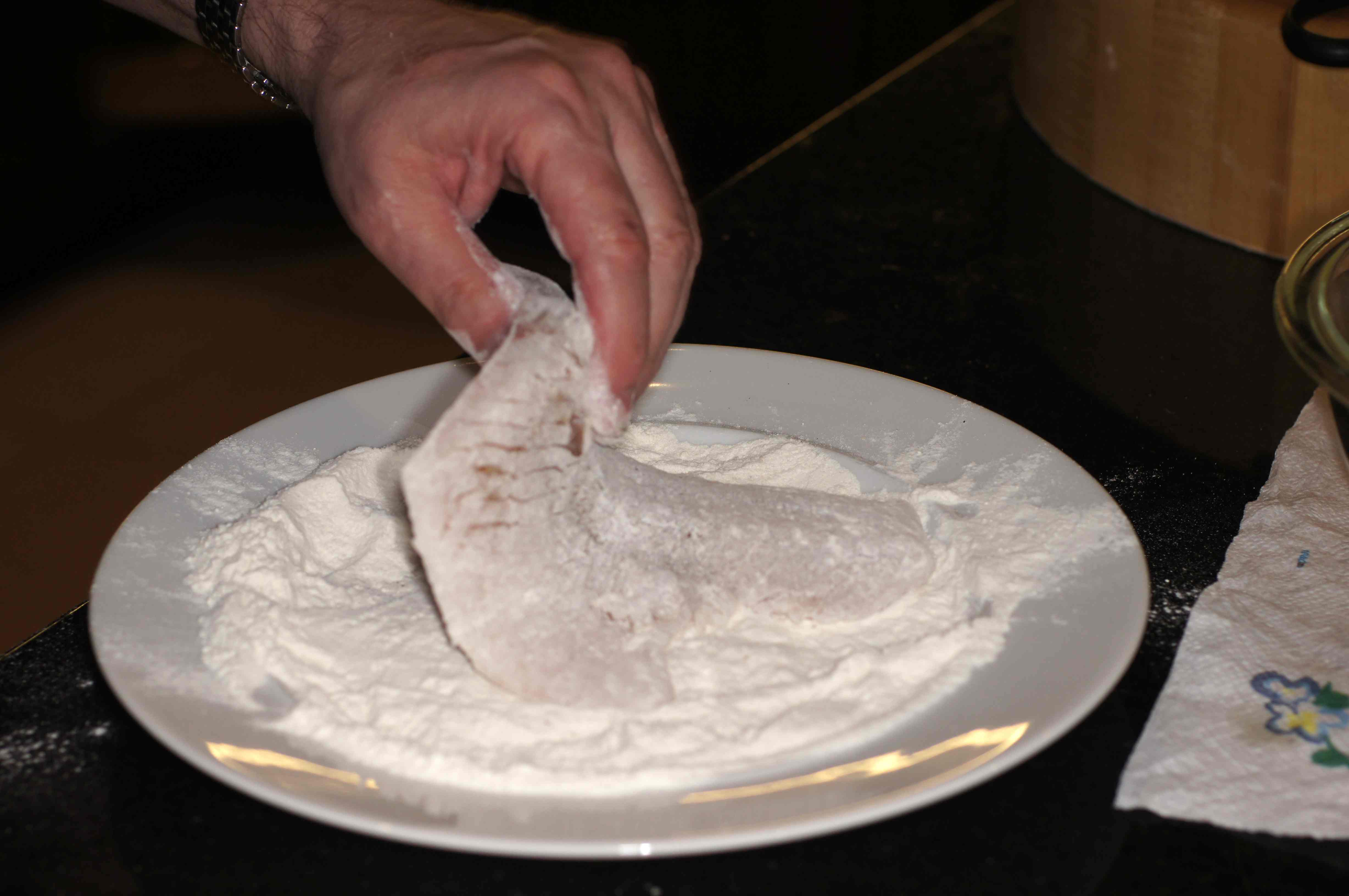Cook for 2 to 3 minutes until flour has formed a nice golden crust and turn. Things got a little hectic and somehow we missed the turning shot. Oh, well. Use your imagination. 🙂 Cook an additional 2 minutes and place on a dinner plate.