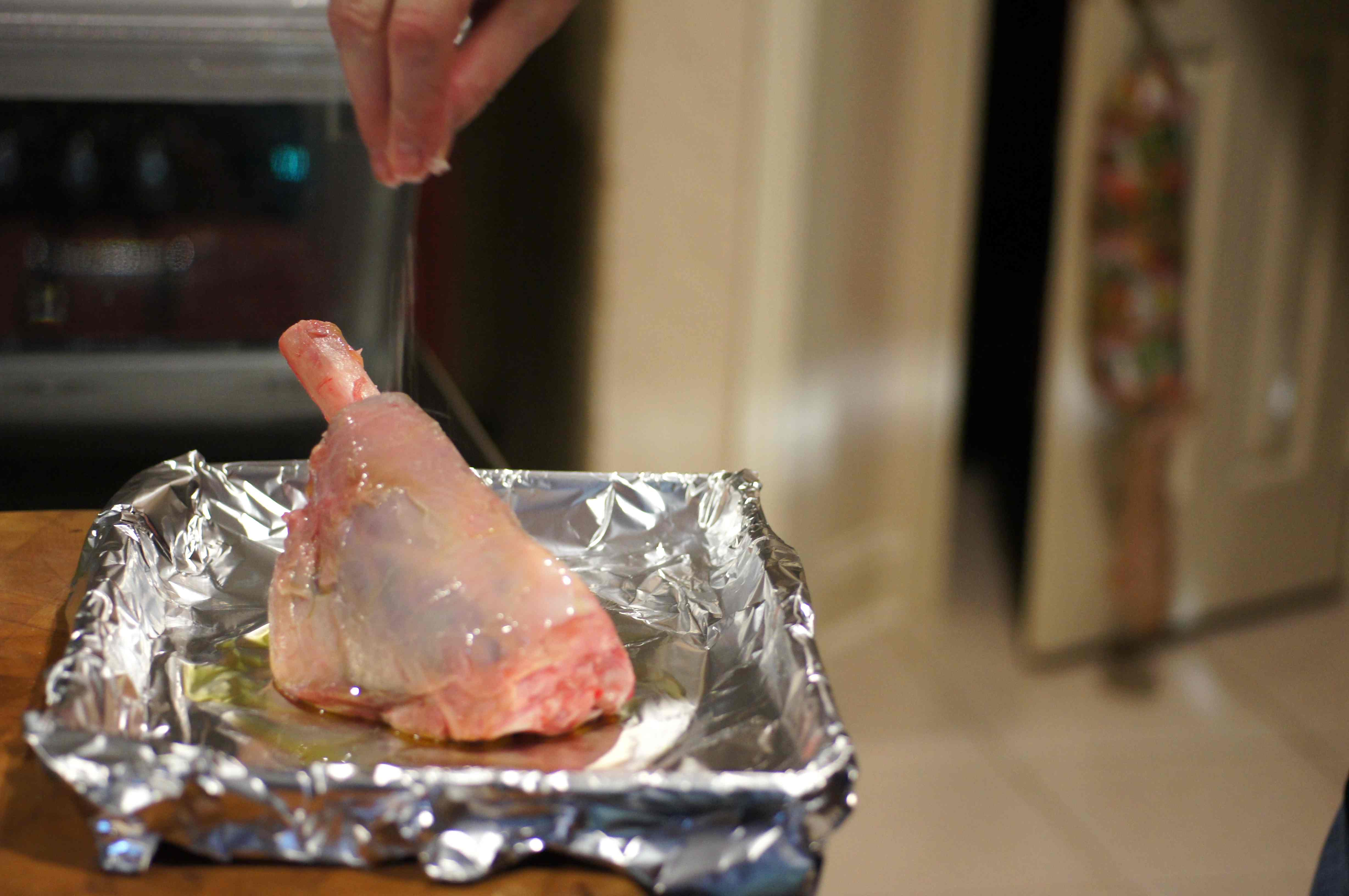 After 48 hours, remove the lamb shank from the water bath and cut open. Notice all of those juices that have collected in the bag while cooking.