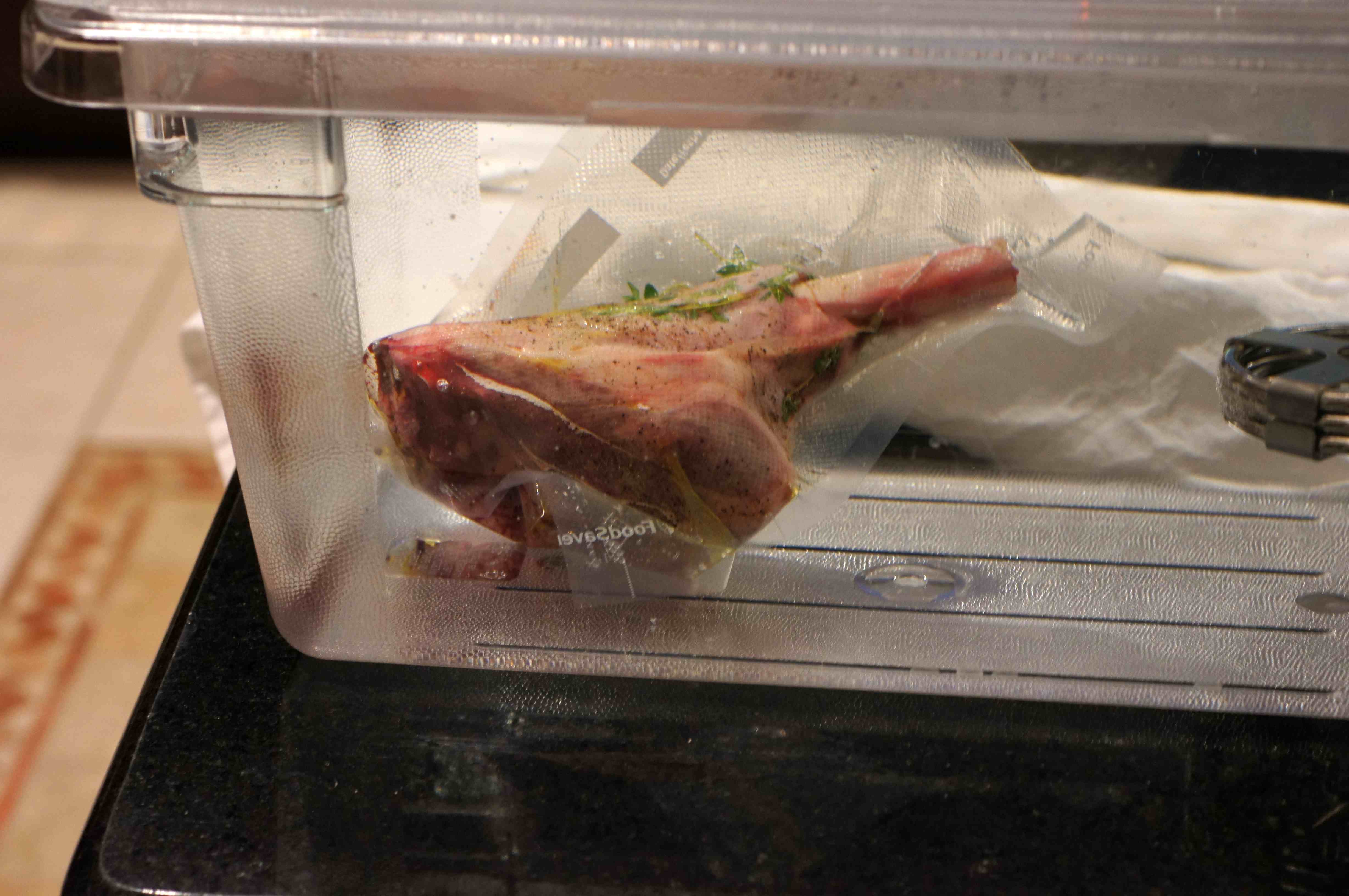 I have had a lonely little lamb shank in my freezer for about 6 weeks. You see, I love lamb shanks. I love osso bucco done with lamb shanks but, then again, I love osso bucco. We have a little Italian Restaurant (Paesano’s Ristorante) near the house that has traditional osso bucco with veal shanks as the specialty of the house. While they have other really good food items on the menu, I always order the osso bucco. Slowly braised veal shanks in vegetables with wine and tomatoes. It is absolutely sublime. You have a rich, meaty unctuousness from the bone marrow which is perfectly balanced with the wine and tomato, topped with a little gremolata. Absolutely heavenly. I’m getting really hungry just typing this and I digress. I actually bought the lamb shank to make osso bucco but there was only one. It takes roughly 4 hours to braise the shank and make the dish and if you’re going to make one, you might as well make 2 – 4. The problem is Baby Lady doesn’t like lamb. I was going to make it when Knothead came down for his 22nd birthday but he wanted rack of lamb, instead. So, there I sat with 1 lonely little lamb shank. 😦 Then I visited Stefan Boer’s Blog, Stefan’s Gourmet Blog. Lo and behold, there it was – a post for lamb shanks sous vide. Now Stefan is really into sous vide. If you want to learn sous vide techniques, go check out his blog. He has also been asking me when I was going to do more sous vide posts. Also, Mimi Rippee of Chef Mimi’s Blog is into sous vide and has been posting several sous vide posts. So, I have been wanting to pull out my sous vide unit and make something. This was the perfect chance and this is what I did.
