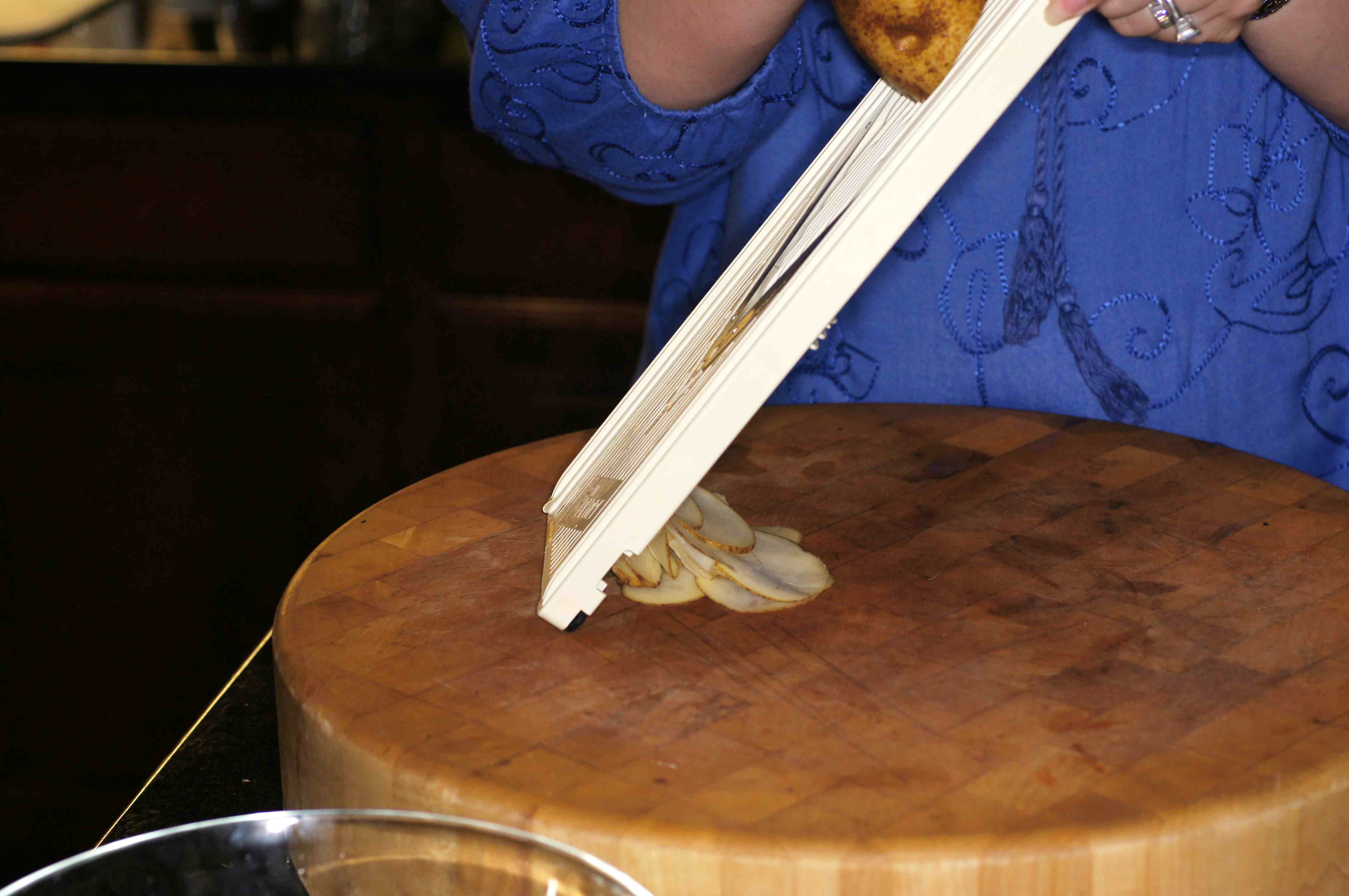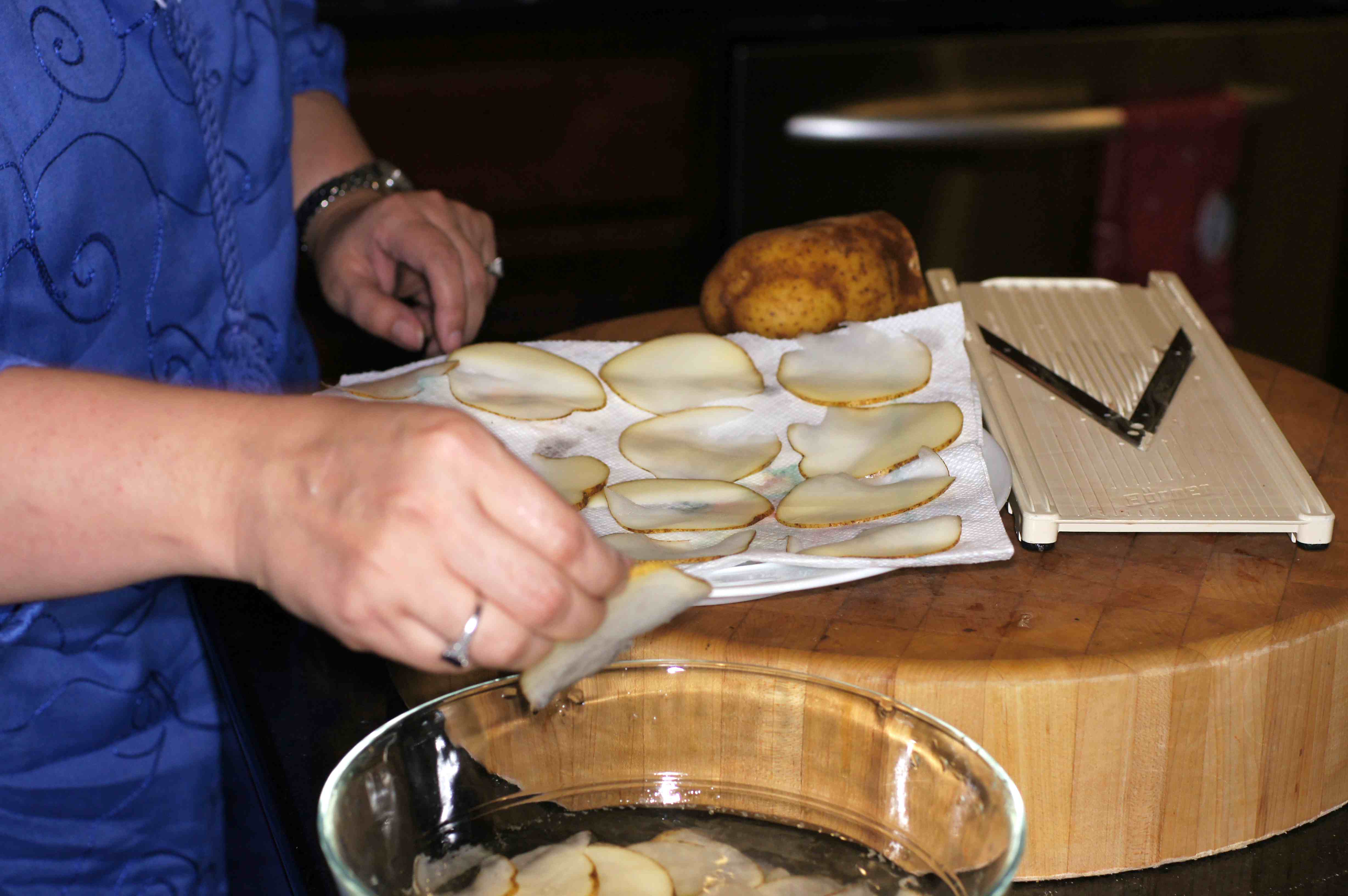 Using a mandoline, slice the potato very thinly, roughly 1/8 inch thick.