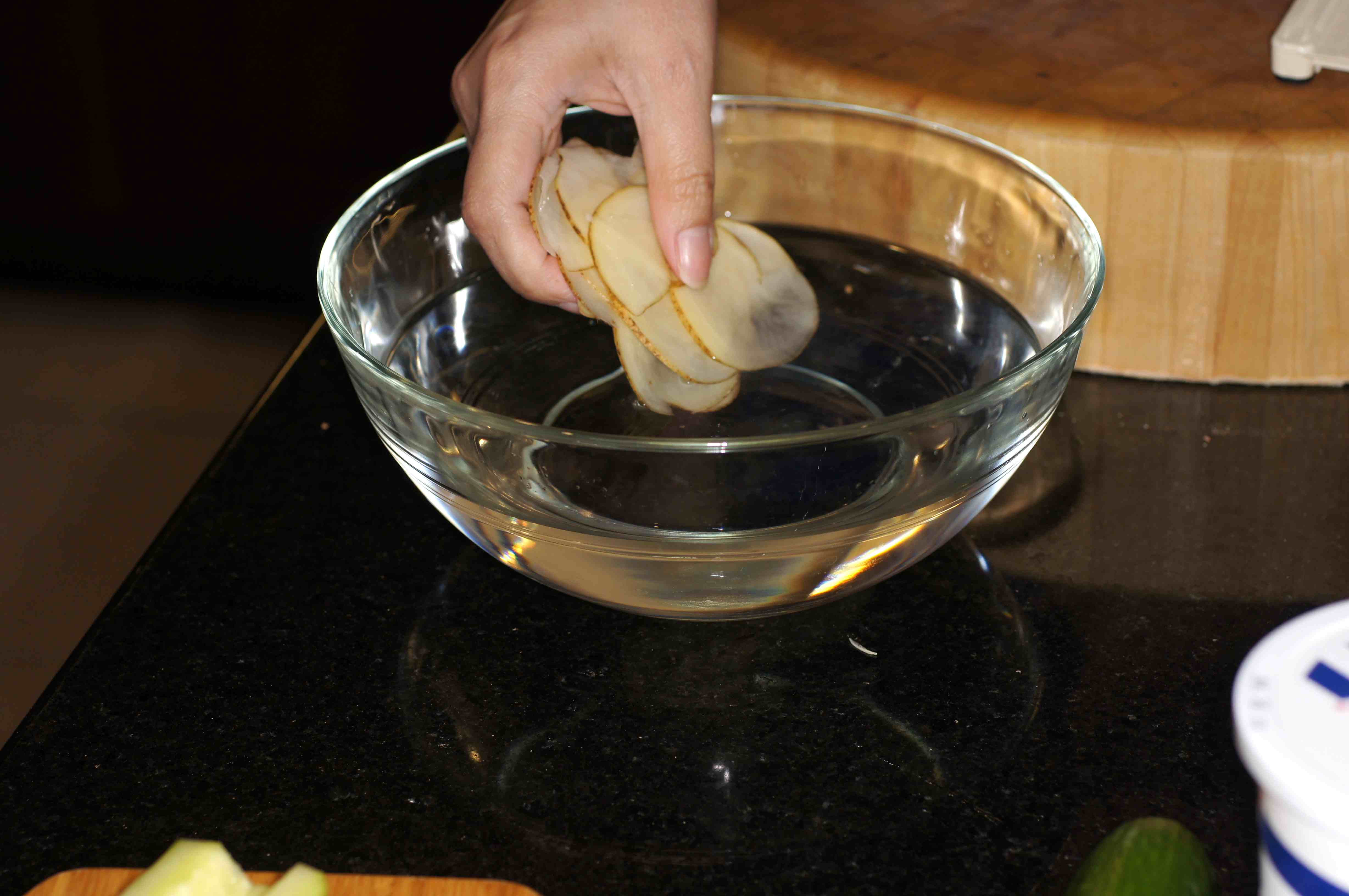 Put the potato slices in a bowl of water to remove excess starch and keep them from oxidizing.