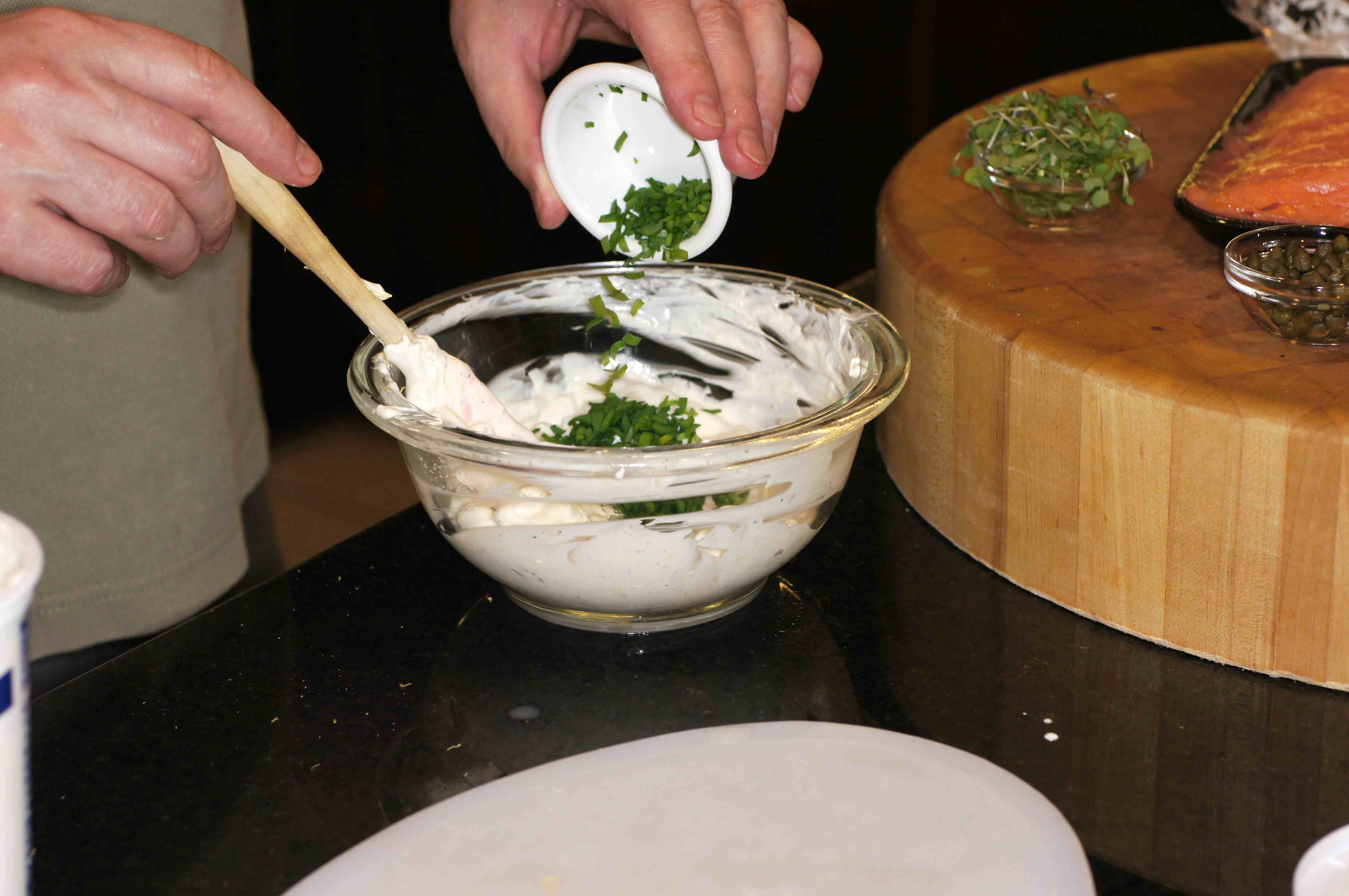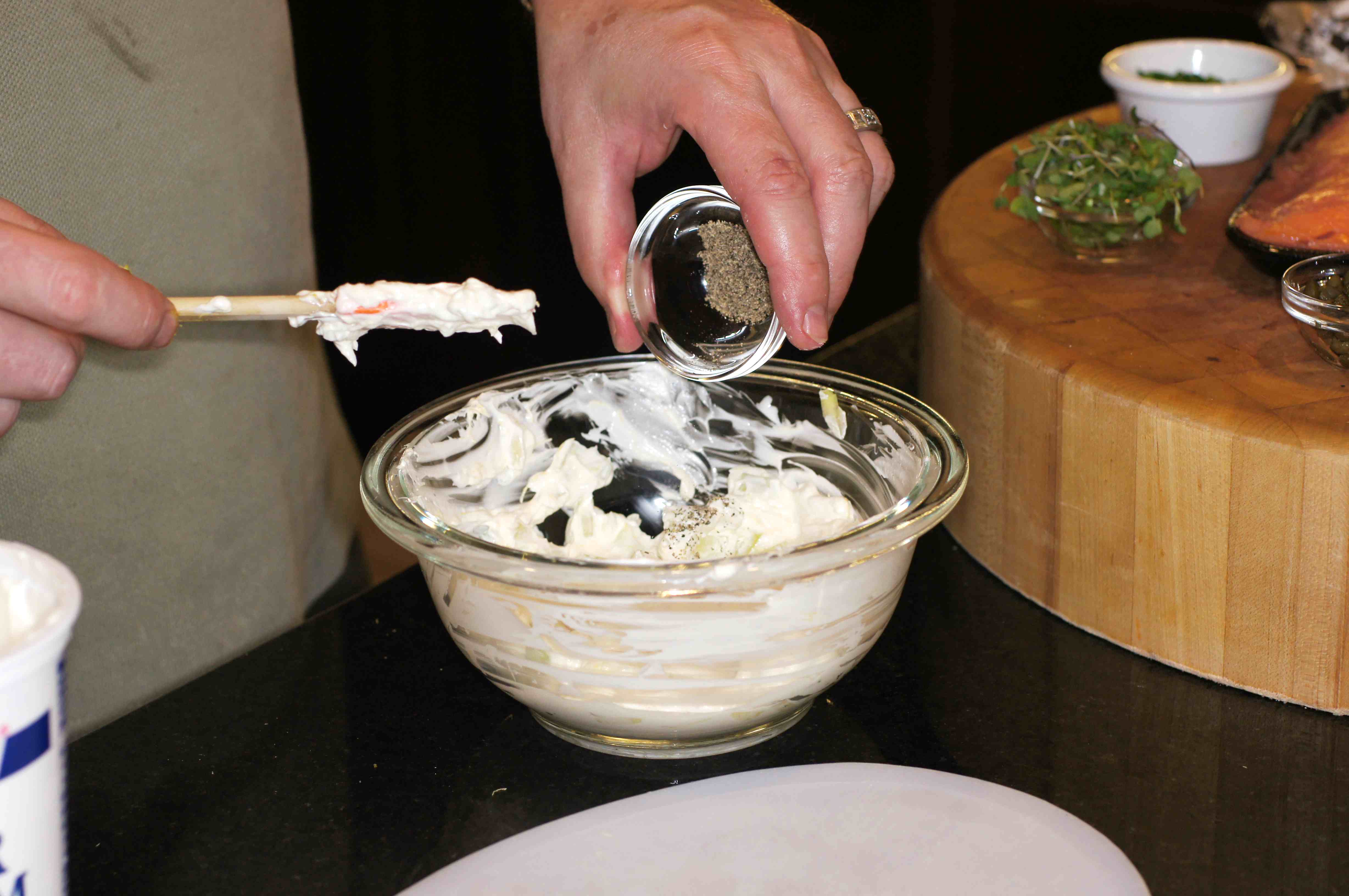 Next, put a layer of the sour cream/goat cheese filling on top of the salmon, roughly 2 Tbsp.