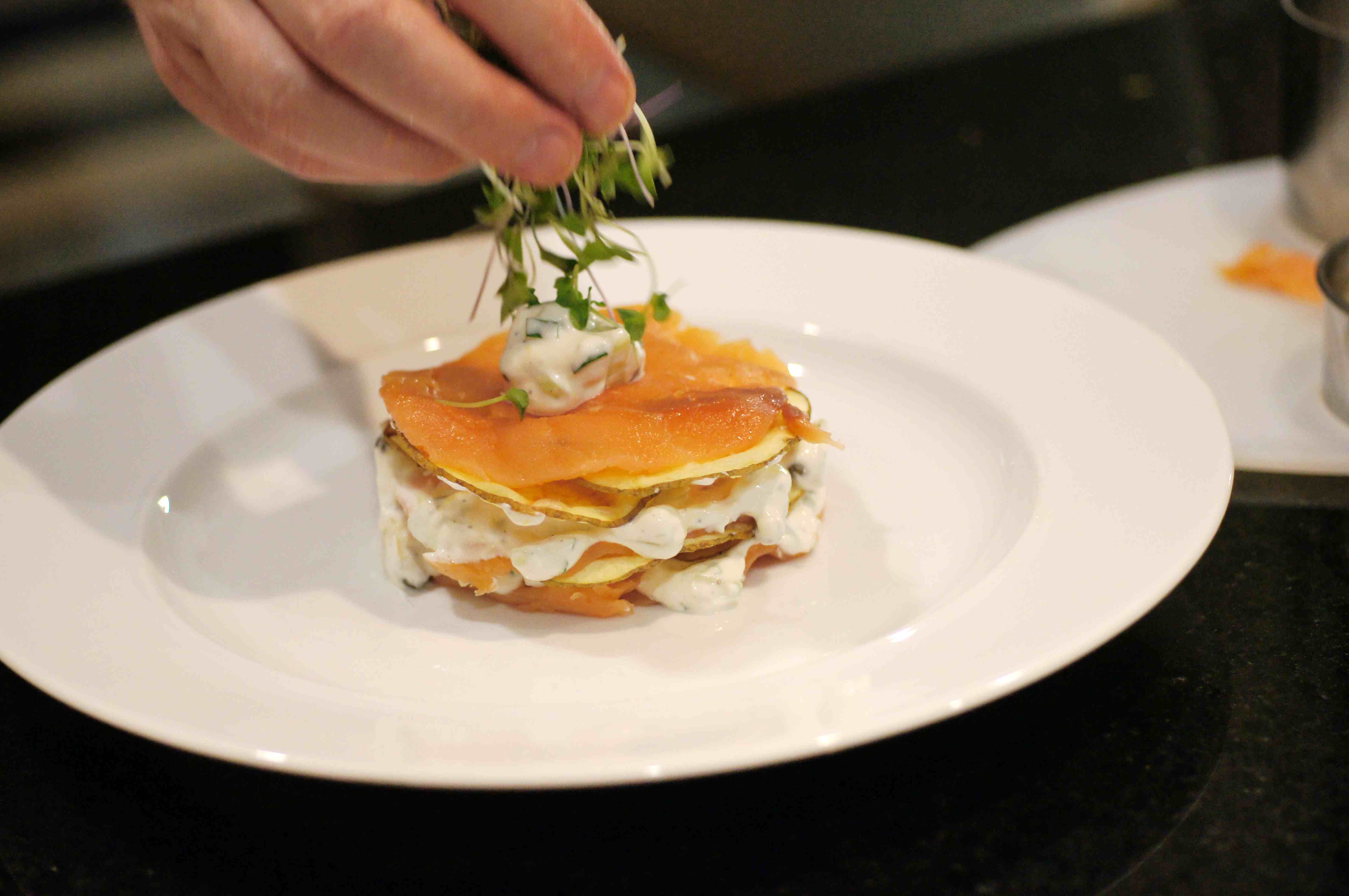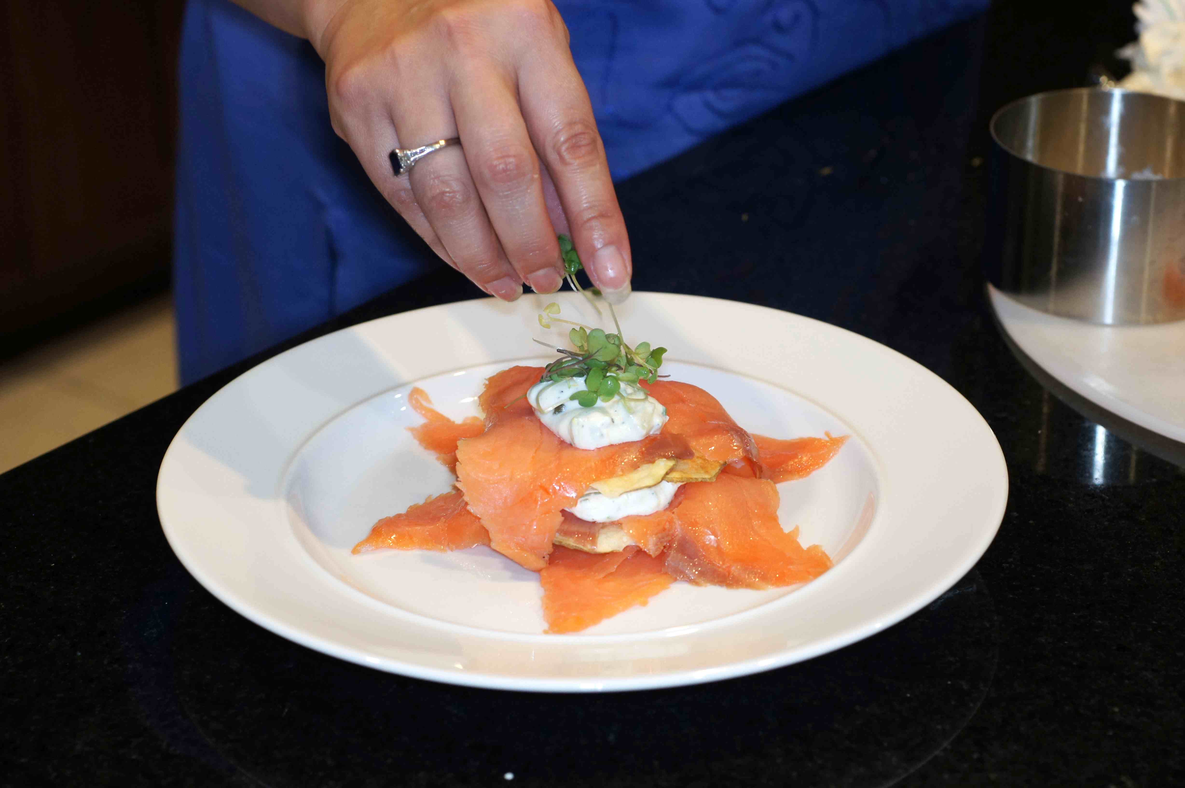 Repeat the process 2 more times to make 3 complete layers with another layer of salmon on top; however, cross the salmon to make a star in your final presentation.
