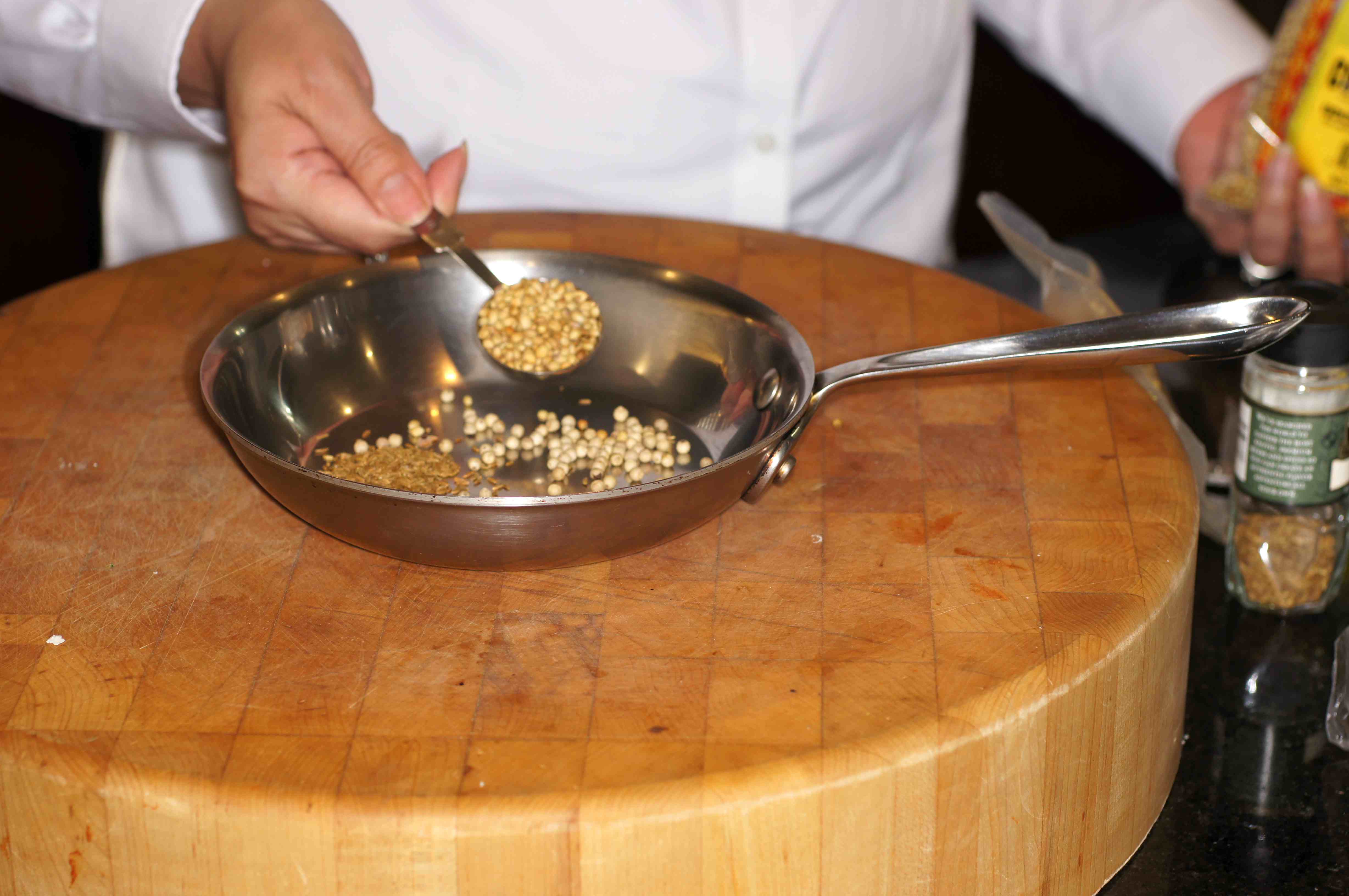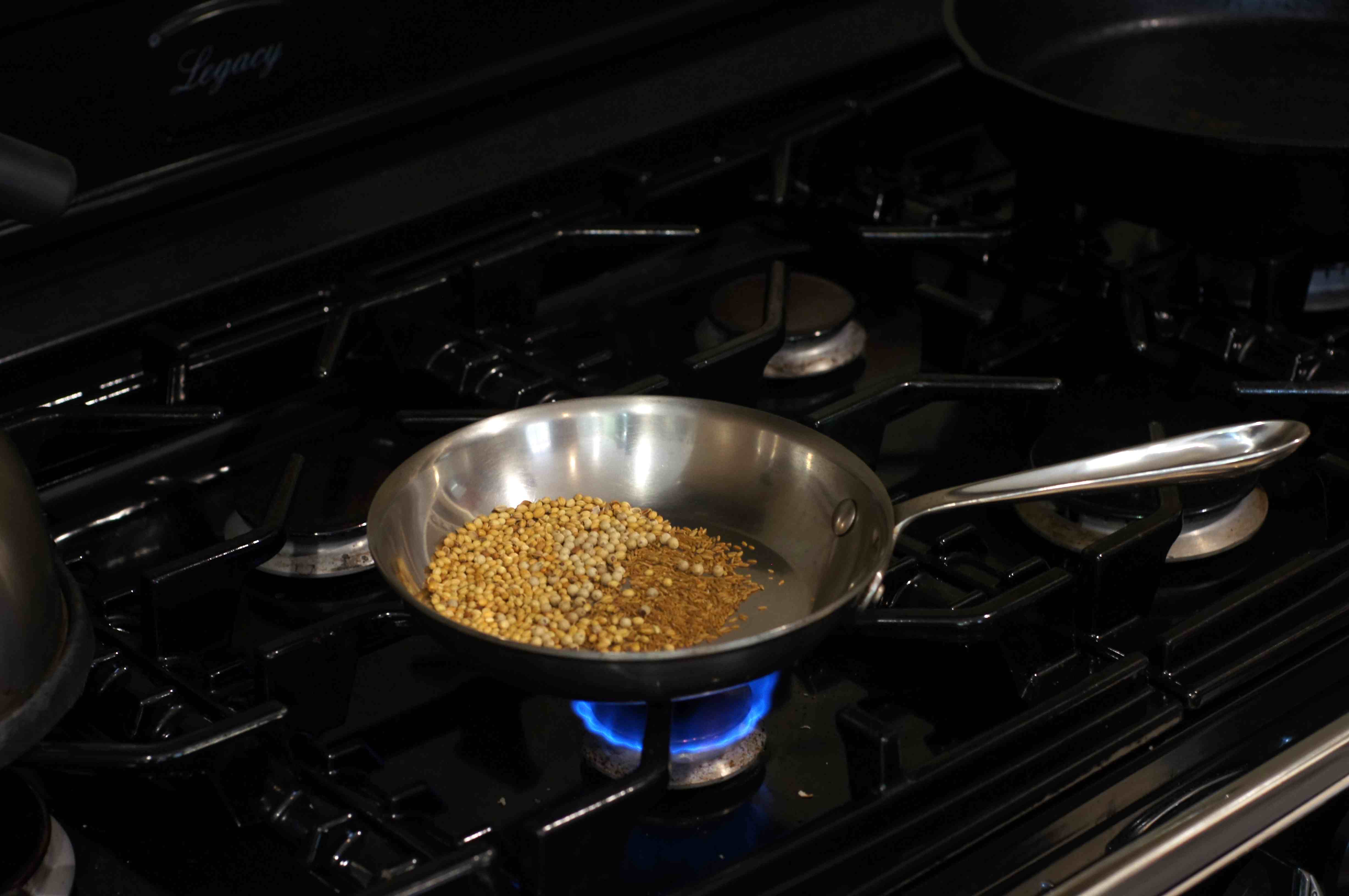 First things first, add coriander, cumin and coriander seeds to a sauté pan.
