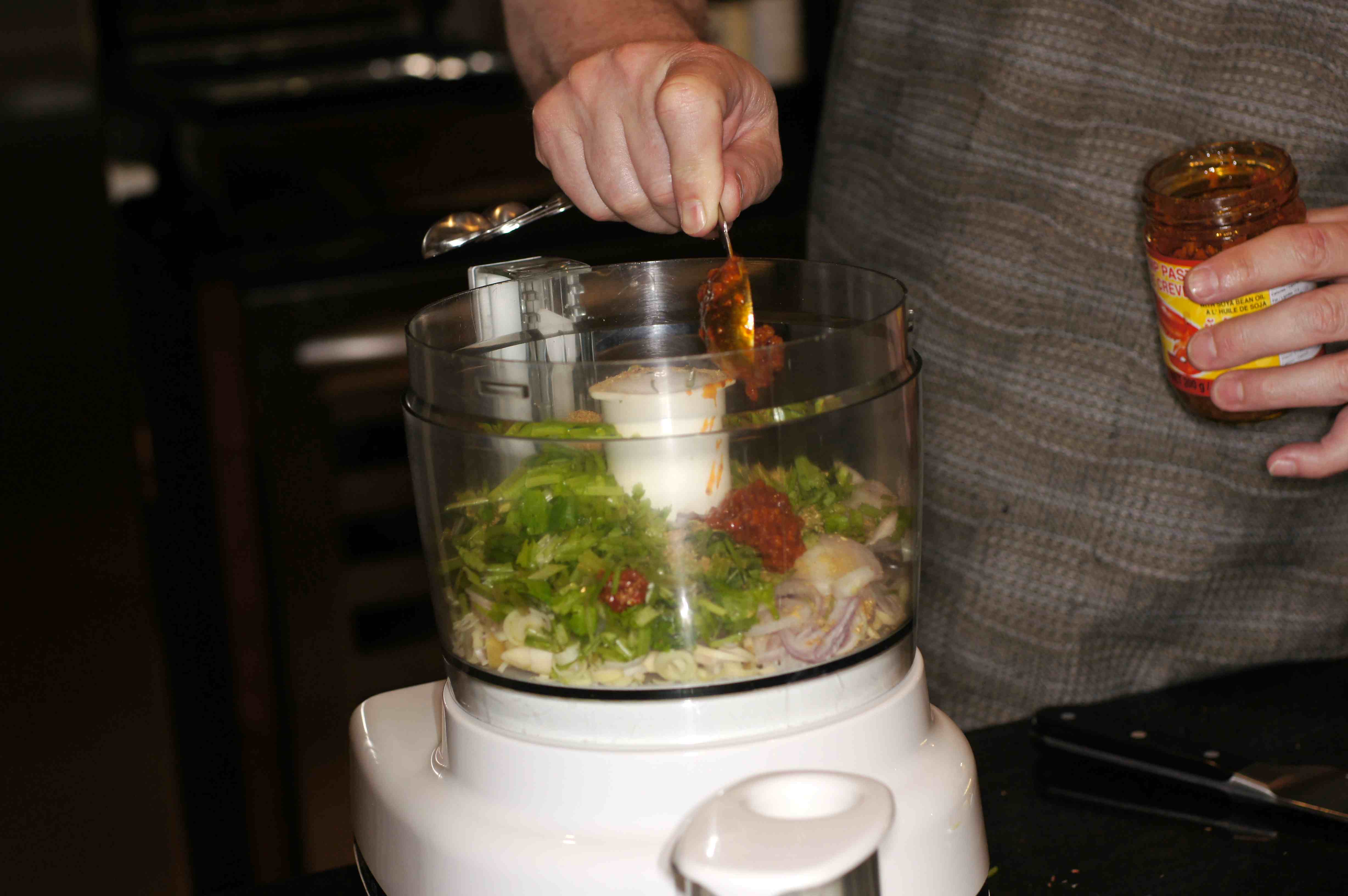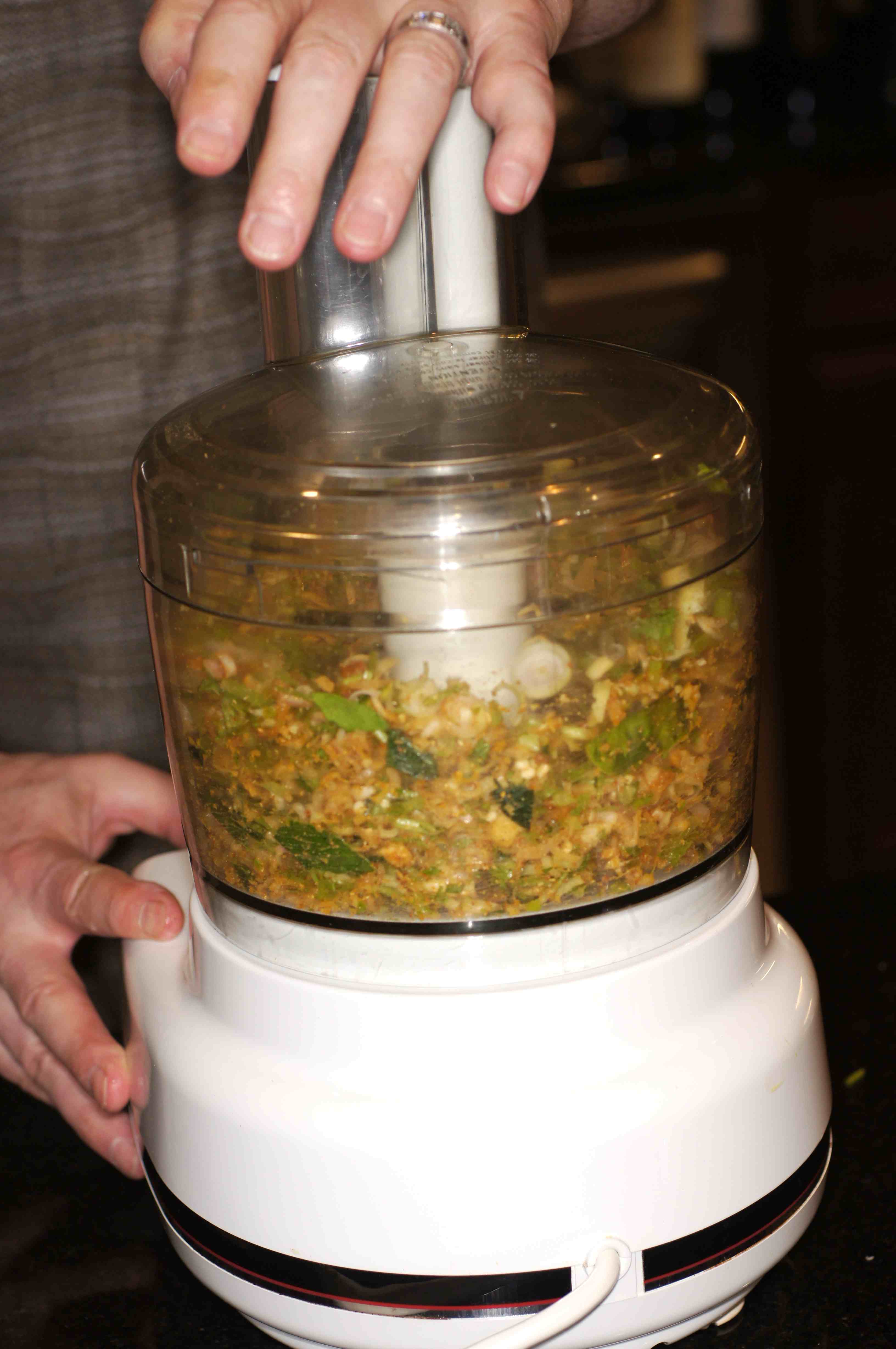 You can make this with a mortar and pestle slowly and painstakingly pounding all of the ingredients into a paste. I have done this previously and it is a lot of work. No longer trying to be muscular, I am very comfortably lazy in my later years and use a food processor, whiz, whiz. Much quicker and easier. 🙂 If you want to do this in a mortar and pestle, starting with the garlic, add each ingredient to the mortar one at a time, pound each ingredient as it is added until the final textured paste is formed. This takes a while so you might as well have a Snickers before you start. 😉