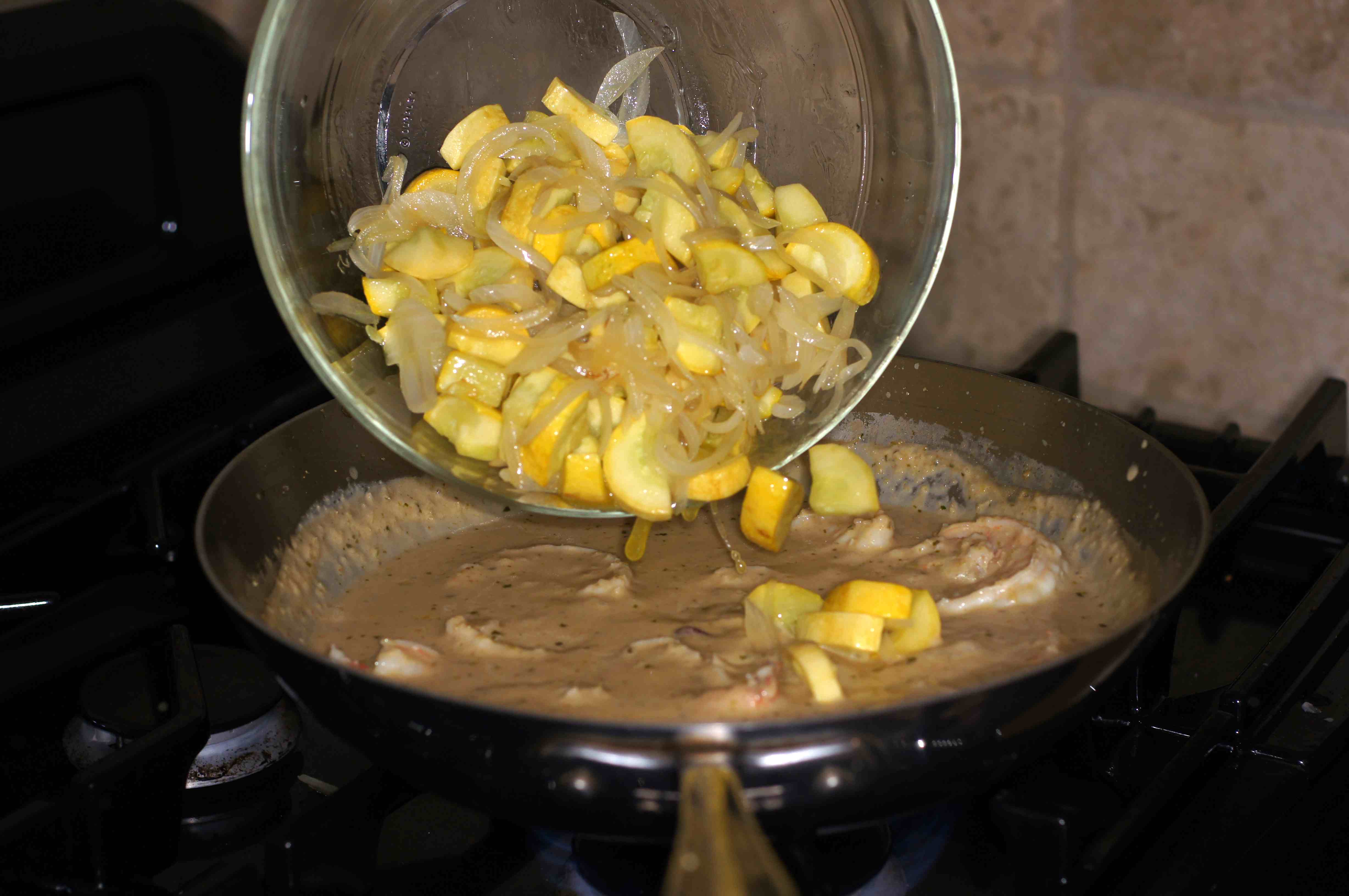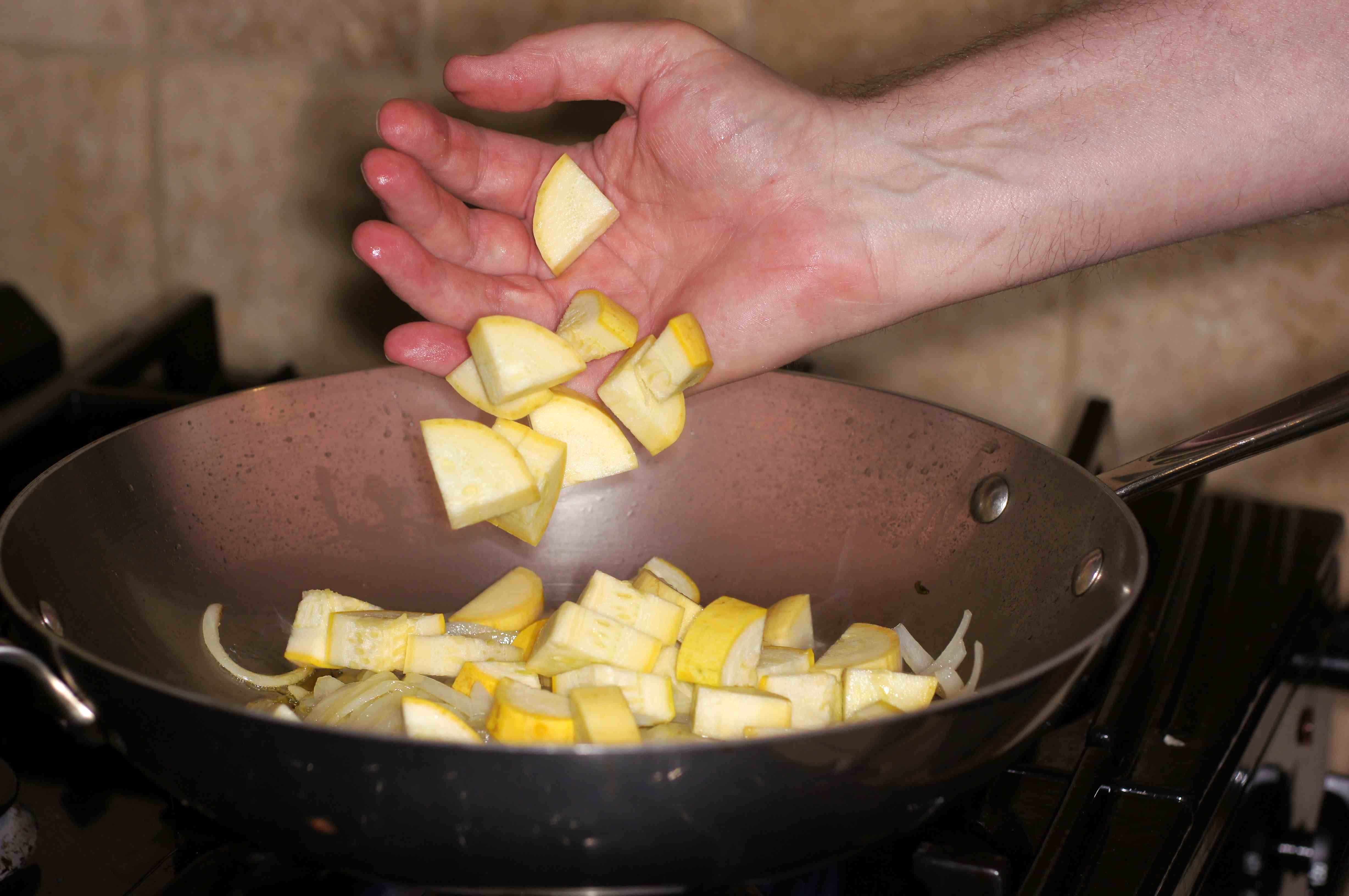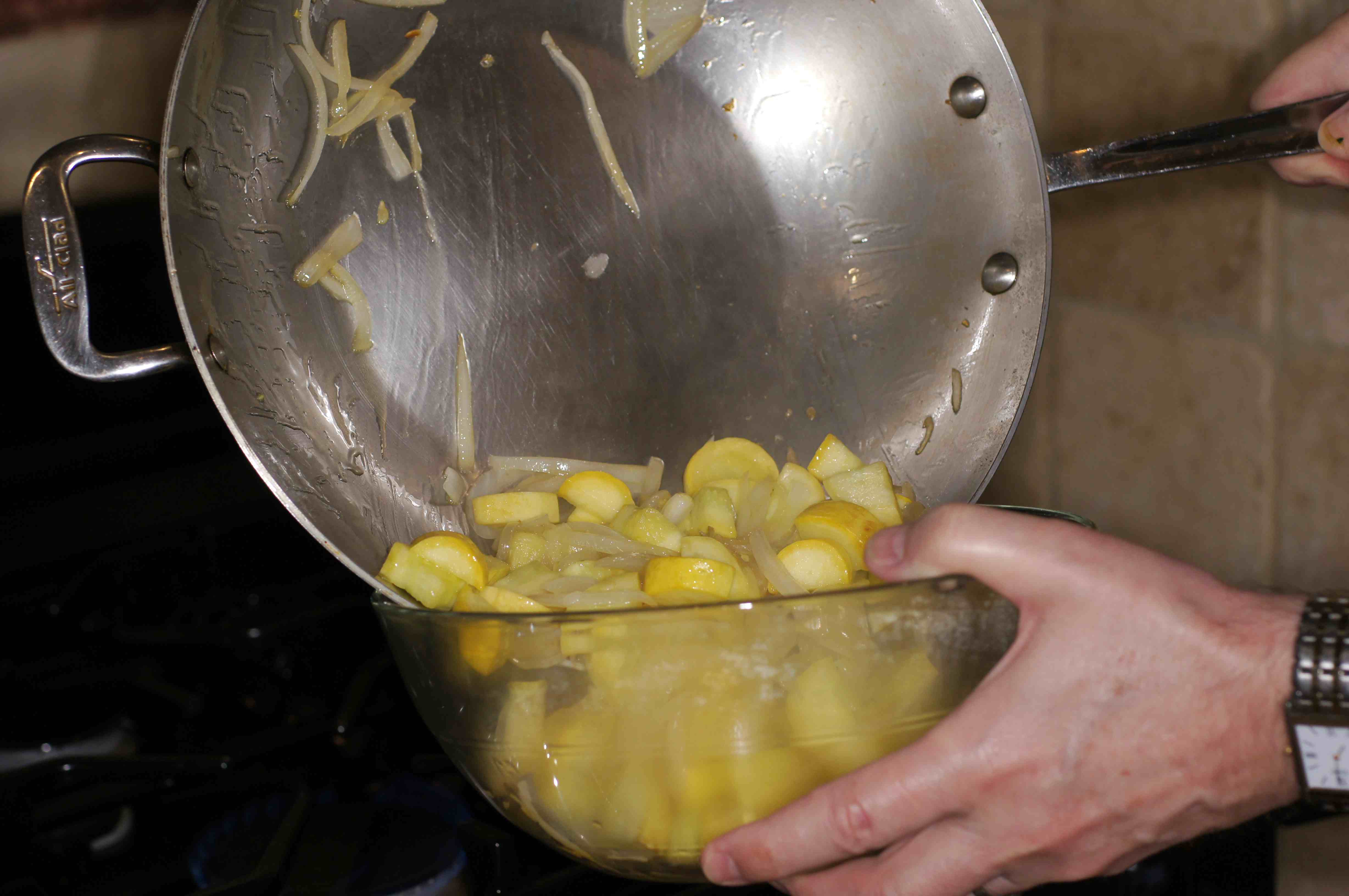 and stir-fry until the squash begins to brown, roughly 5 to 7 minutes. Then, transfer the onions and squash to a bowl to hold until almost ready to serve.