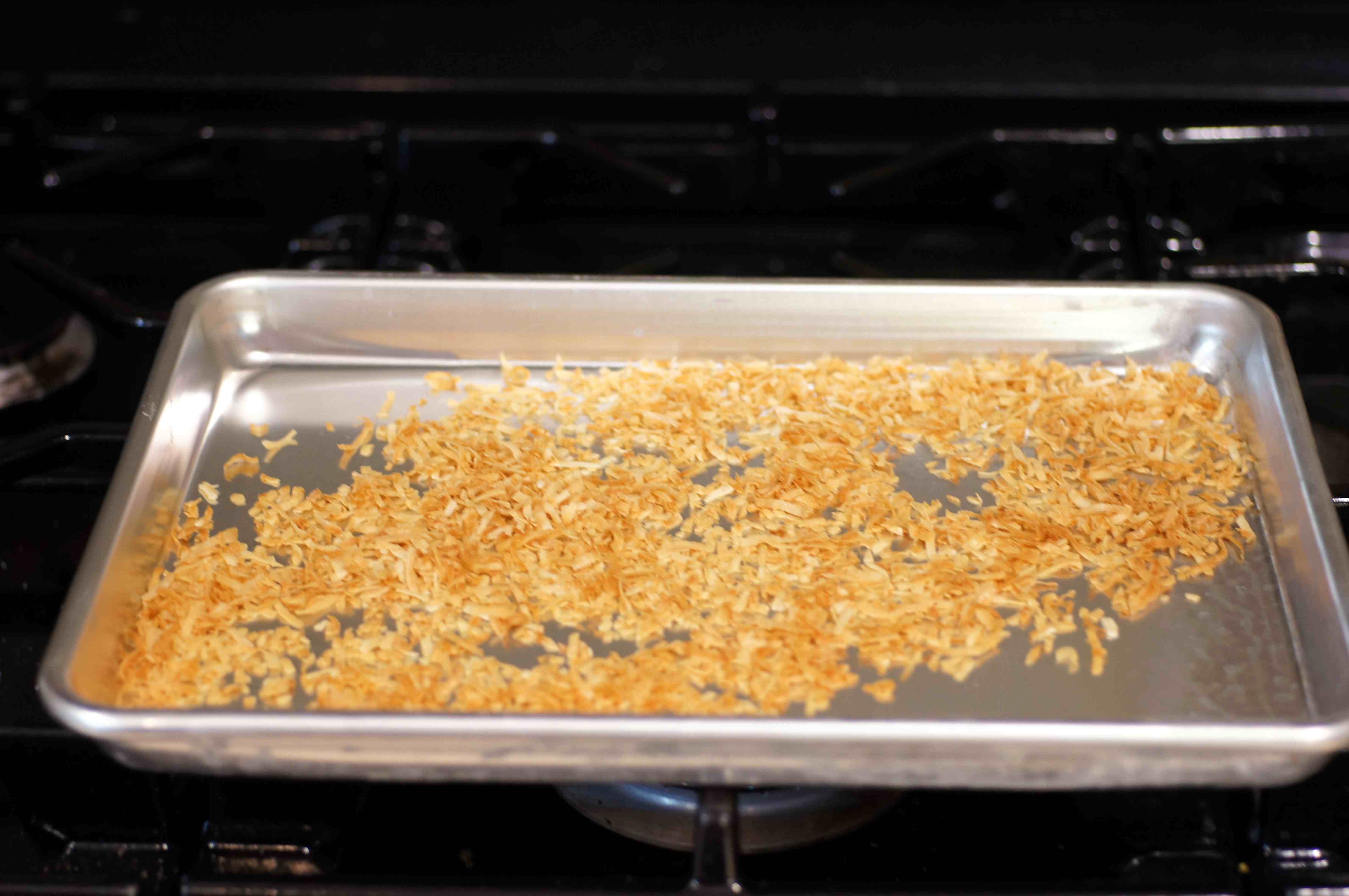 First things first, pour the unsweetened coconut onto a sheet pan and place in a 350 F oven to lightly toast the coconut to a nice golden color.