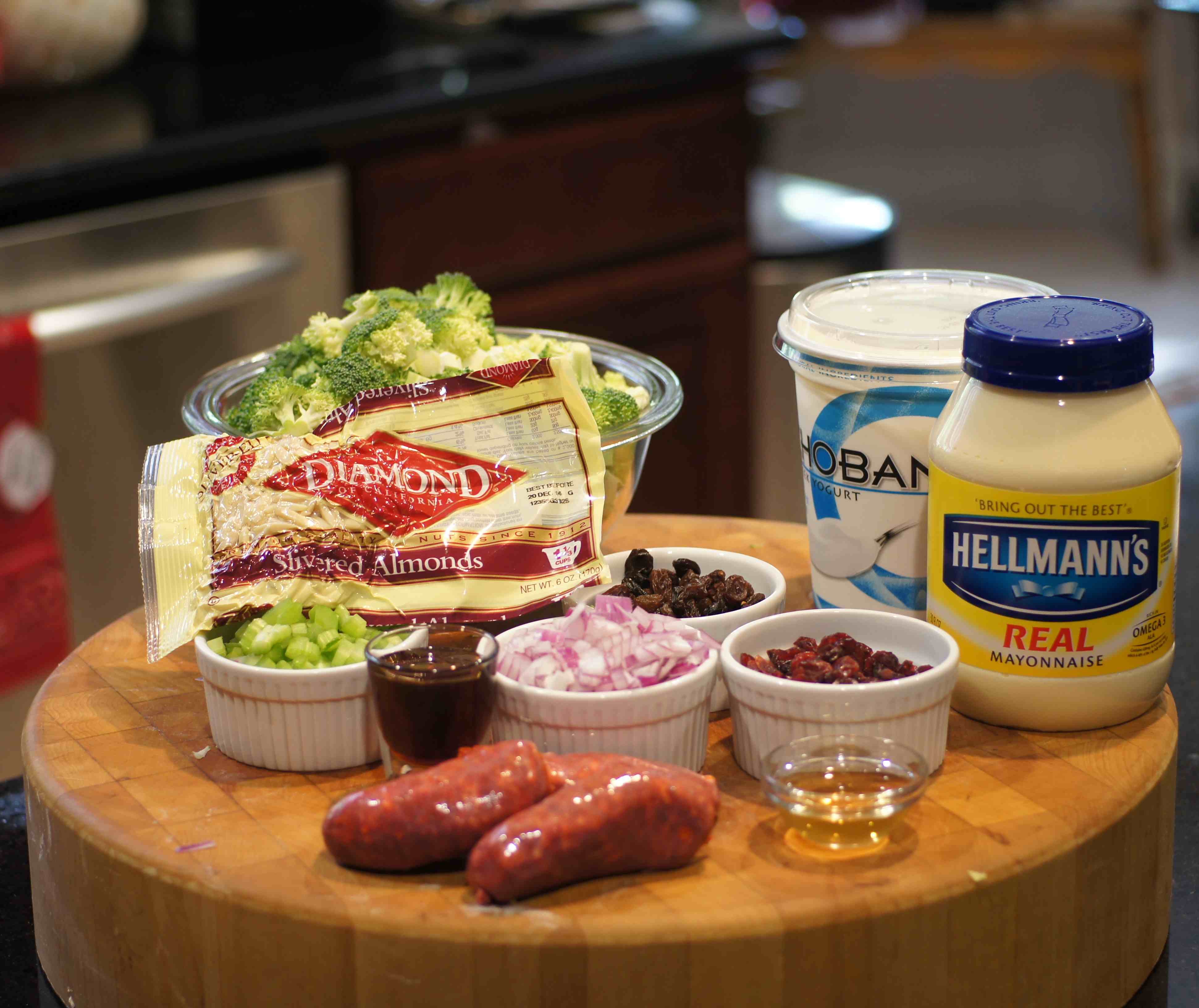 Now, broccoli salad isn’t something new or unique. In fact, if you go to Google and type in “Broccoli Salad” you will get 902,000 hits. There are broccoli salads with vinaigrettes; broccoli salads with sour cream dressings; broccoli salads with mayonnaise based dressings. Some people blanch the broccoli; whereas, others do not. The differences go on and on. Like other foods, it’s really quite intriguing seeing the different permutations on broccoli salad. Our version of broccoli salad has its own twists. It’s a mayonnaise and yogurt based dressing with dried cherries, chorizo and almonds. It’s loaded with flavor, slightly sweet yet savory and crunchy from the florets and toasted almonds. When I told Baby Lady I was using chorizo in the salad she thought I lost my mind. Very politely she didn’t say anything believing she truly would not like it but not wanting to offend me she would eat it anyway. Boy was she surprised at the wonderful flavors imparted into the salad from the chorizo. This is a wonderful salad you owe it to yourself to make. Ask the Baby Lady and she’ll tell you the same. 😉 Here is what we did.