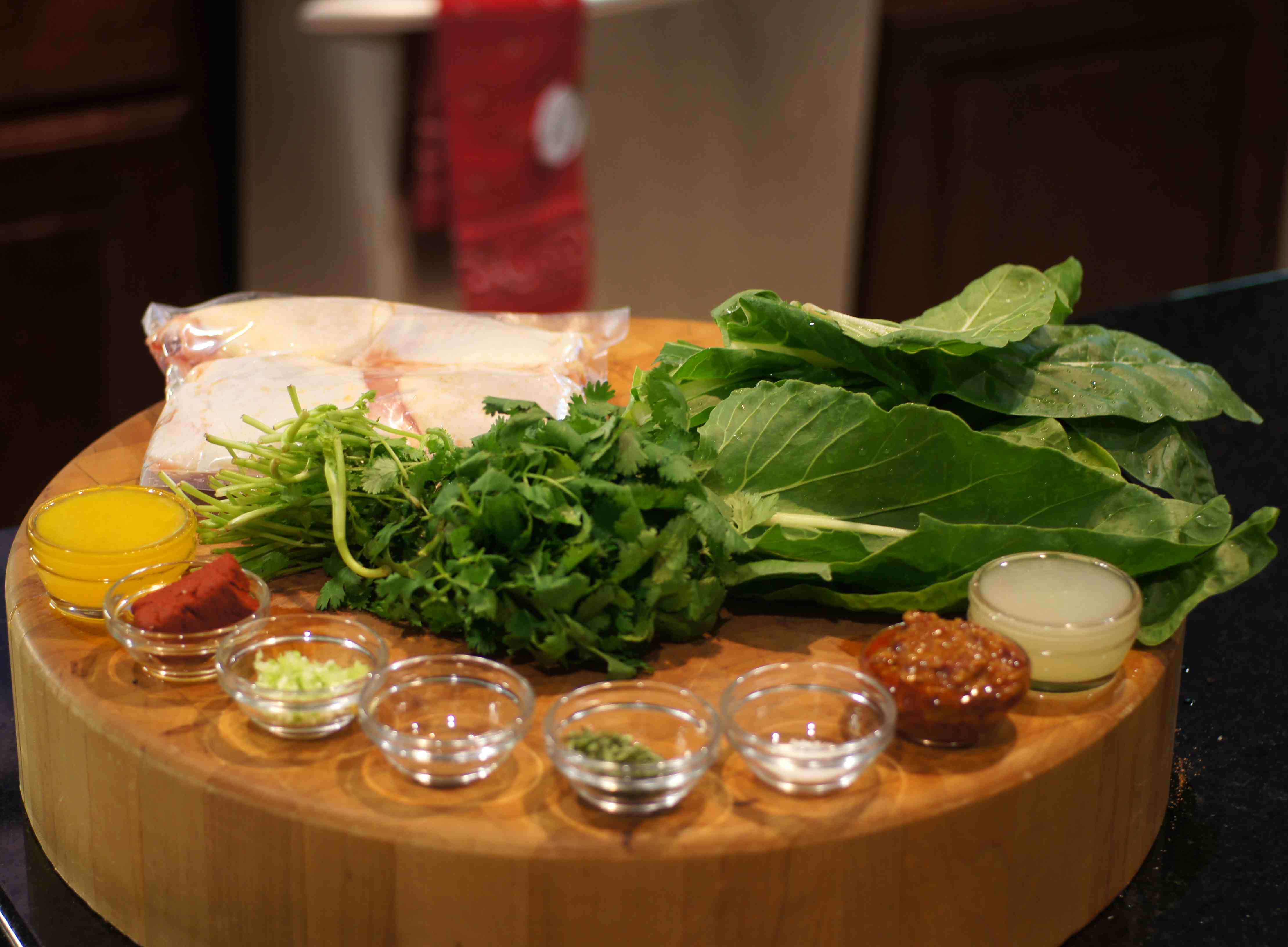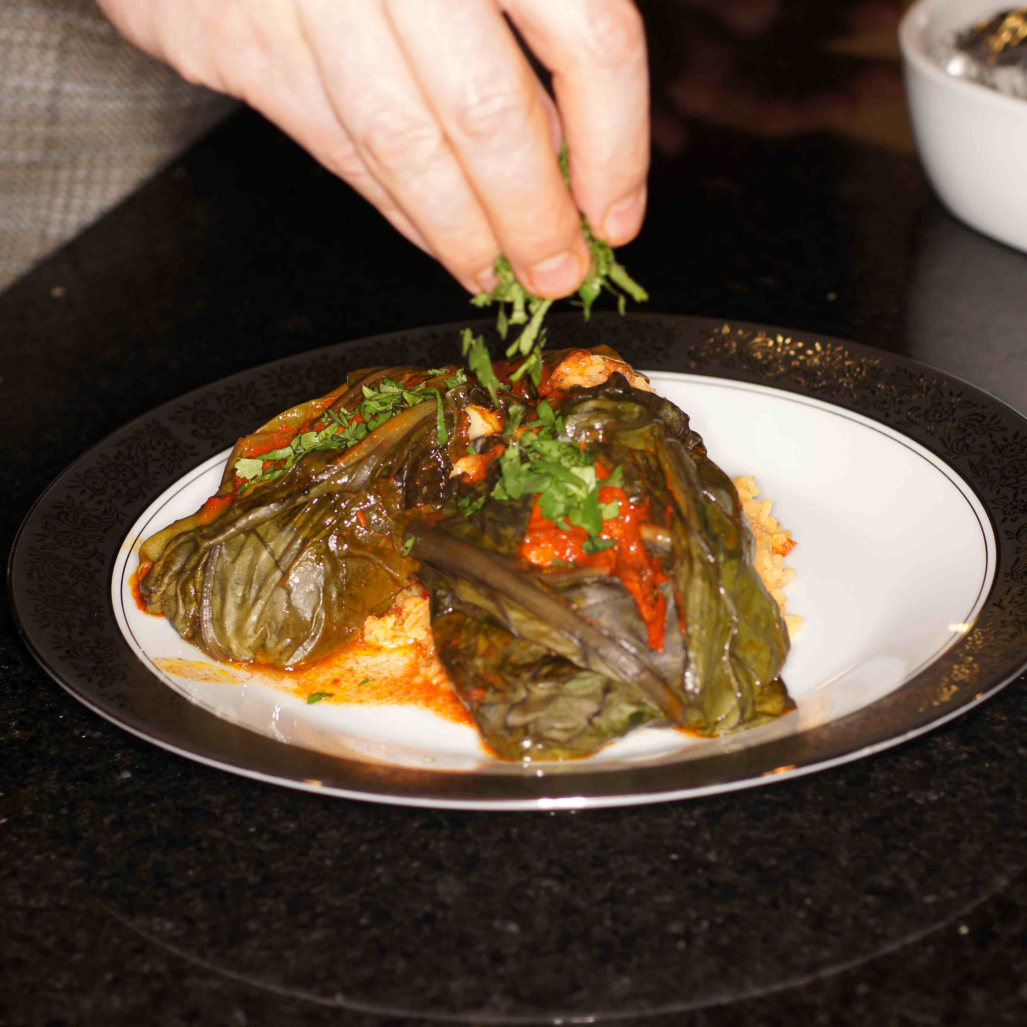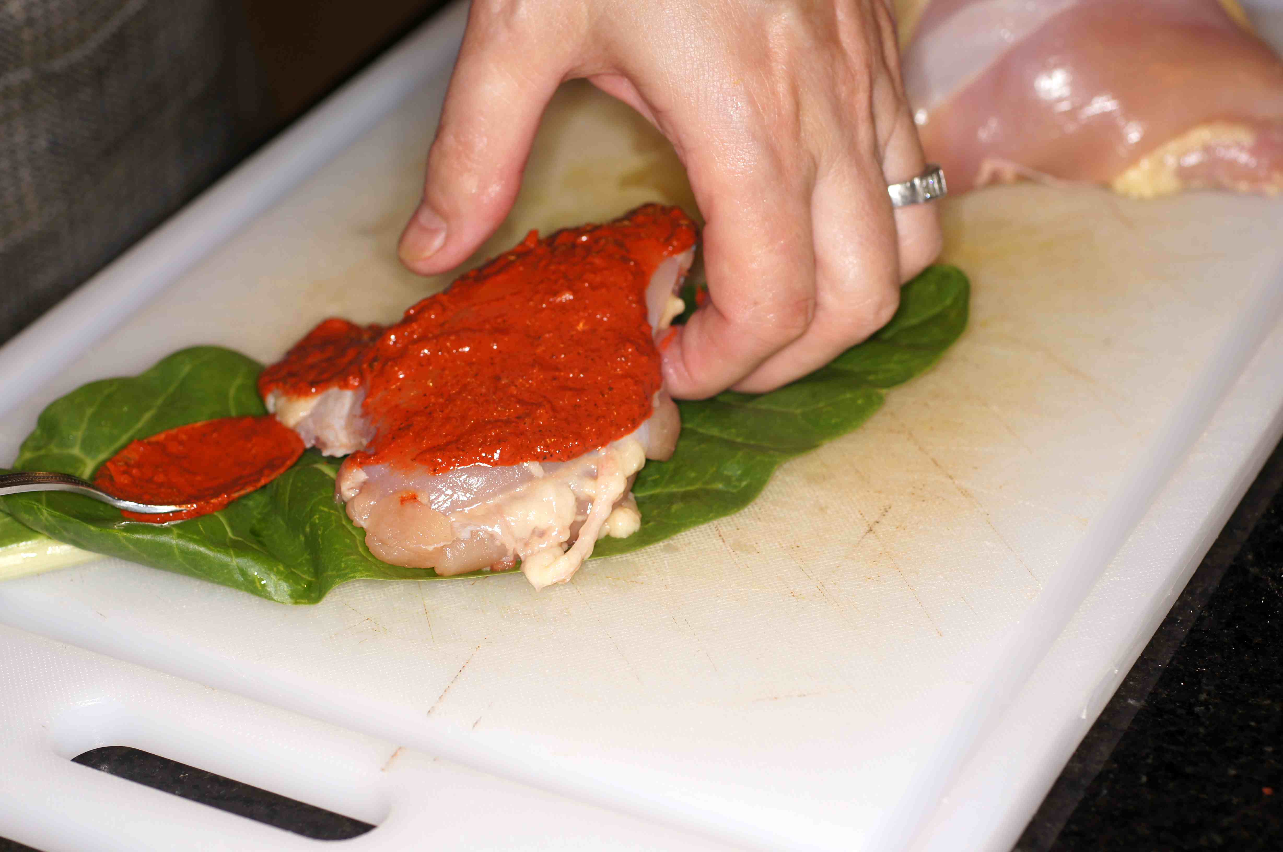 Get a swiss chard leaf and lay a thicken thigh on top of the leaf. Slather the chicken thigh with the paste.