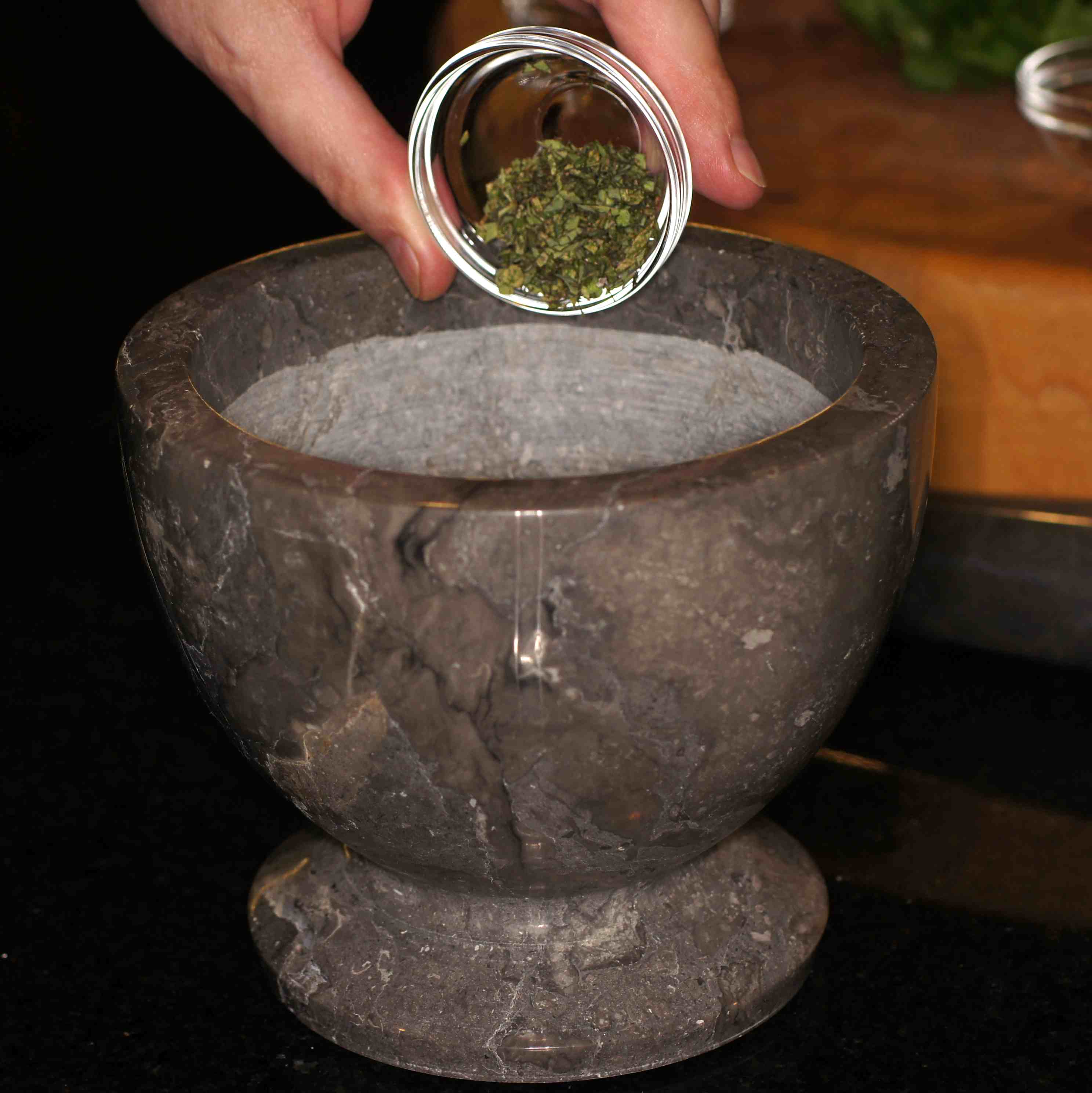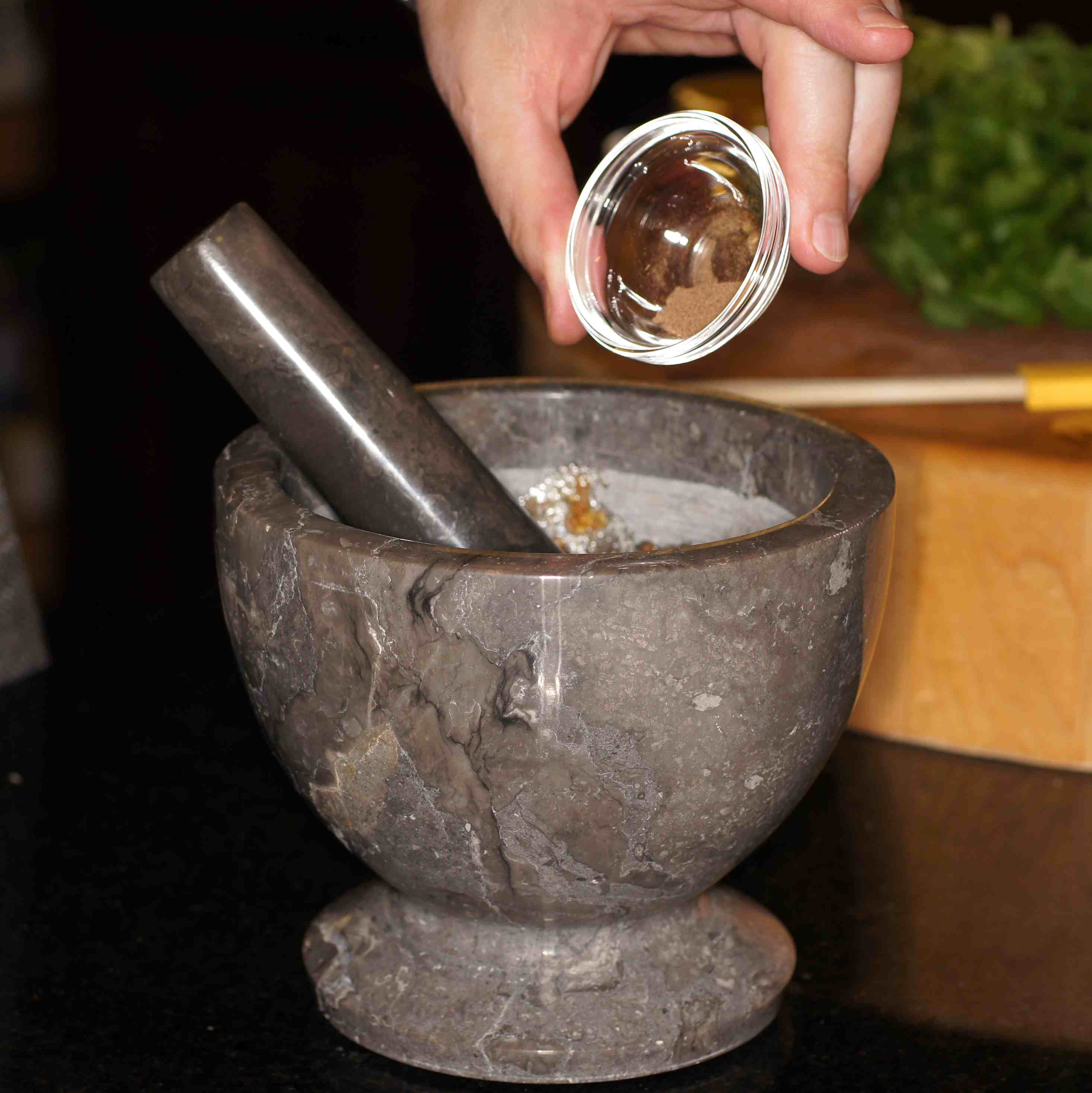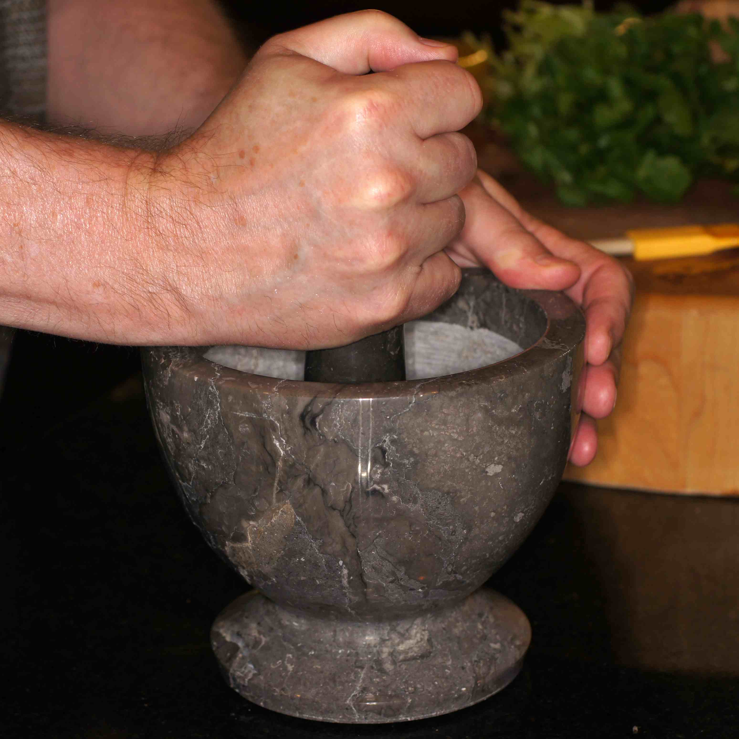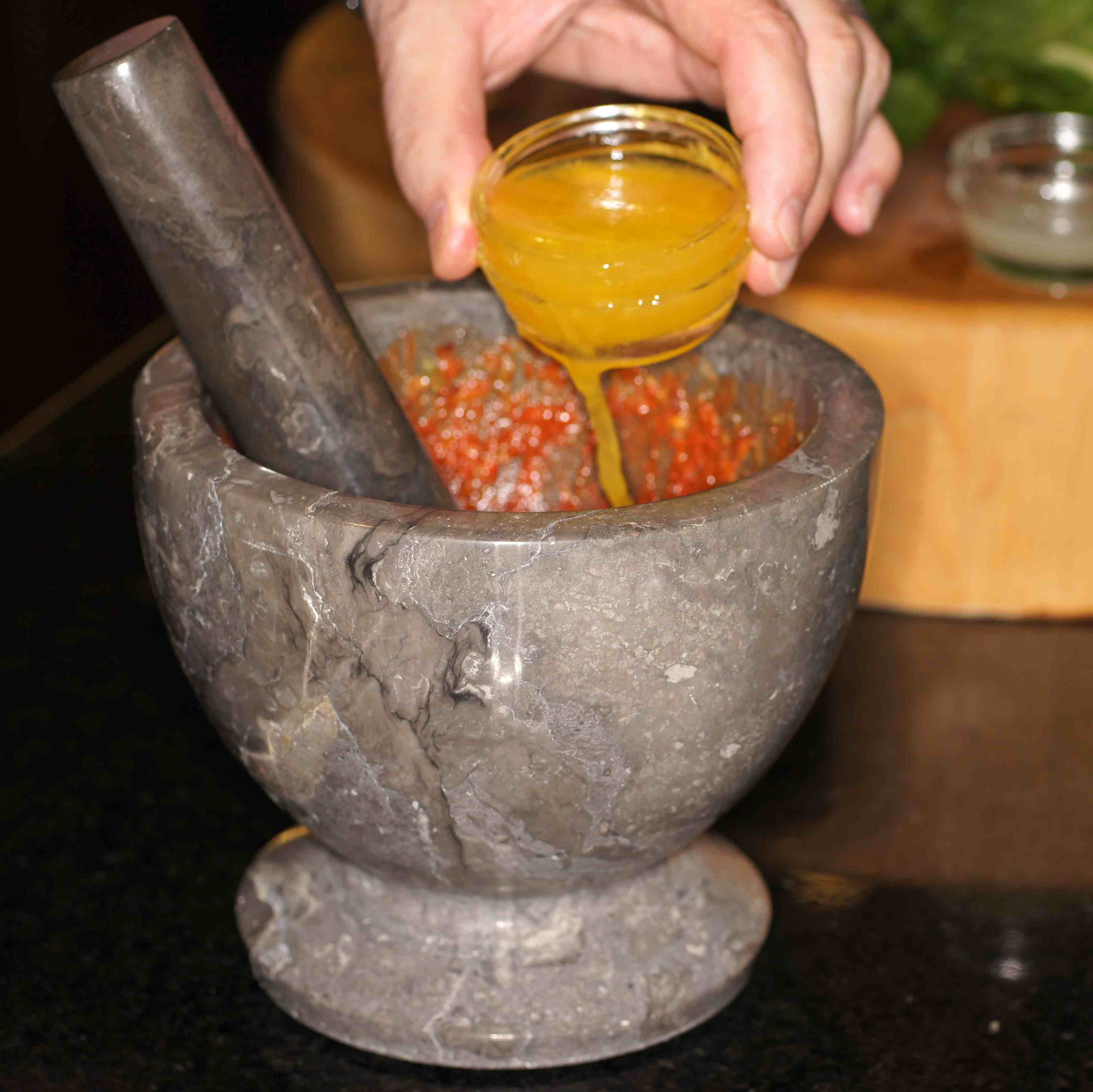 Again, using the pestle, pound and stir to incorporate the juices and make a smooth, thinner paste.
