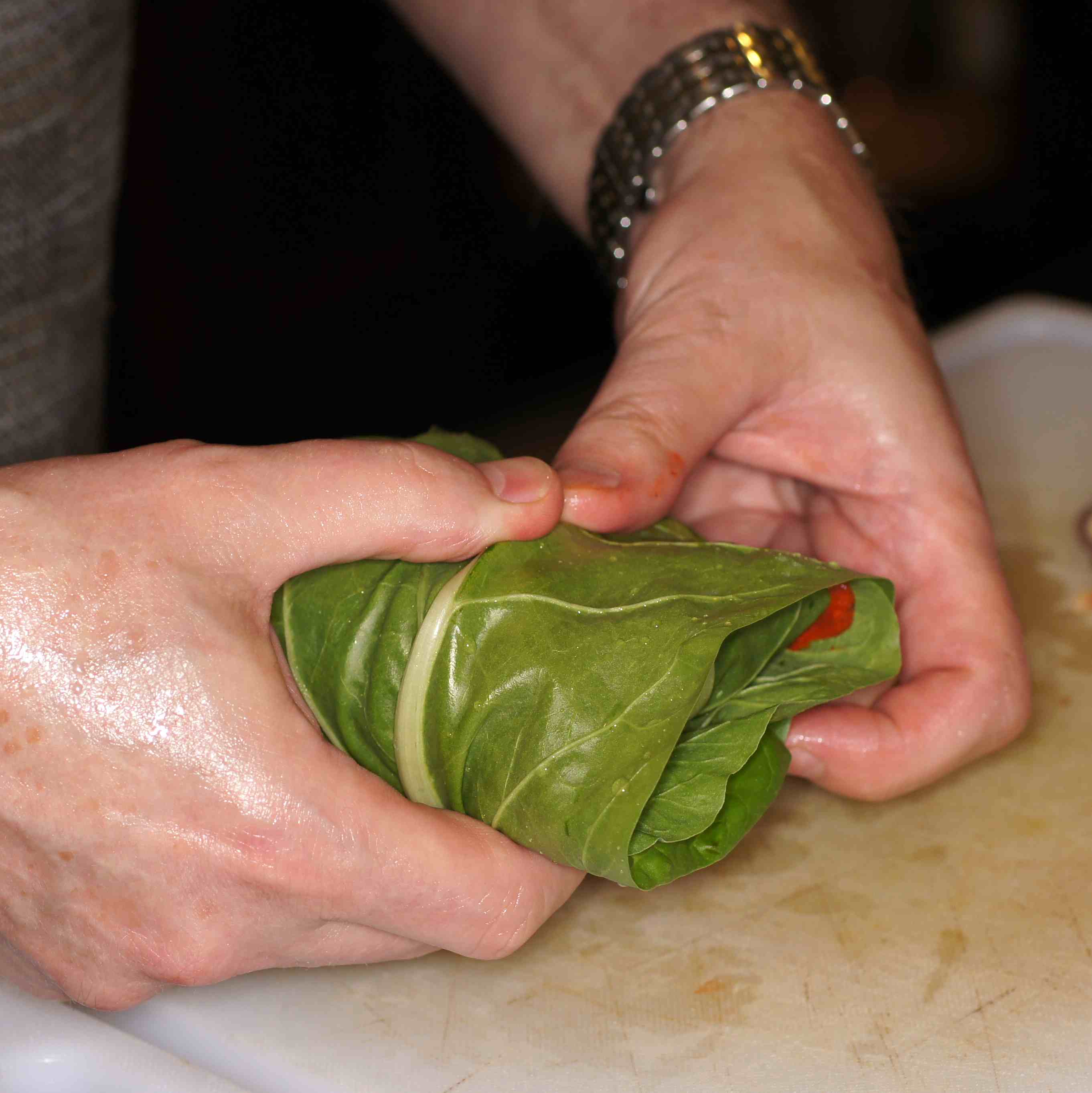 Get two swiss chard leaves and wrap chicken thigh again but this time crosswise to form a packet.