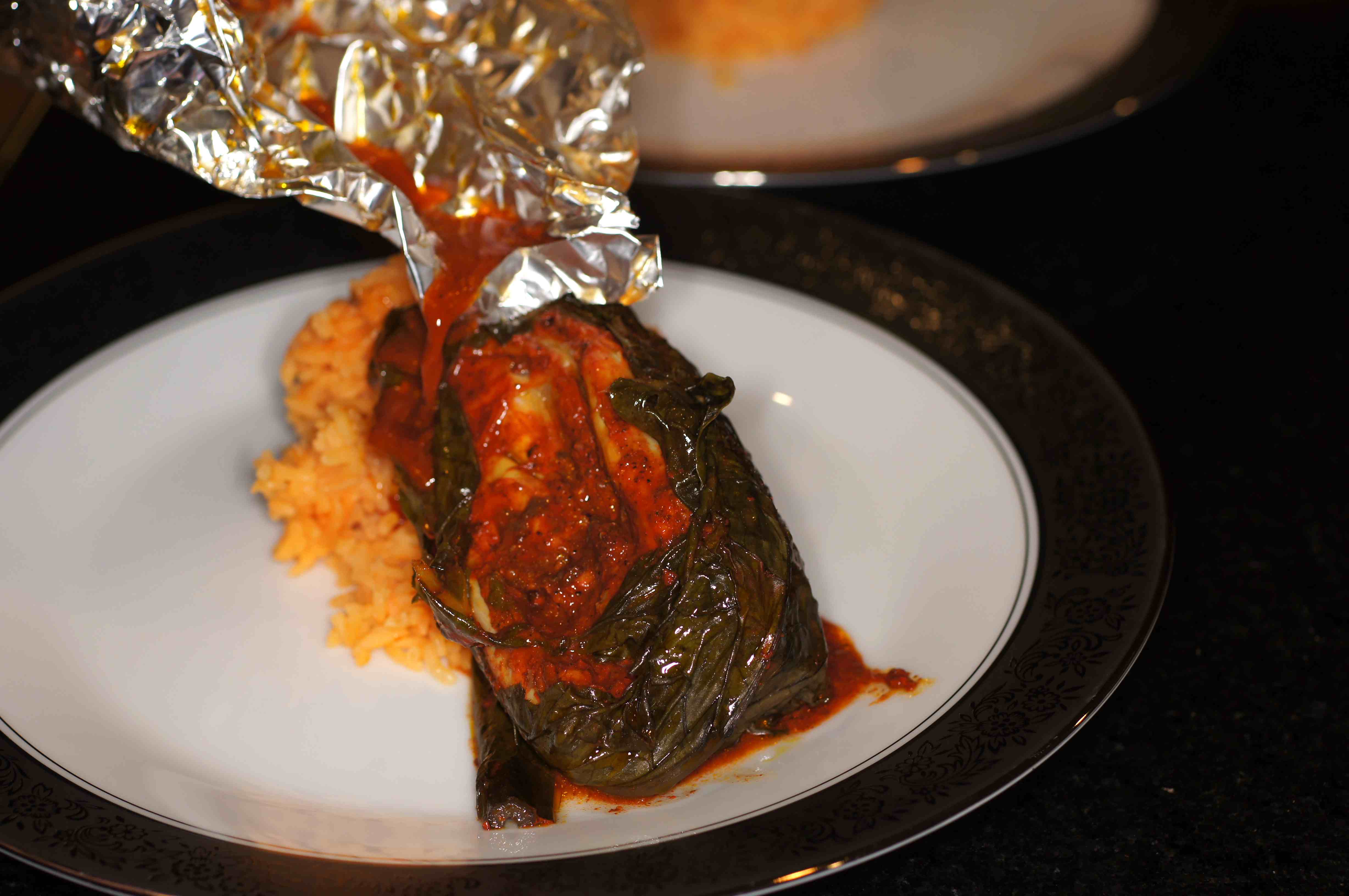 Necessity is the mother of invention, so they say. This is one of those meals that just came about. We were trying to figure out what we wanted for dinner with no real idea about what we wanted or felt like cooking. This typically entails going and looking at what is in the fridge and freezer. Then, standing in the pantry and staring at the various spices, condiments and whatnots we have available. Going back the fridge or freezer and selecting some protein to cook and back to the pantry again. Typically, once I start pulling things out Baby Lady will ask me what I’m fixing. At this point there is further discourse abut the meal and she gives me her thoughts and suggestions. The plan then forms and begins to take shape. In this instance, we had some chicken thighs in the freezer. We typically buy thighs because they are perfect for 2 people and we prefer the thighs anyway. We also still had some achiote paste our friend, Adriana, brought us from Mexico D.F., some leftover mojo de ajo in the fridge and beautiful fresh swiss chard in the garden. This was going to be a spin on the Cochinita Pibil (Achiote Slow Roasted Pork Shoulder Wrapped in Banana Leaf) we made previously. Instead of banana leaves, we were using the edible swiss chard, wrapping the delicious little packets in foil and baking them in the oven. We also wanted to use a little orange juice with the lime juice in the paste. The final product was absolutely delicious and loaded with flavor. We will definitely do this again sometime and this is what we did.