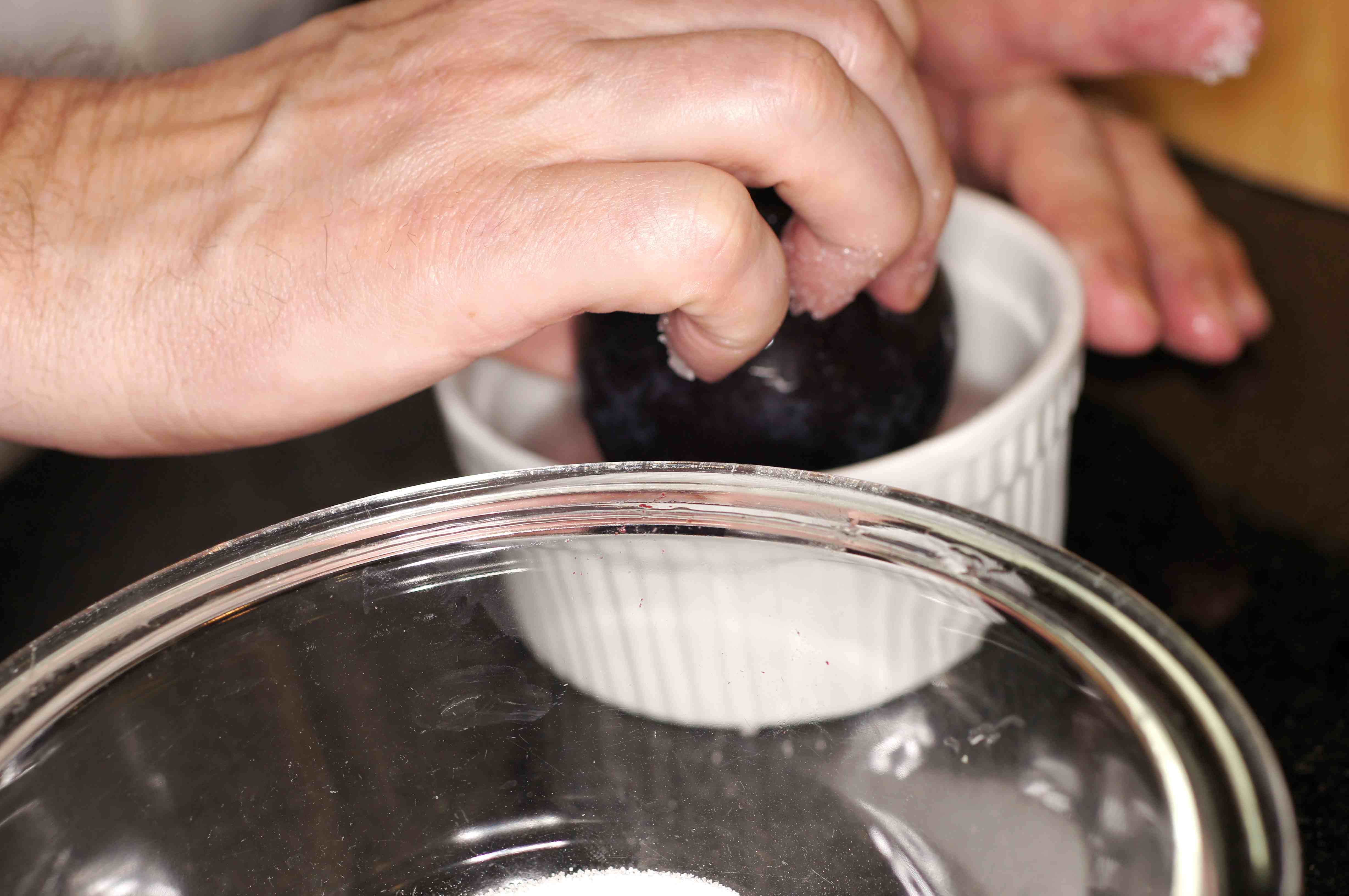 Those of you who have been reading the blog for a while know I don’t do a lot of desserts. First, they really aren’t on our diet with way too many carbs and calories. Second, we generally prefer salty to sweet, although I do have an incredible sweet tooth (especially for candies). Third, and probably most relevant, I’m not a baker although I do bake simple things like this dessert and it is absolutely delicious. Also, because I’m not a baker, you can bet the recipes I follow for baked goods are not my own. Either a friend of mine gave me the recipe, it’s something I learned a long time ago, Baby Lady made the dish, or we found it in a cookbook, on a cooking show, on a blog or the internet. This recipe comes from Jacque Pepin, Essential Pepin, Episode 124. I forget when I saw this episode but this cake looked soooo good and was so remarkably easy to make. Just my type of baking. It had been on the back burner for a while or until last week. You see, when I was at the local market last week, I noticed some beautiful, ripe black plums. Tis the season for plums right now and other fresh fruits and veggies. I really do love the bounty the summer brings. Remembering this episode of Essential Pepin, I bought the plums with the specific intent to make this dessert. I’m sure glad we made it. It is remarkably simple to make. In fact, the most difficult part of the recipe is pitting the plums. If you’re like me and want easy baked desserts, then this recipe is just what you’re linking for. This is what we did.