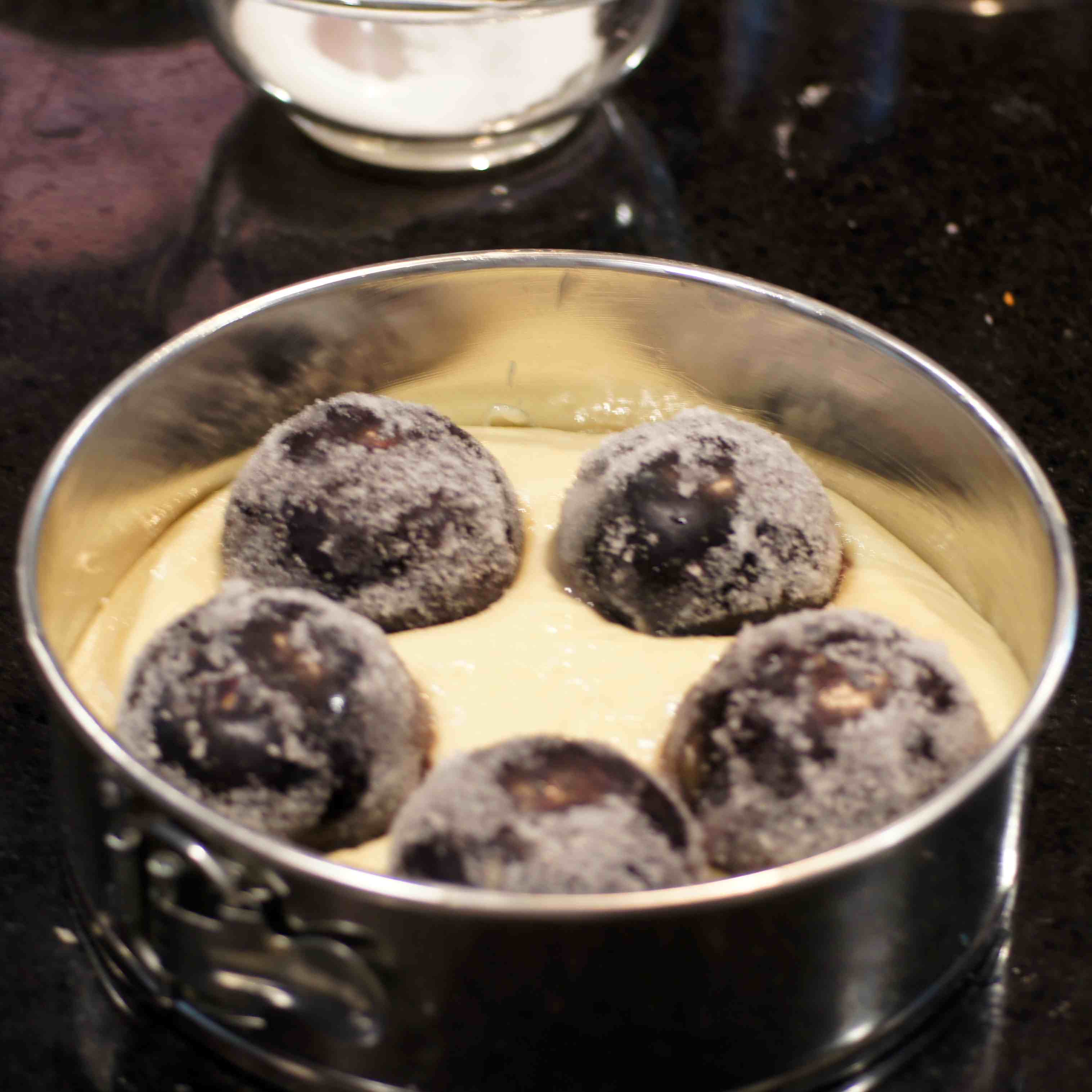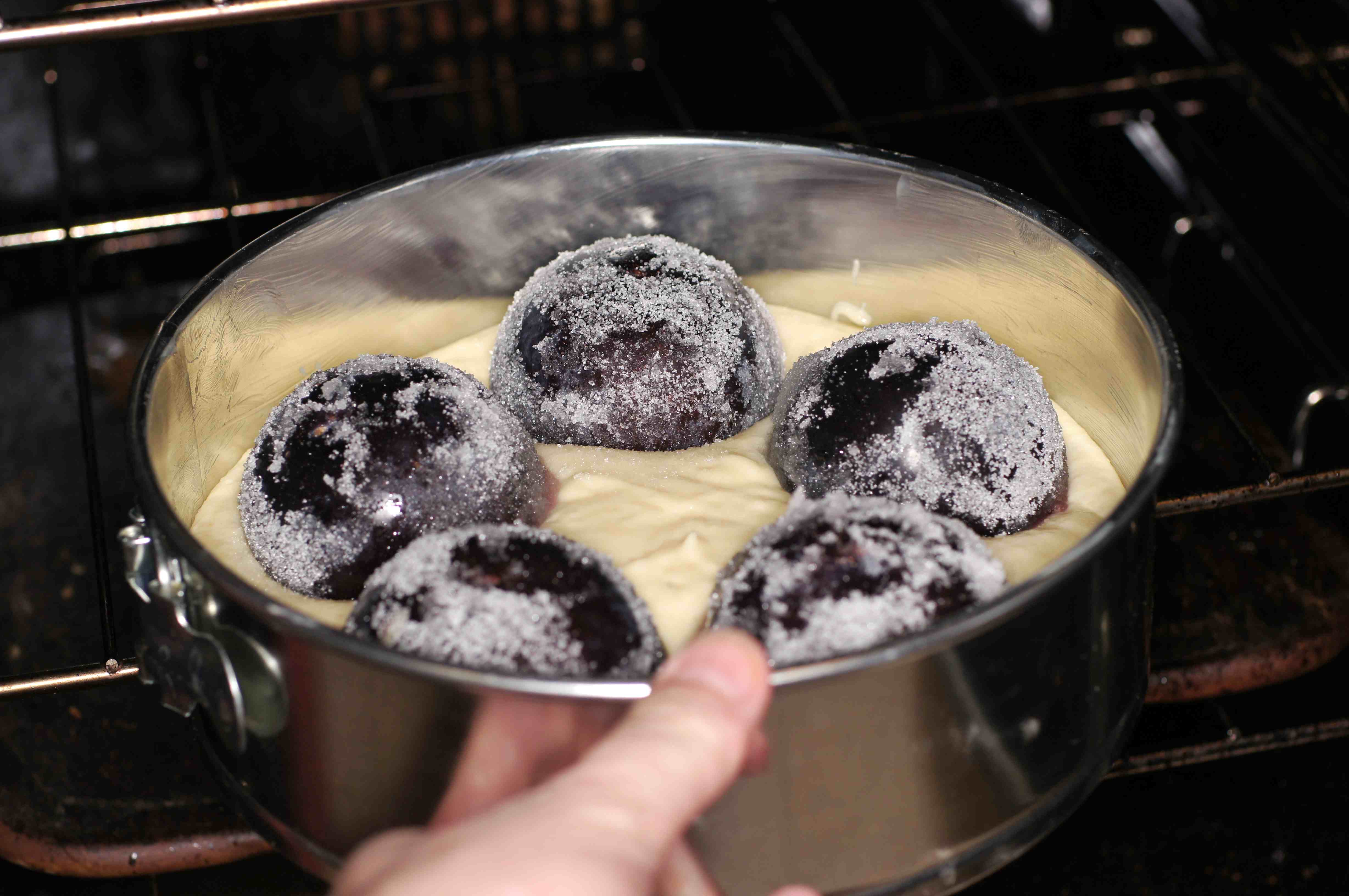 Arrange the plums on top of the cake, spacing them evenly, and push them down into the batter until the bottom half of each is immersed.