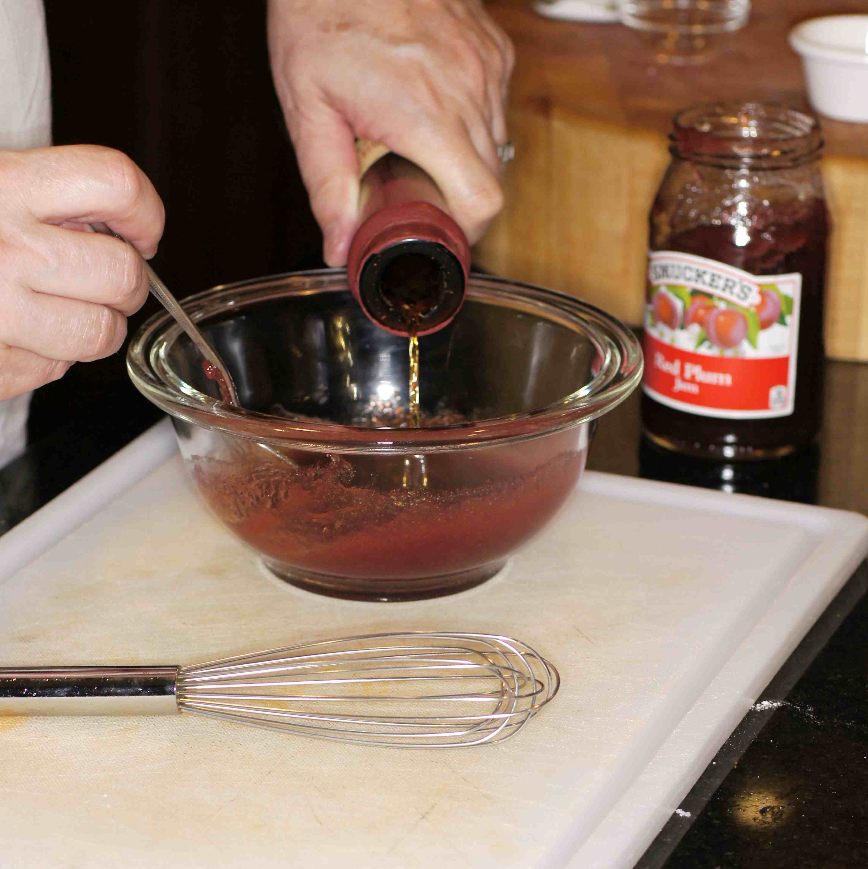 While the cake is cooling, add the plum jam to a mixing bowl.