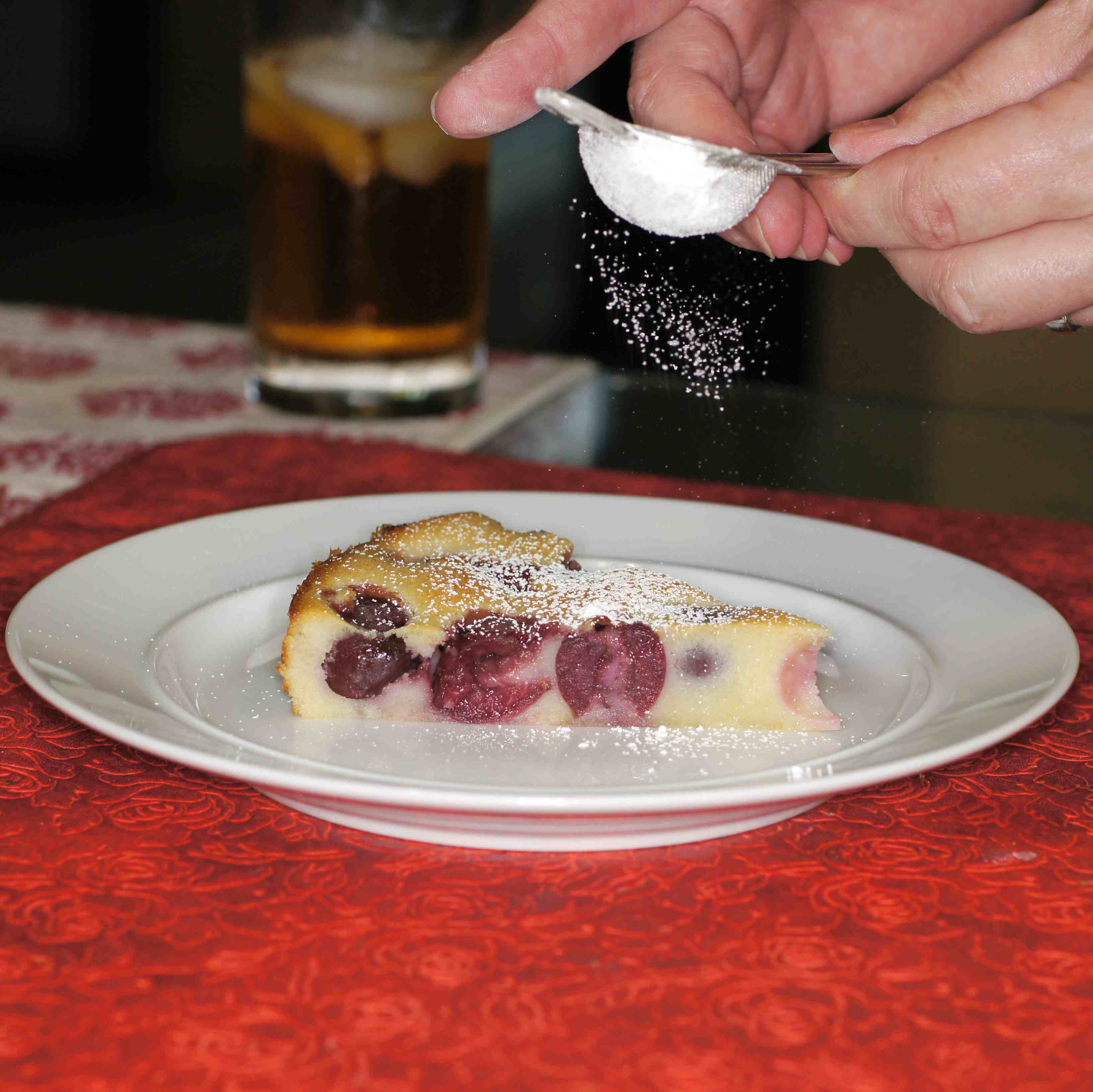 Now, a clafouti is a rustic French country dessert from the Limousin region. It has become rather popular in the US of late and you see it made with a variety of fruits, i.e. apricots, peaches, pears, and cranberries just to name a few. Traditionally, however, a clafouti was made with the first sweet cherries of the season. Further, the cherries were not pitted so their pits could release their delicate almond flavor as they baked. If you’re going to make it the traditional way make sure to warn your guests. Otherwise, it’s an unpleasant surprise to bite into a cherry pit. 😮 Nowadays, a clafouti is made by covering sweet, pitted cherries with a pancake-like (almost crepe-like) batter and baking it in a hot oven until the batter has set with nicely browned, slightly puffed edges. In a way, it is custardy, similar to a flan, yet the addition of flour makes it more akin to an apple pancake or a super thick, fruit filled crepe. It should be served while it is still warm with a dusting of powdered sugar.