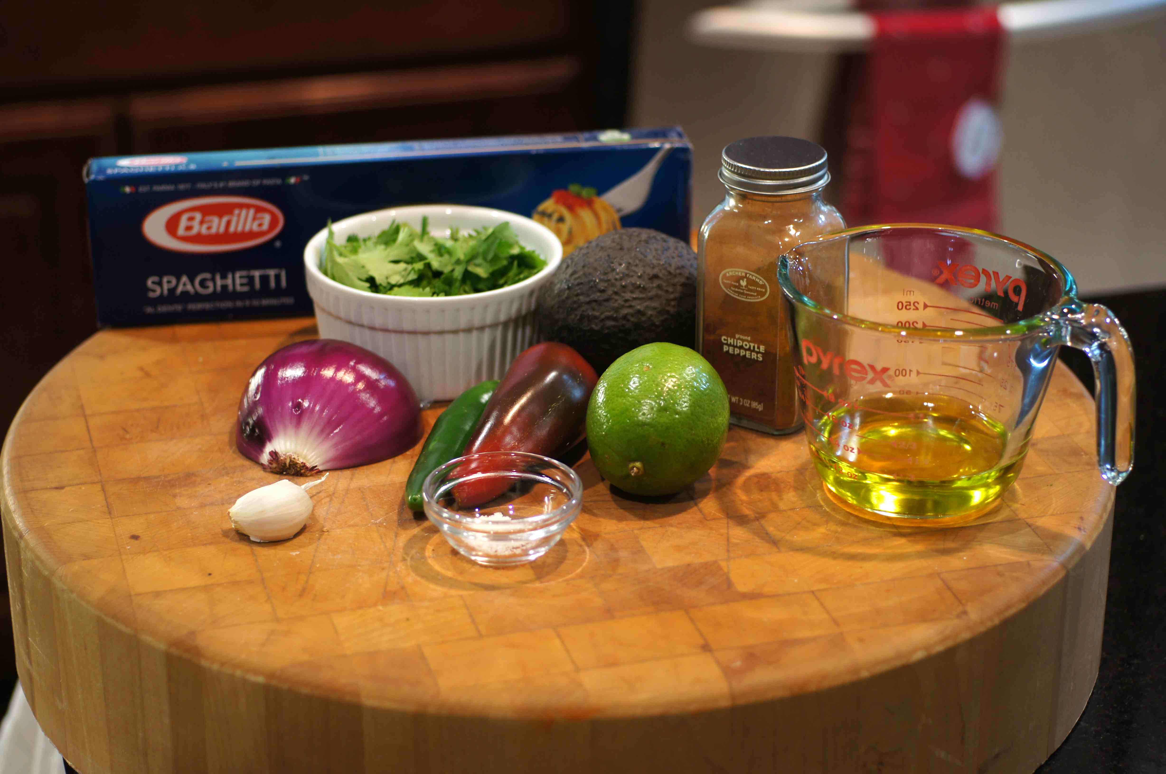 Well, we knew the heat was going to come eventually and it has. The weather in DFW has been a real scorcher of late with triple digits the norm. We hit 107 F this week. Weather like this just drains you. You hate cooking inside because the house gets hot. So, you’re always looking for quick, easy, refreshing meals to fix. This is one of those recipes. We simply didn’t know what we wanted for dinner. I had been messing with Quickstep’s car and was pretty drained from the heat. Although a nice bright salad would have been nice and refreshing, I wanted something a little more substantial yet without a lot of work. I had some beautiful salmon steaks in the freezer and a couple of small, ripe avocados along with a variety of fresh veggies from the farmers market. Assessing the situation and food inventory, the wheels began to turn. Now things began to crystalize in my mind. Why not a spaghetti pasta dish with a nice, refreshing sauce with an ancho crusted salmon on top? Oh yah, and a little Serrano chile for a touch of kick for the Baby Lady. A little chipotle chile powder for some smokiness. That’s the ticket.