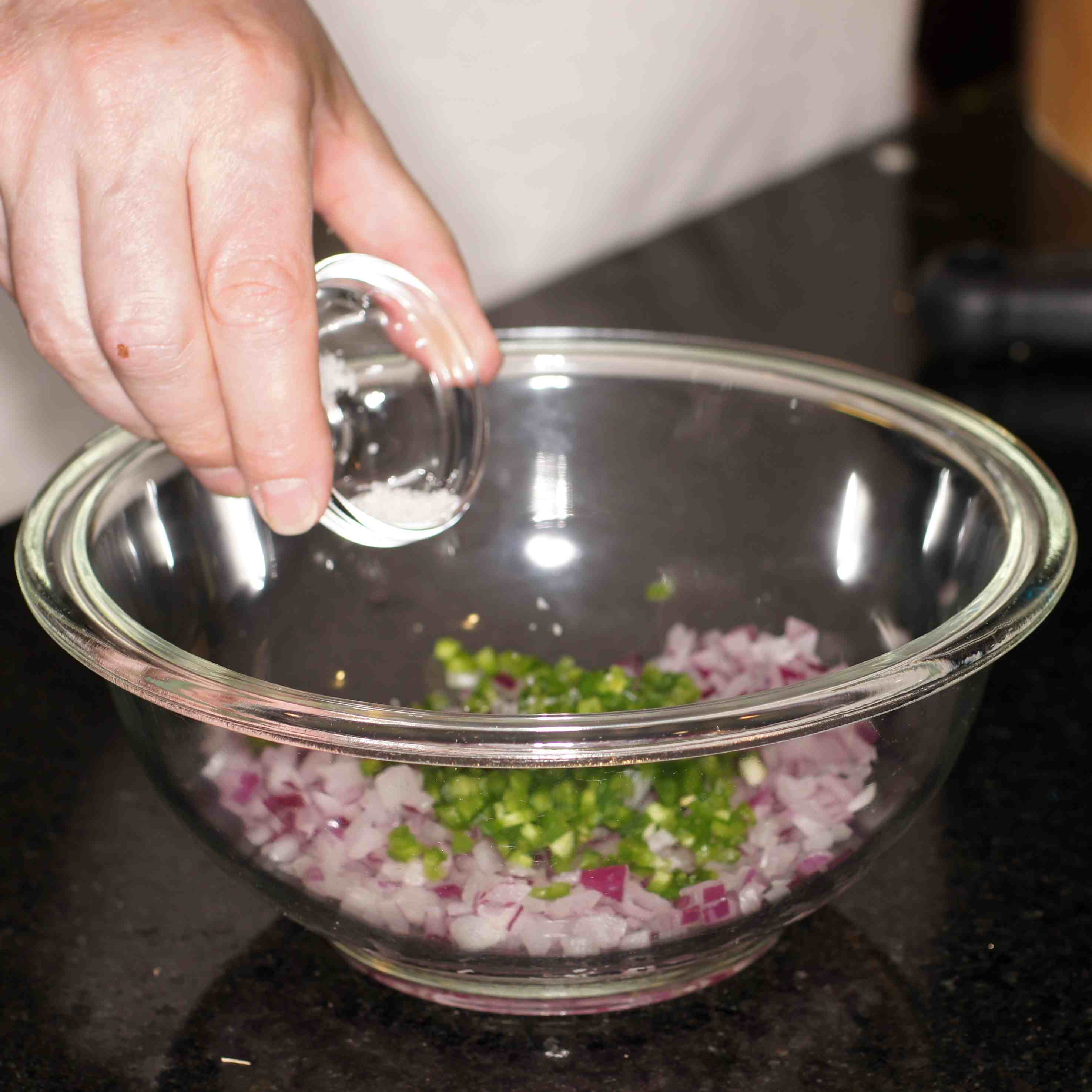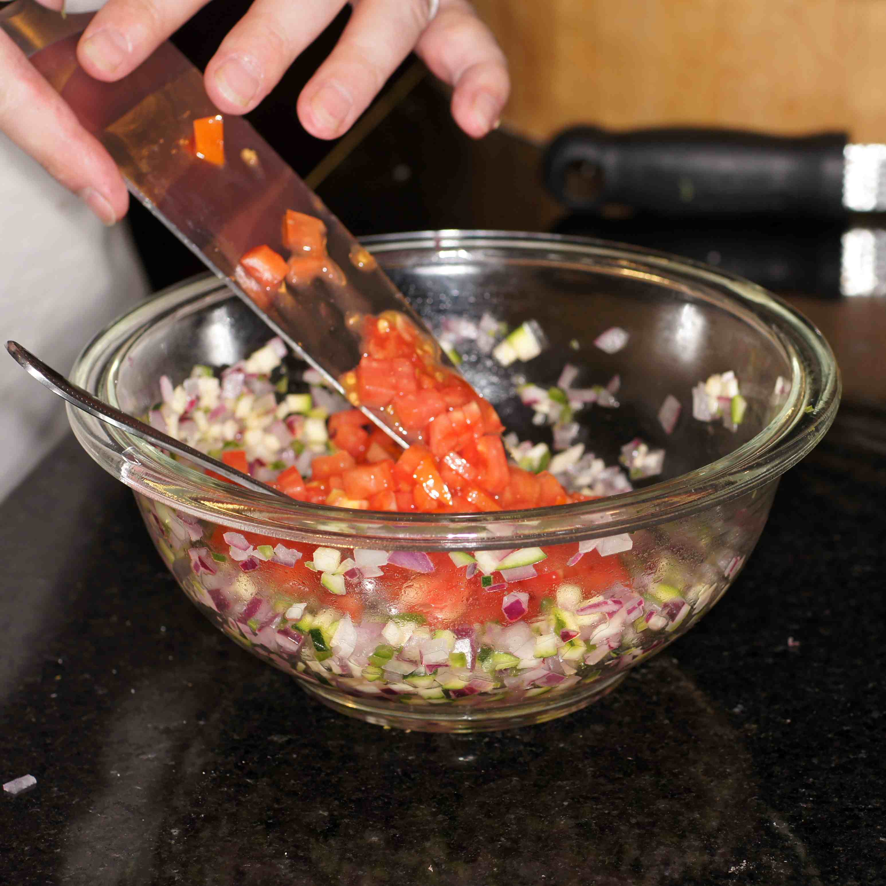 Stir gently and let sit to meld the flavors. Do not add the tomatoes at this time because the veggies are going to macerate in the lime/salt mix. Adding the tomatoes at this time will make it too watery.