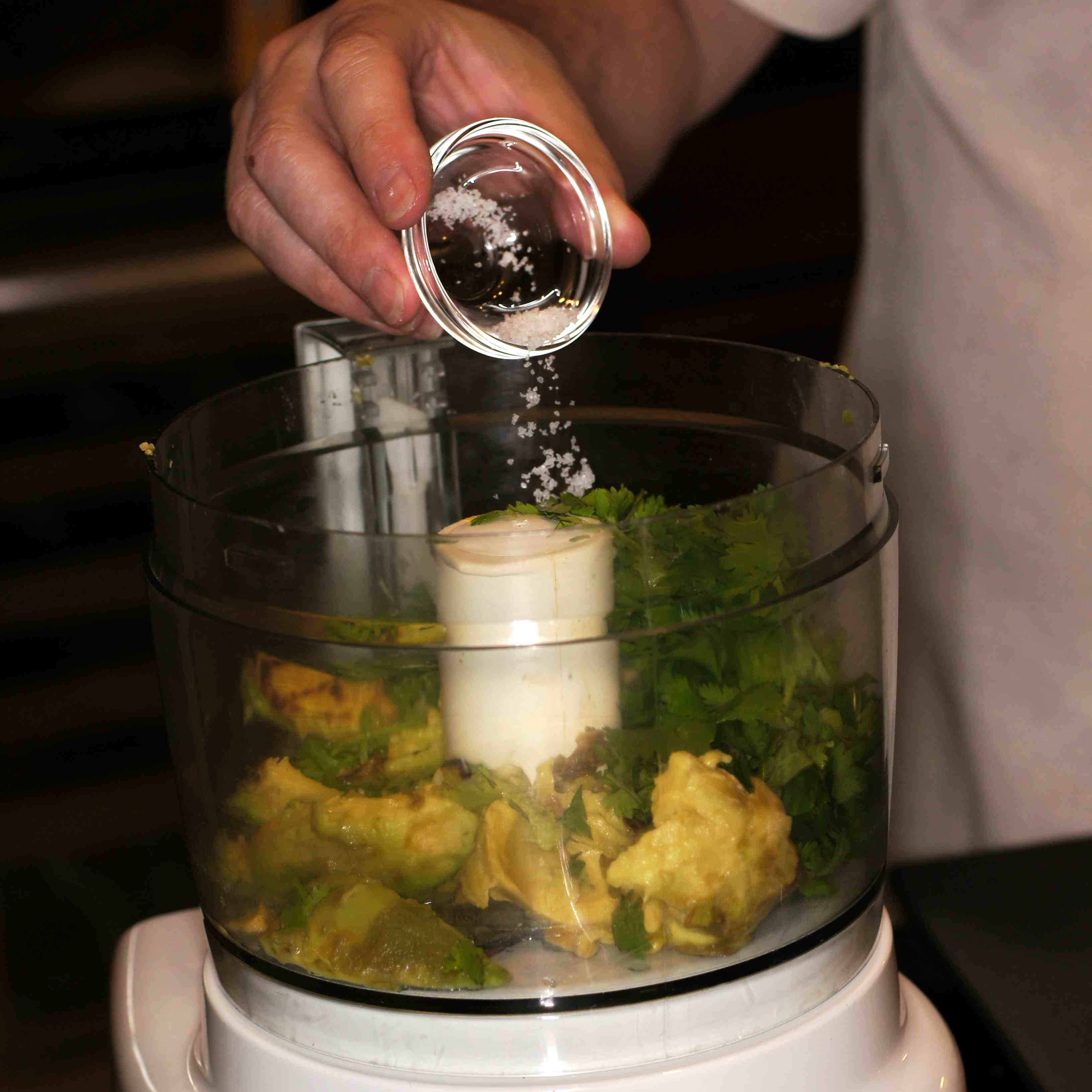 With the processor running, stream in the olive oil.