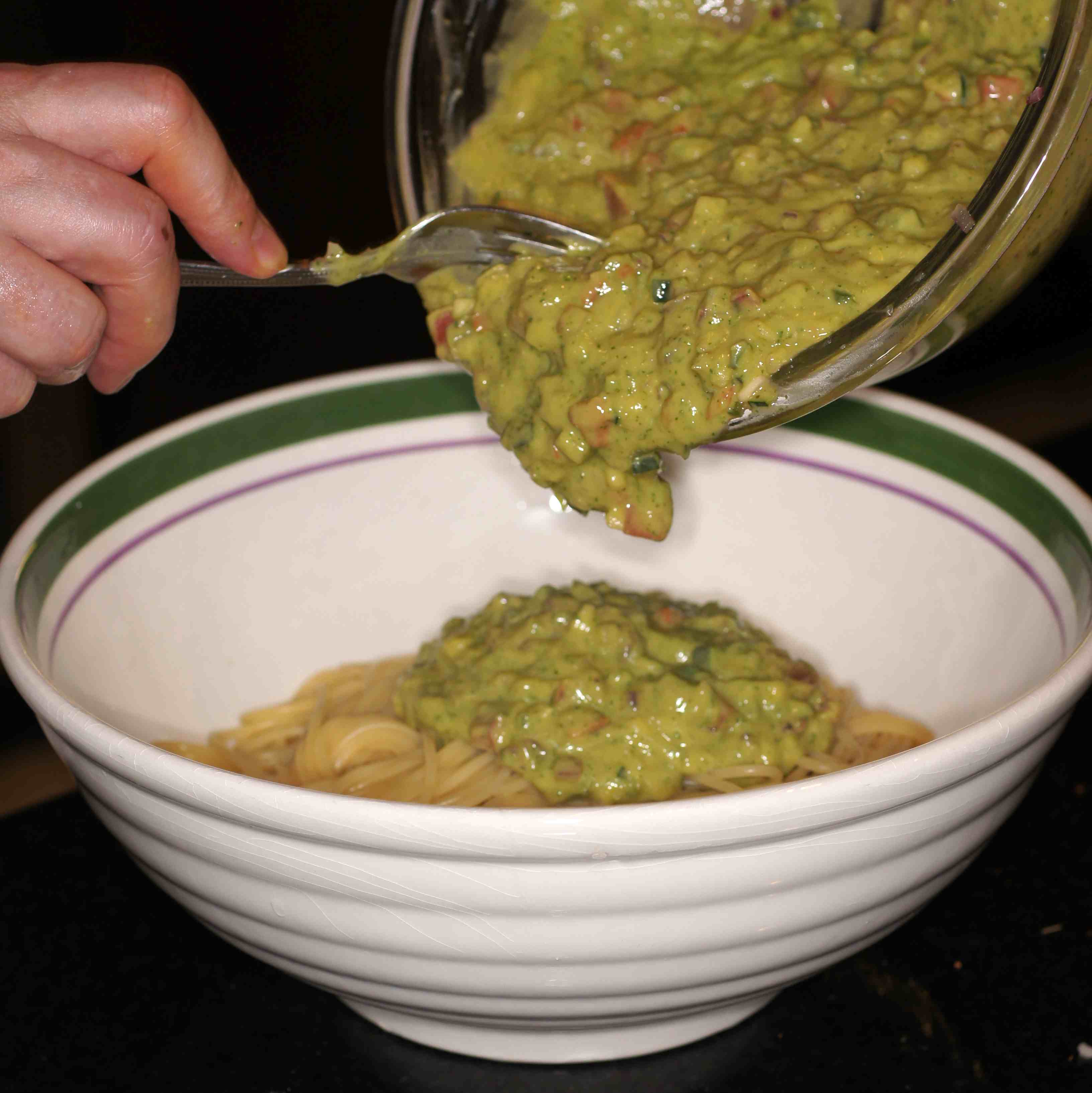 Drain pasta into a bowl and add the avocado sauce to the spaghetti.