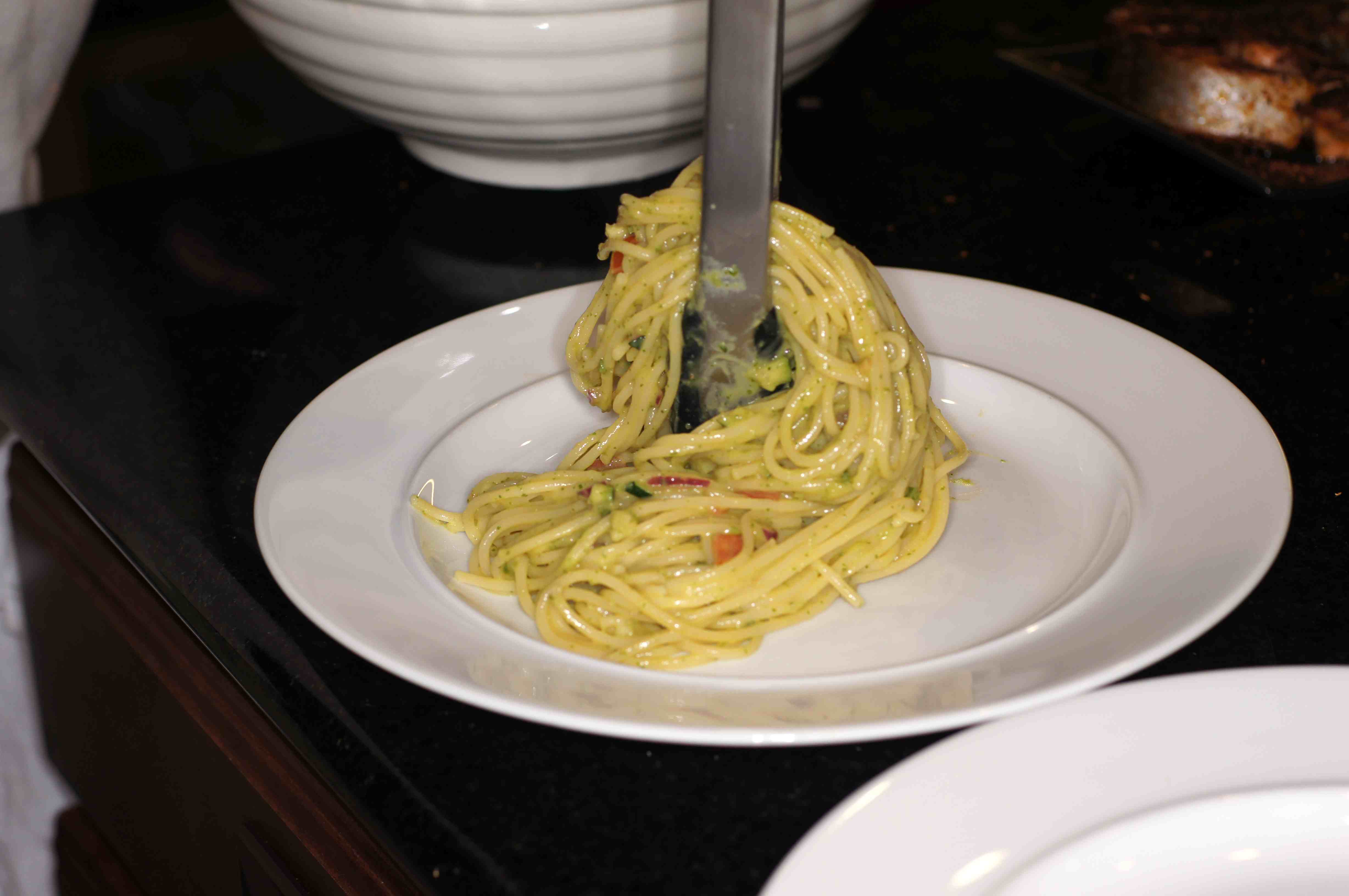 Toss the past to blend the pasta and sauce together. Place a serving of pasta in the middle of the plate.