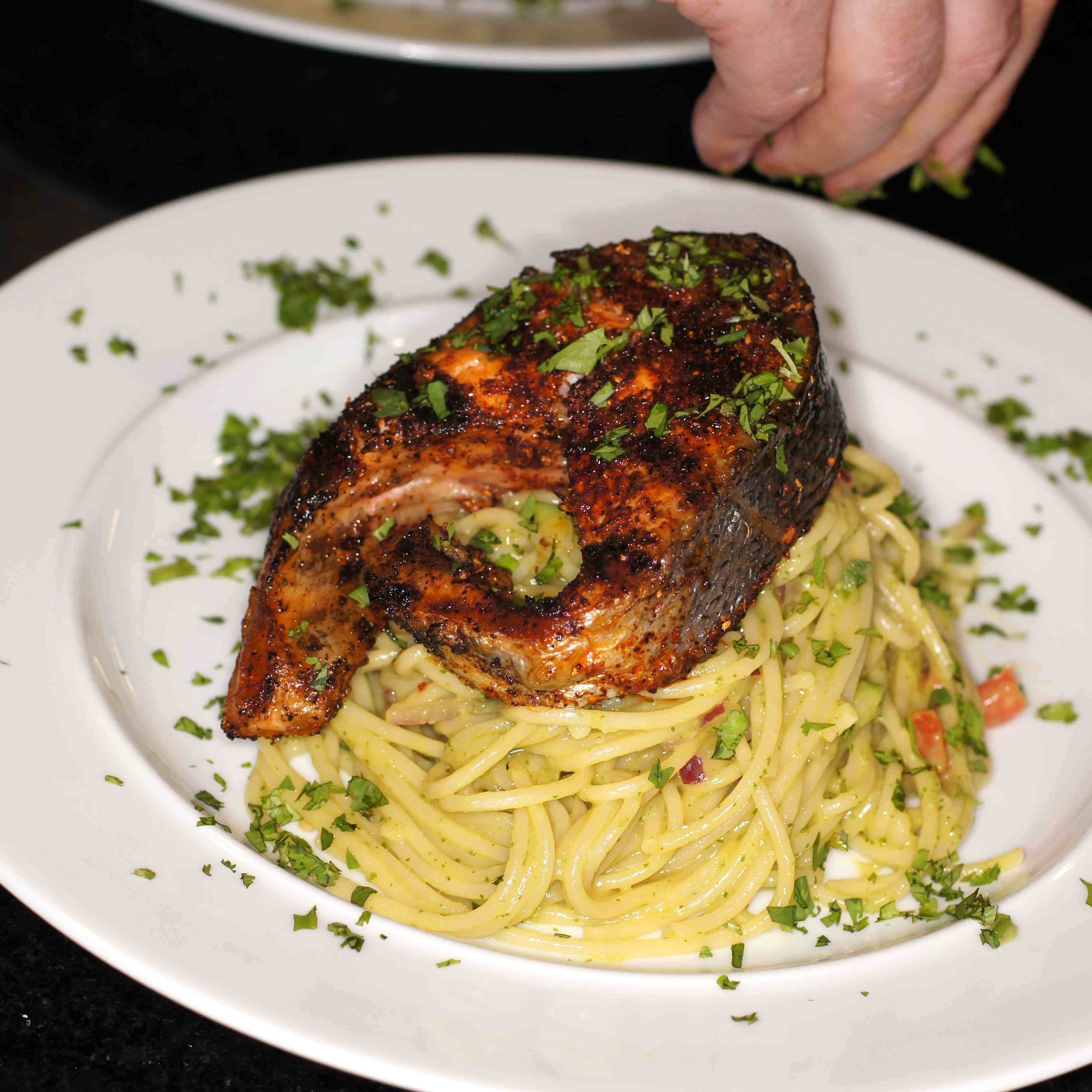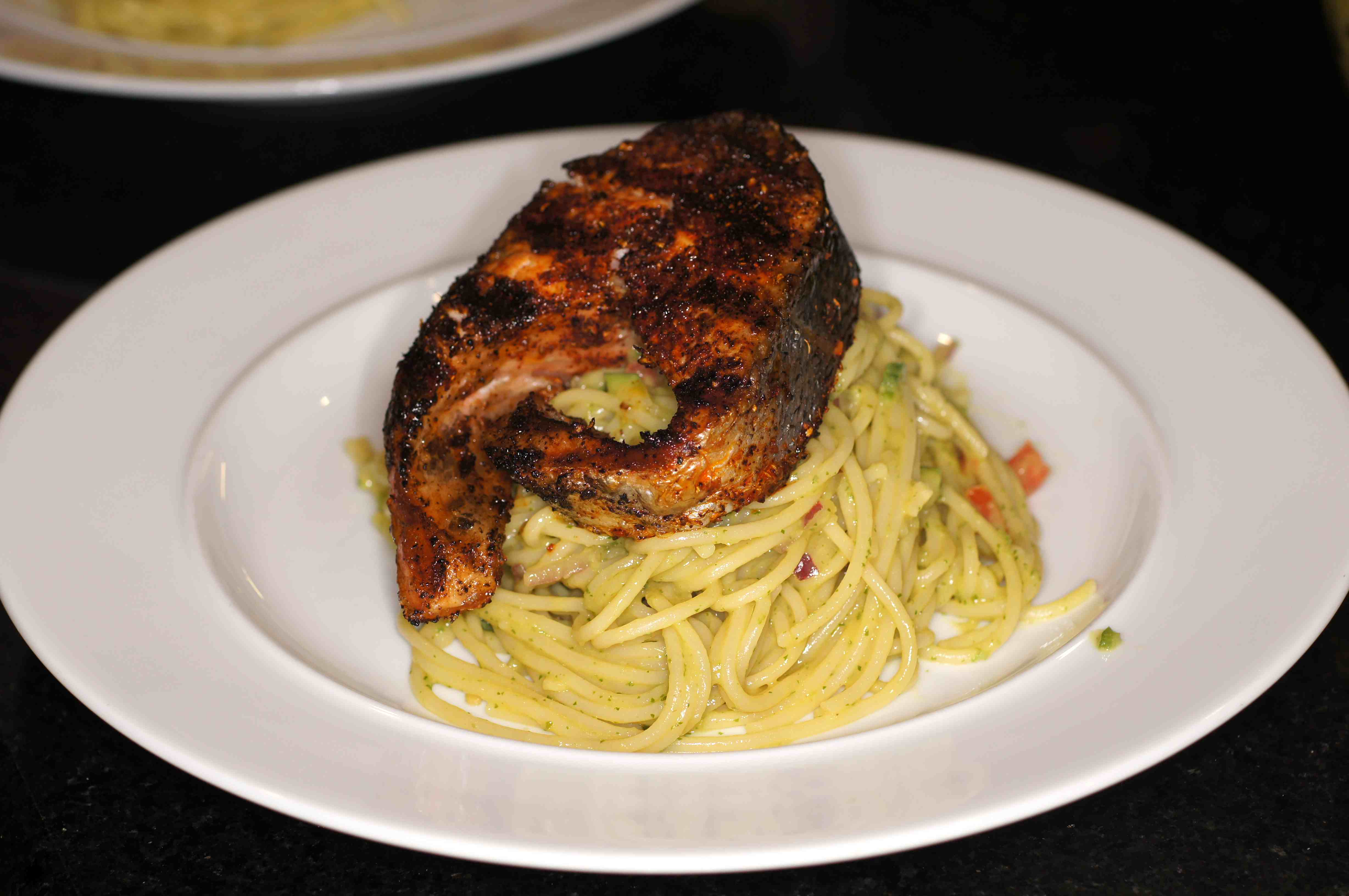 Grilled Ancho Crusted Salmon atop Spaghetti with Grilled Avocado Chipotle Sauce