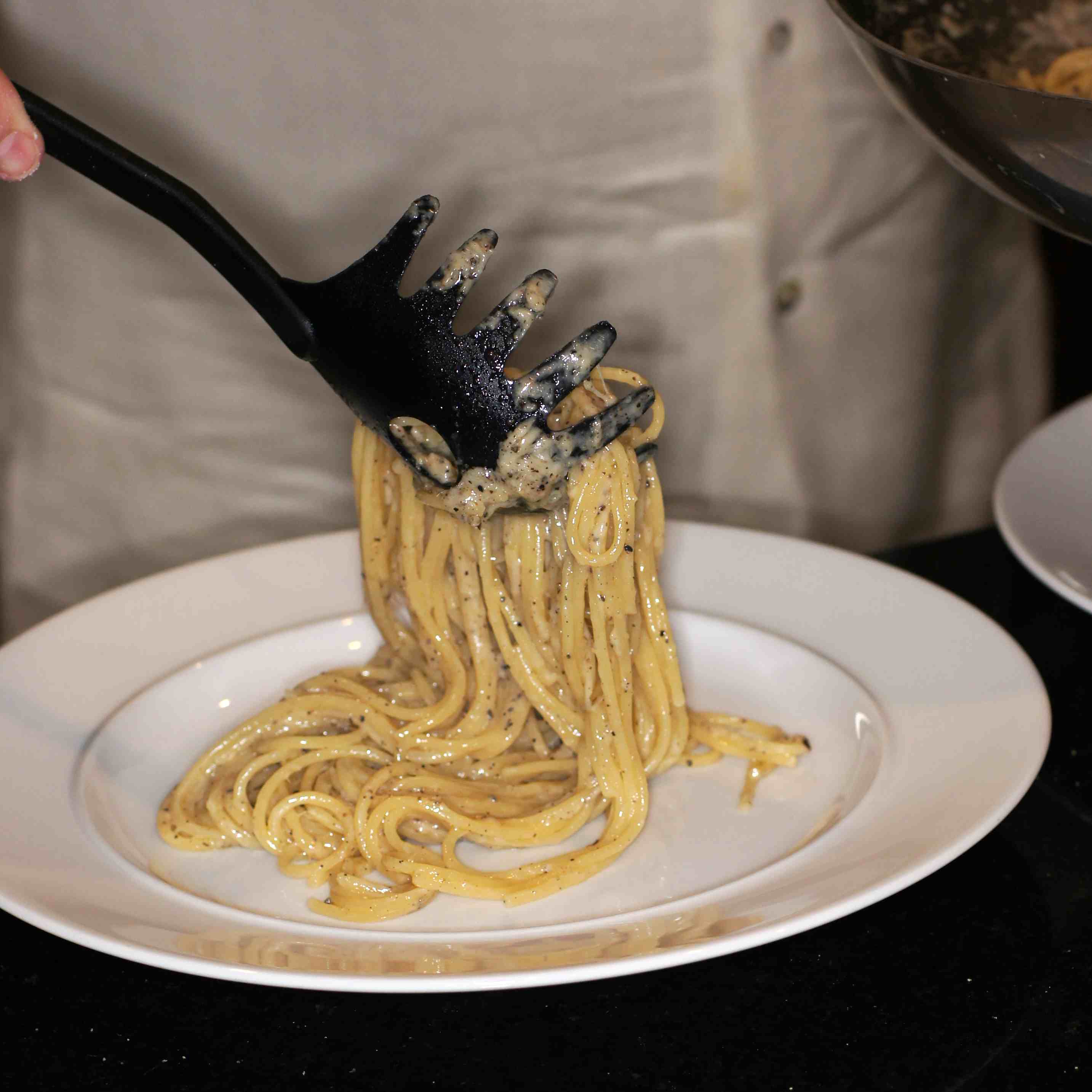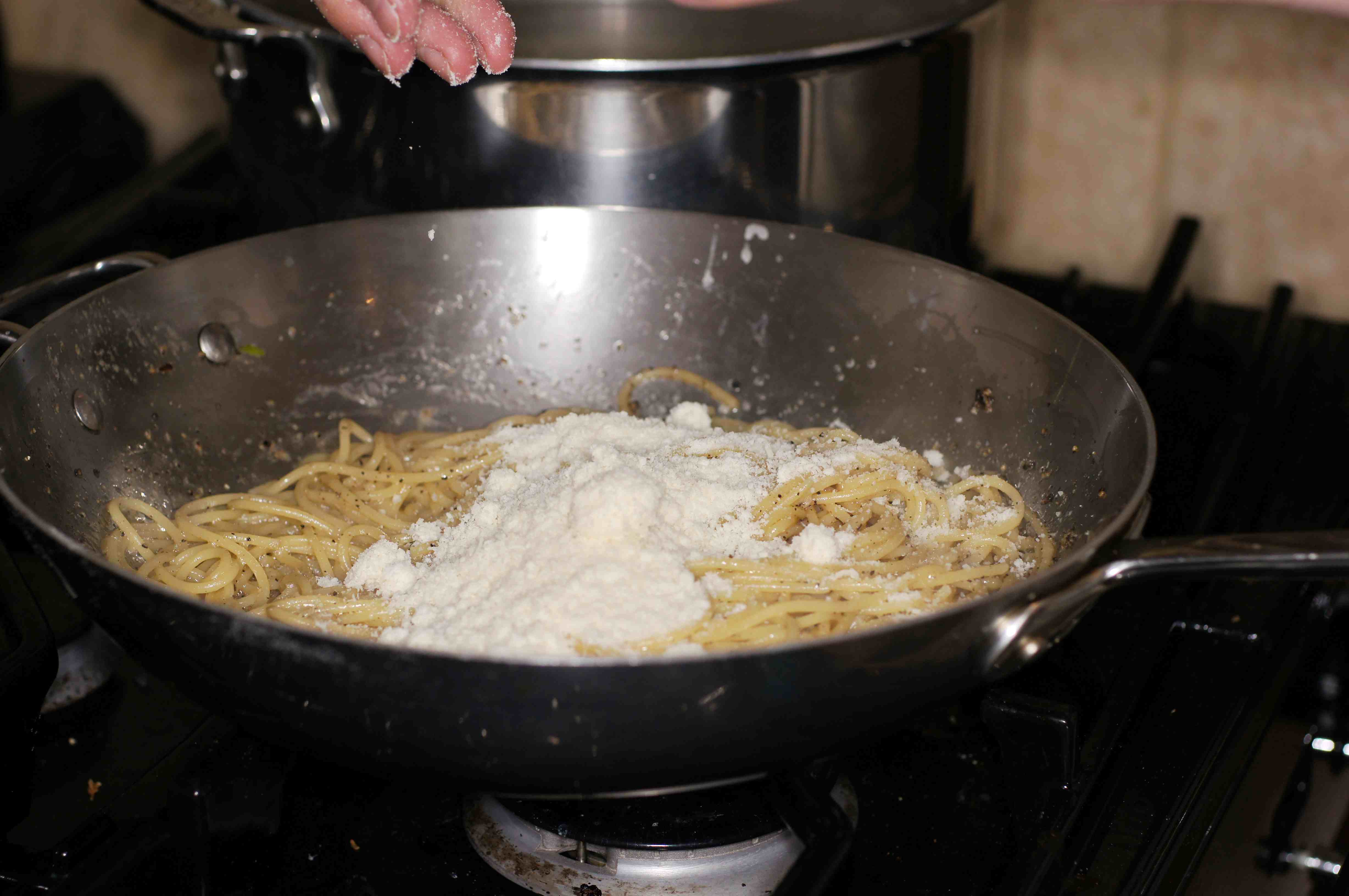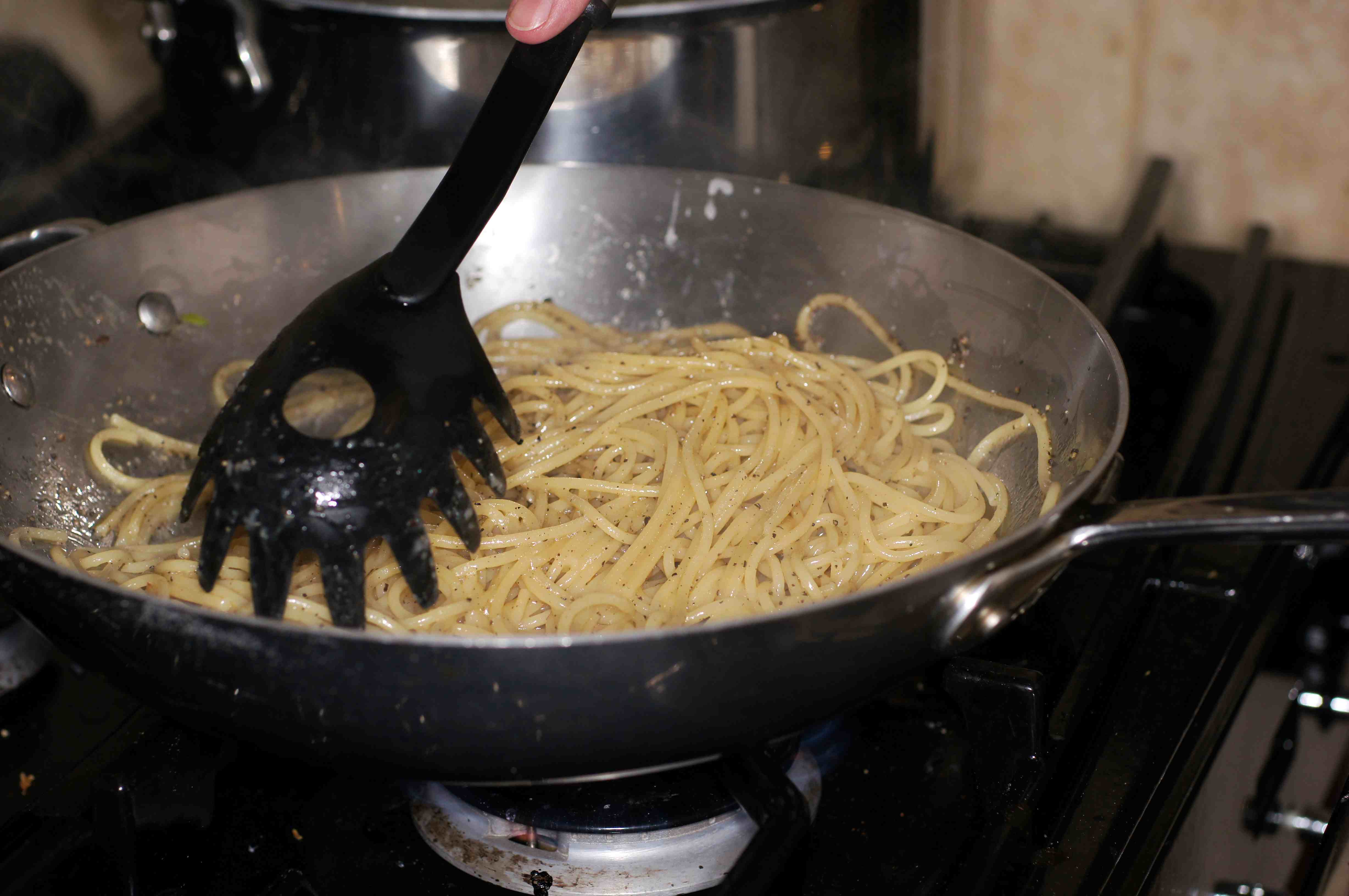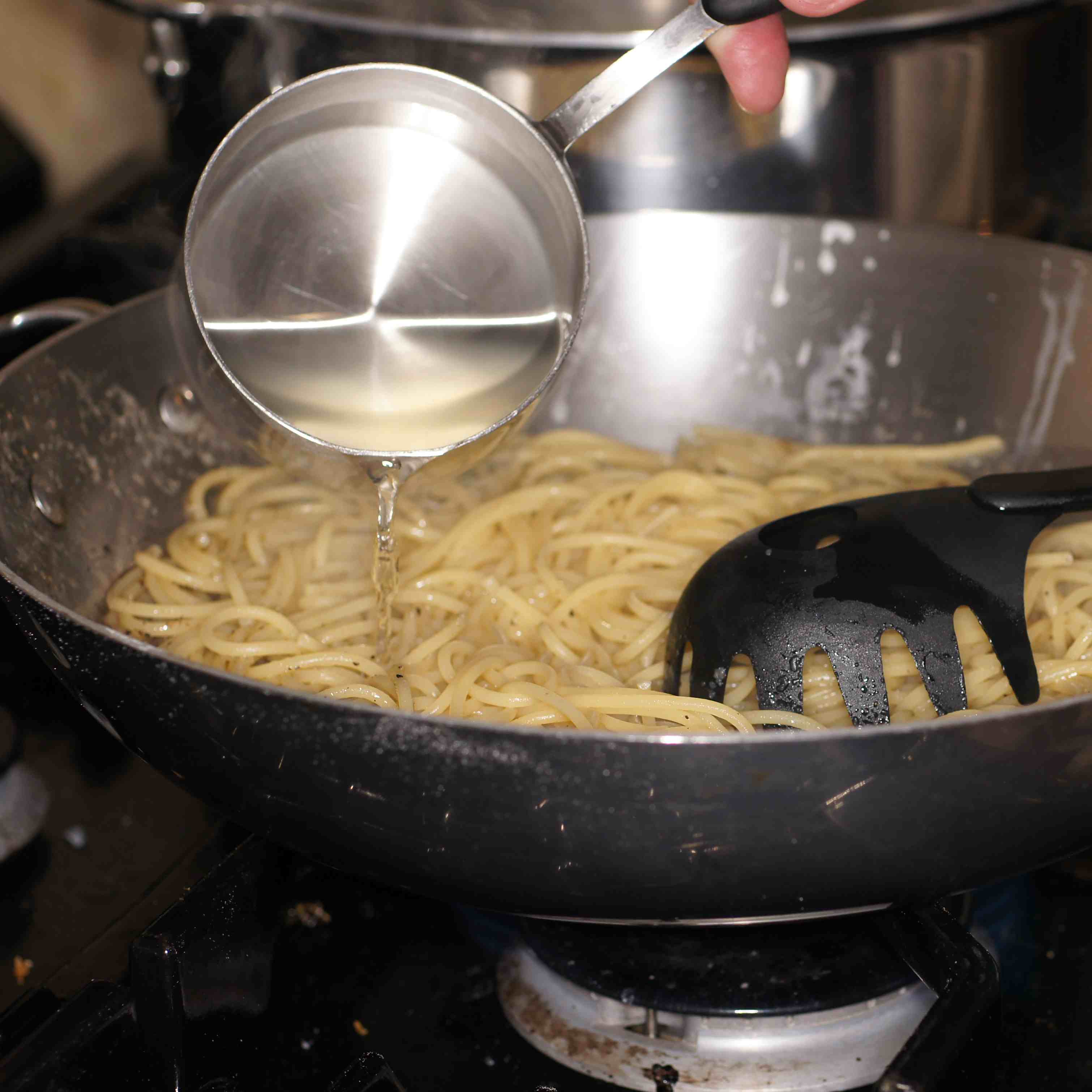 toss to incorporate the butter and pepper with the pasta. Now add the pasta water.