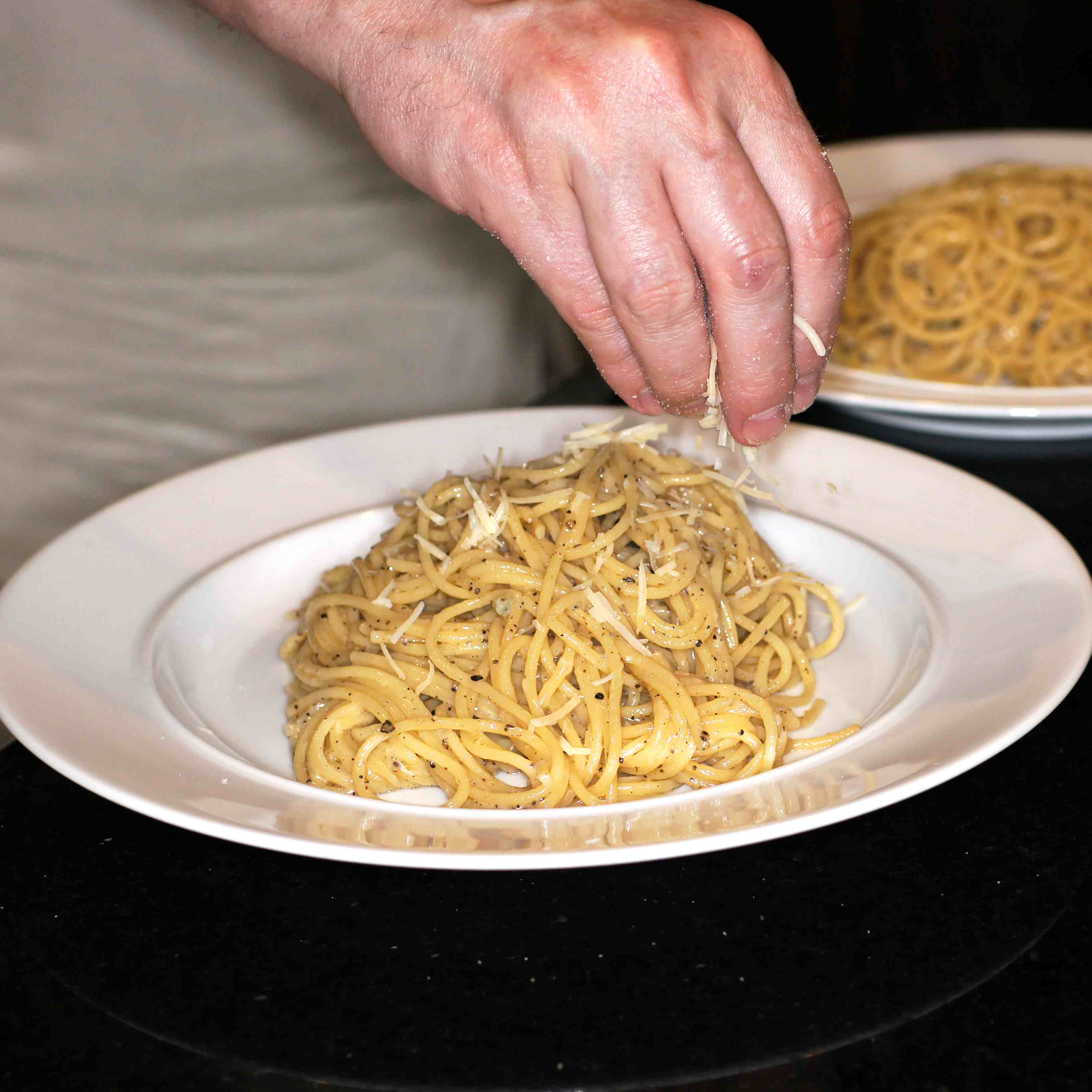 Interestingly, for something so simple it’s amazing how many different techniques and variations on the recipe there are. Some use butter, some use a combination of olive oil and butter, others use no butter/oil, only the cheese, pepper and pasta water. Some toast the cracked black pepper, add the oil/butter then the pasta water to form an emulsification. Others melt the butter, add the pepper, then the pasta and then the water. Next, the question becomes which cheese? Some recipes say percorino, some say parmesano reggiano, some say a combination of the two. I haven’t even begun to address the various permutations on technique and ingredients for this very simple dish. It’s really fascinating seeing the different approaches to this simple meal. Regardless of the technique, fat versus no fat, or choice of cheese, the critical aspect of this dish, however, is the sauce. If done improperly you get a lumpy, gloppy, cheesy mess. Done right, on the other hand, you get a luxuriously creamy, cheesy sauce mixed with the pasta that has lots of pepper flavor. It is so good, you just can’t stop eating plateful after plateful. You will be amazed that something this simple and quick can taste so good. If you have never had cacio e pepe, you need to try this dish. This is what we did.