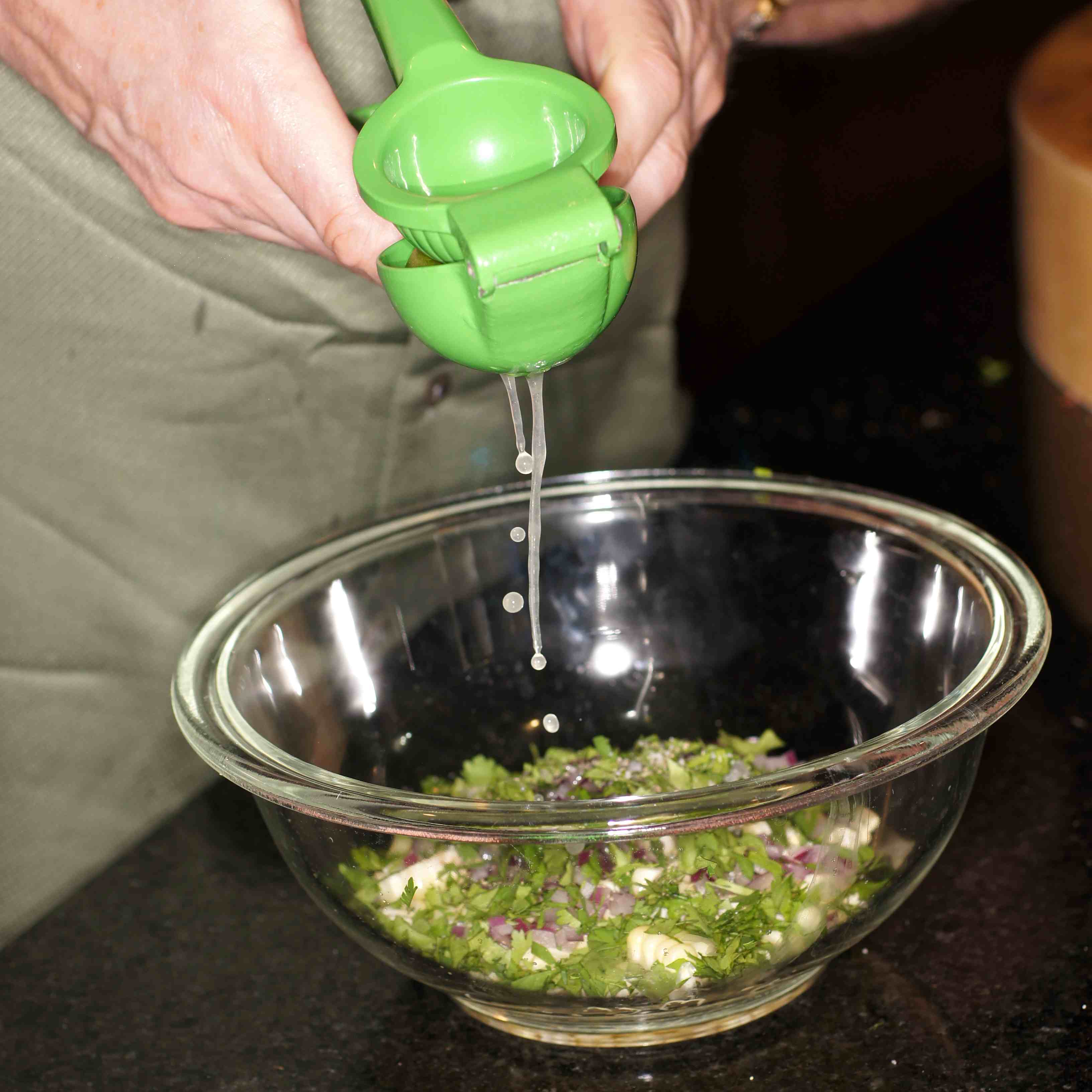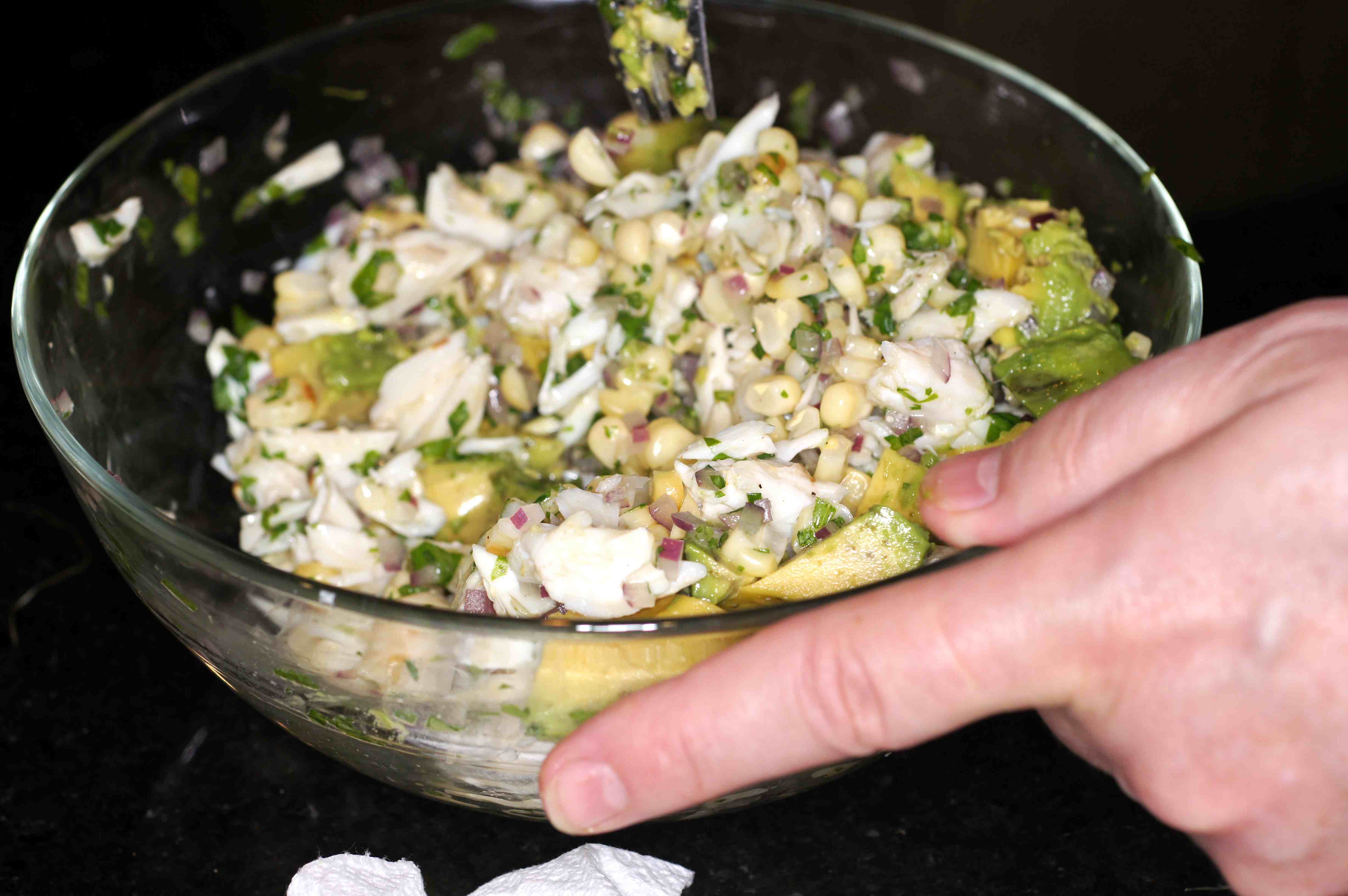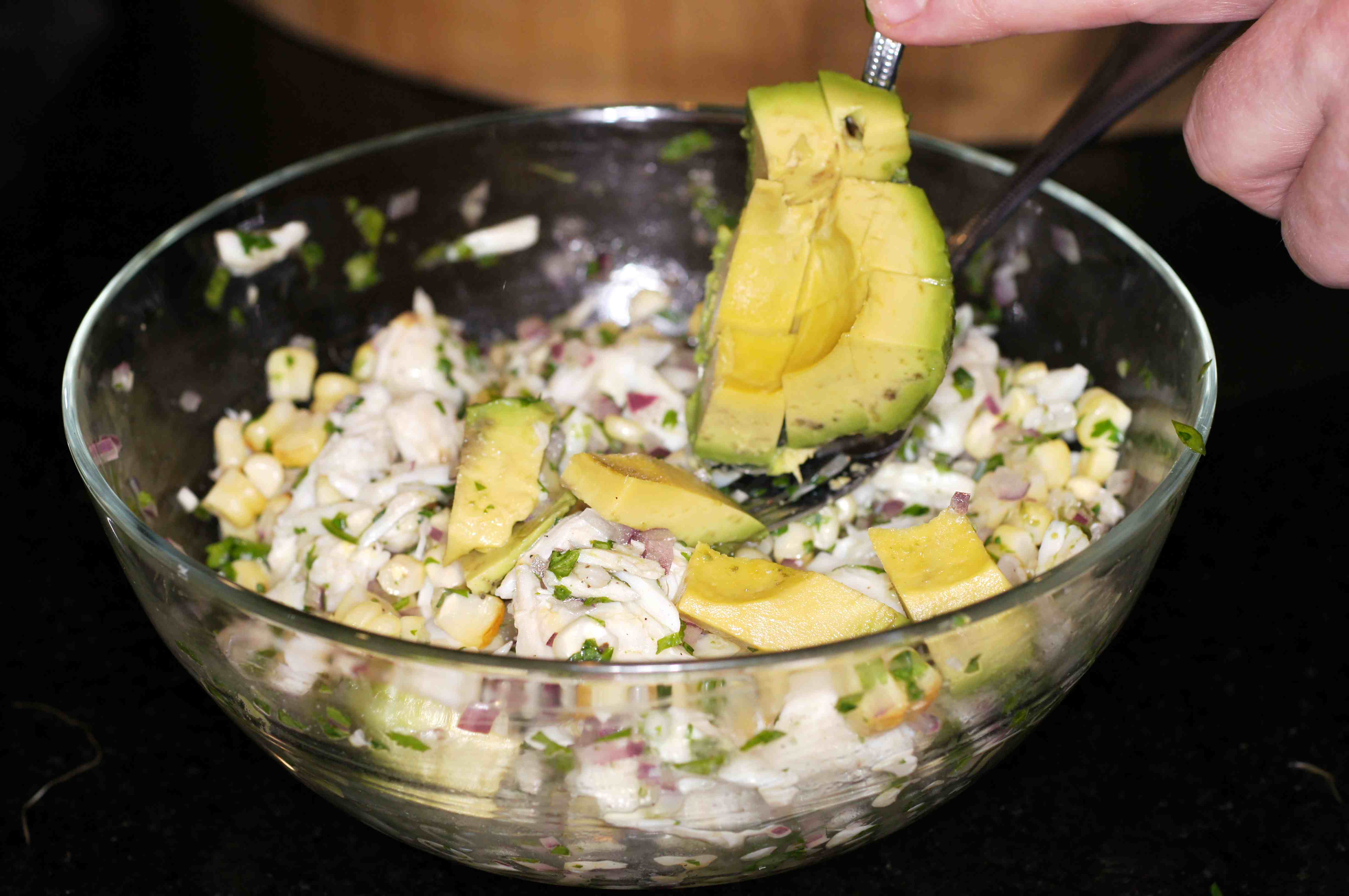 Toss very gently so as not to break up the lump meat and add the diced avocado.