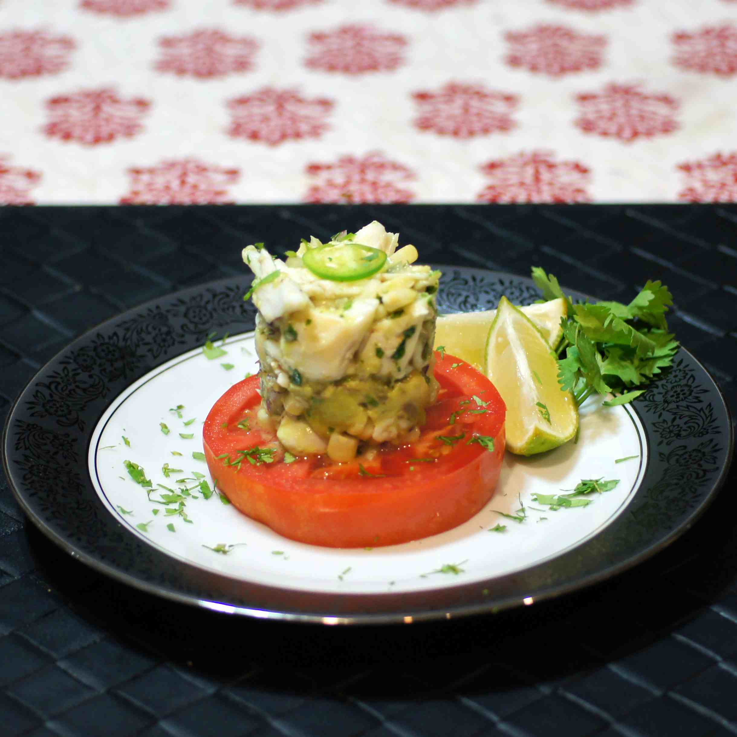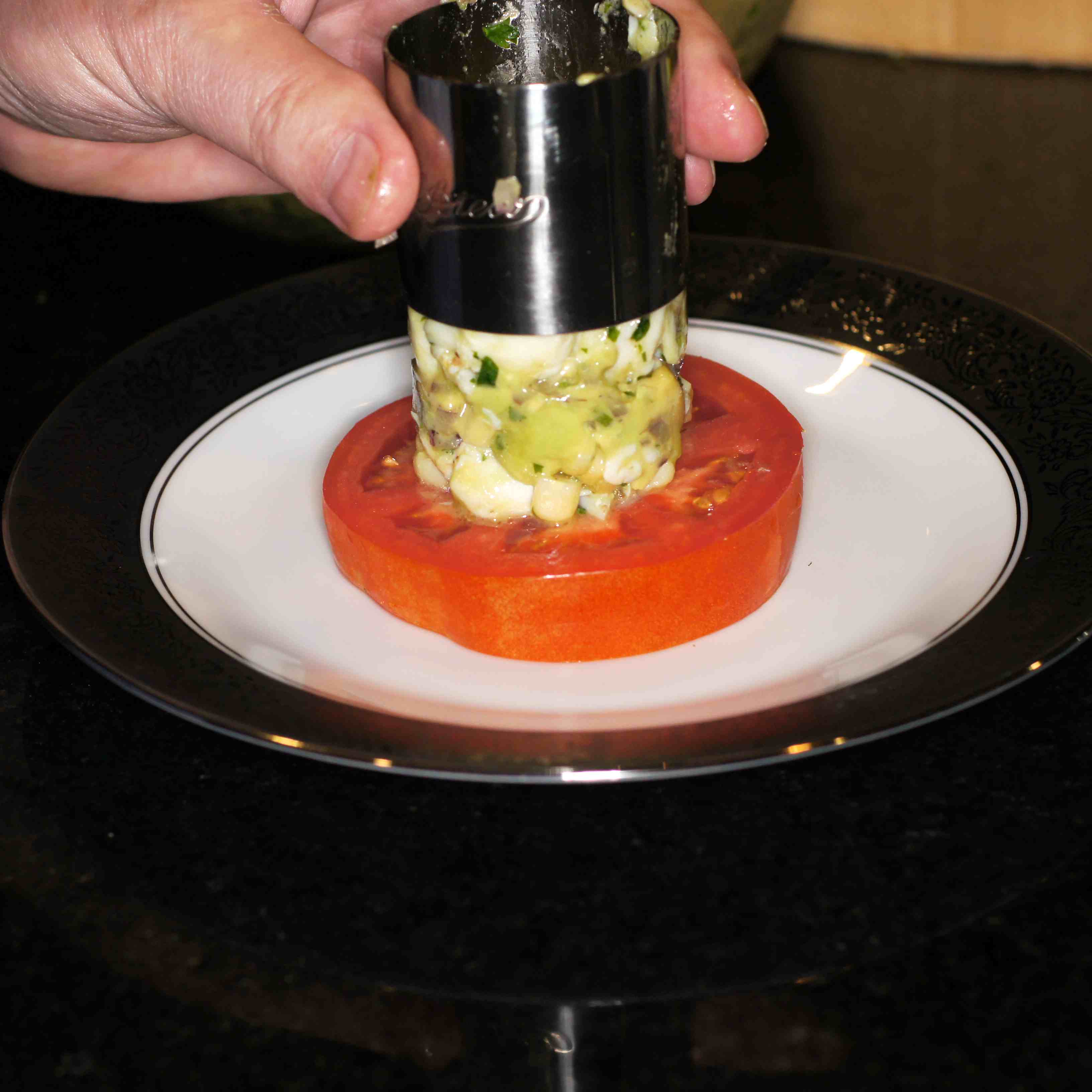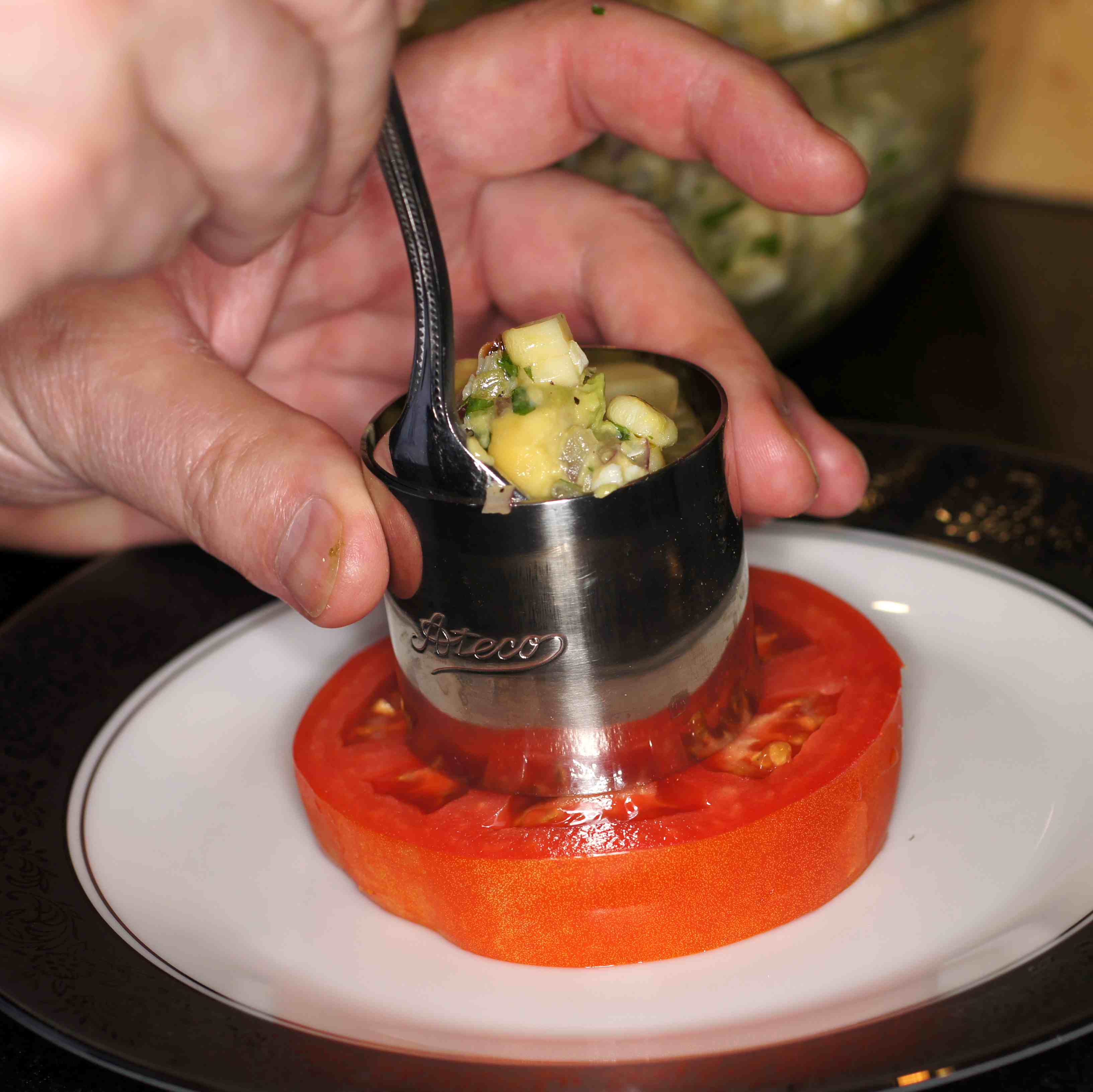 Cut a large tomato into 1 inch thick steaks and season with salt & pepper. Place a ring mold in the center of the tomato steak and scoop some of the salad into the ring mold filling it to the top.