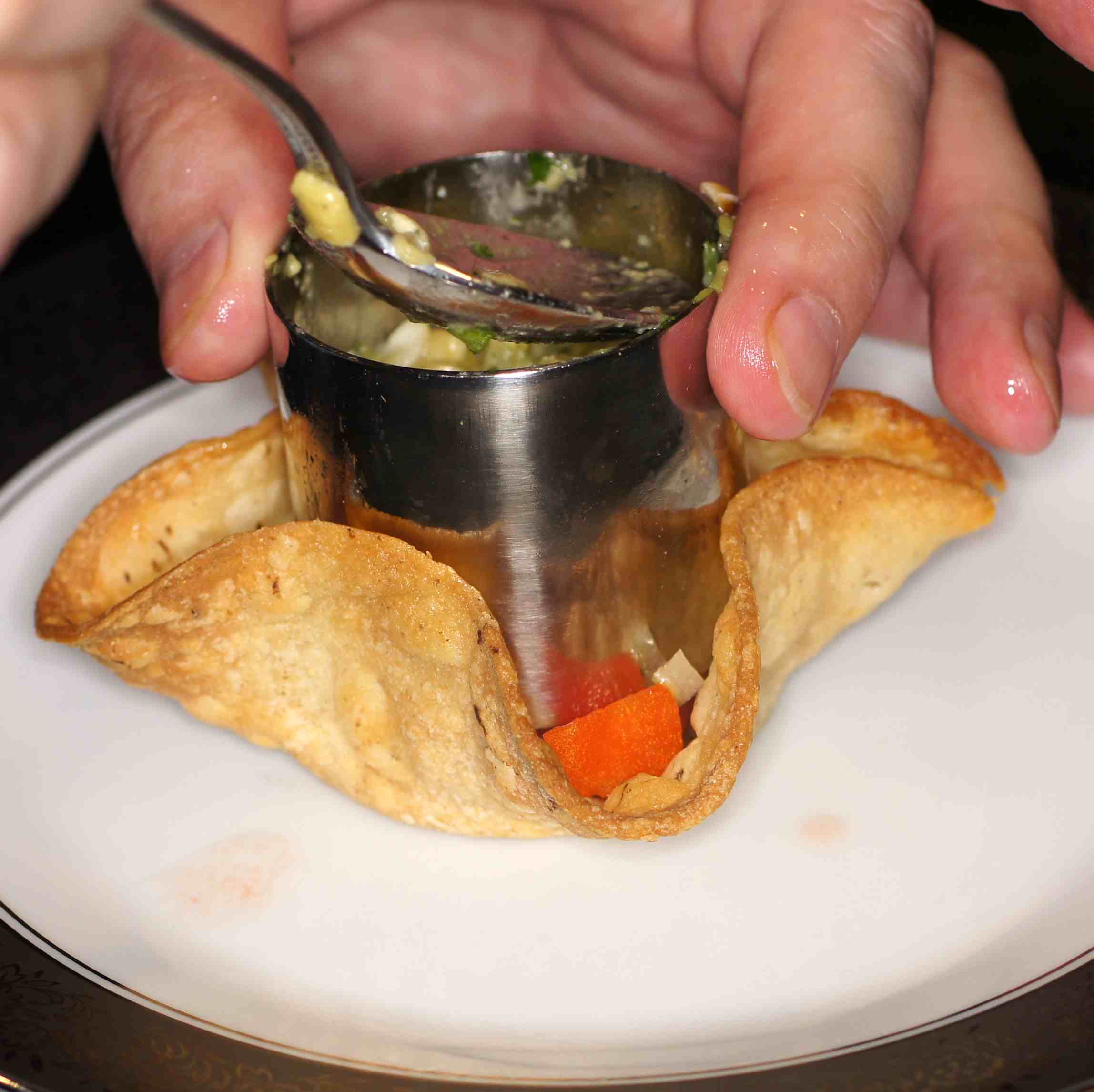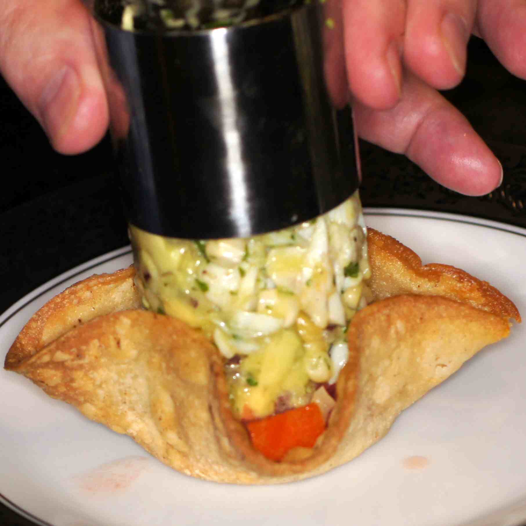 Place the ring mold in the center of the cup and fill with the crab salad.