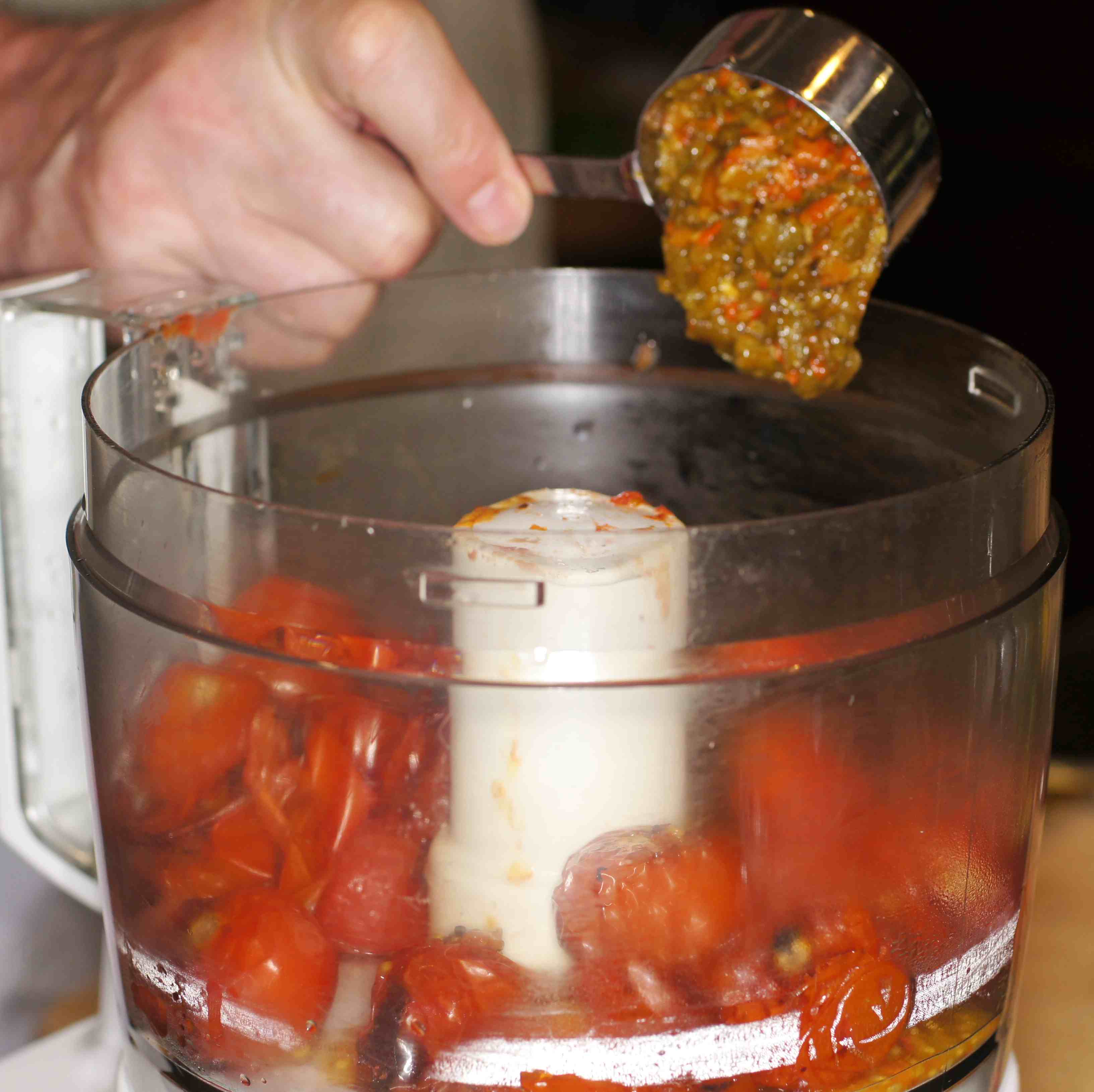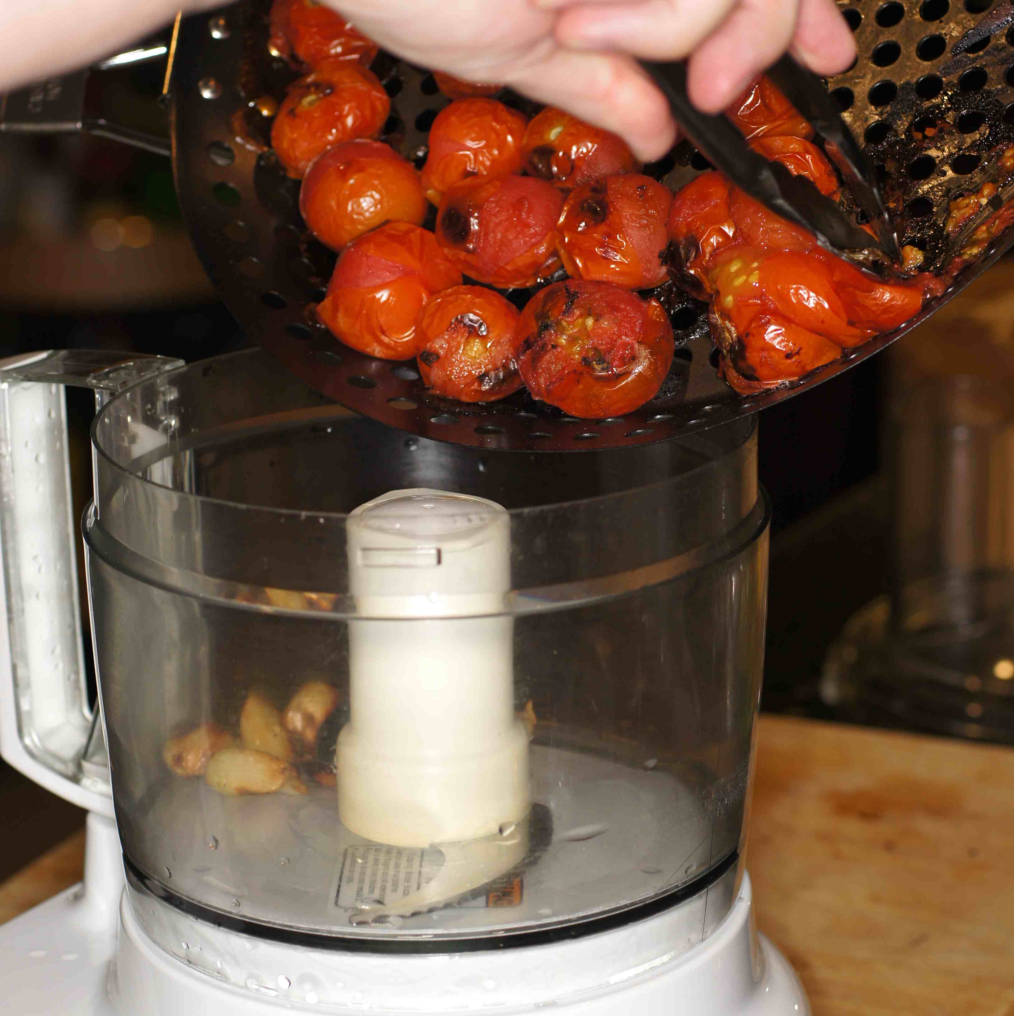 When the veggies are finished roasting on the grill, add the tomatoes to the food processor