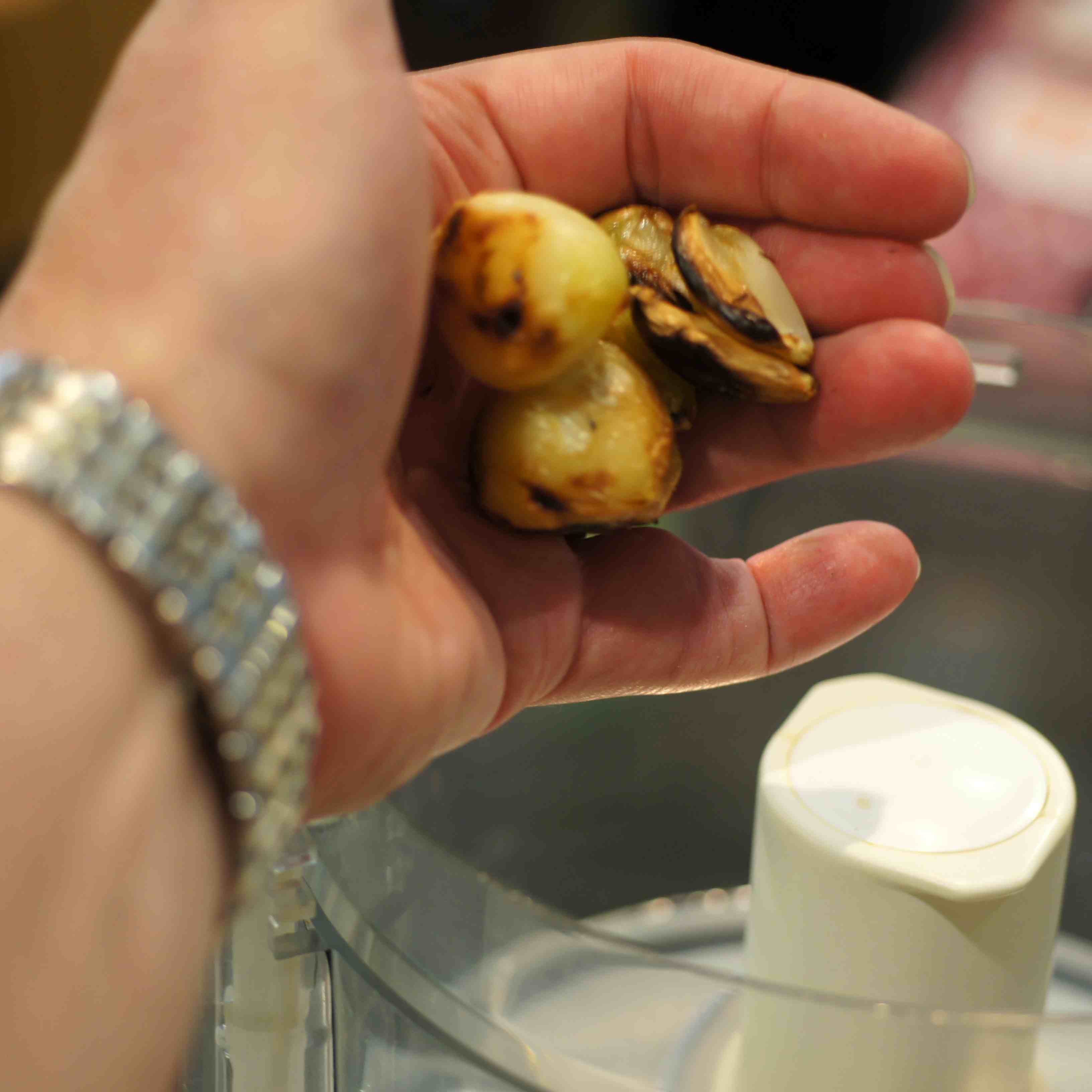 Add the roasted garlic to the food processor.