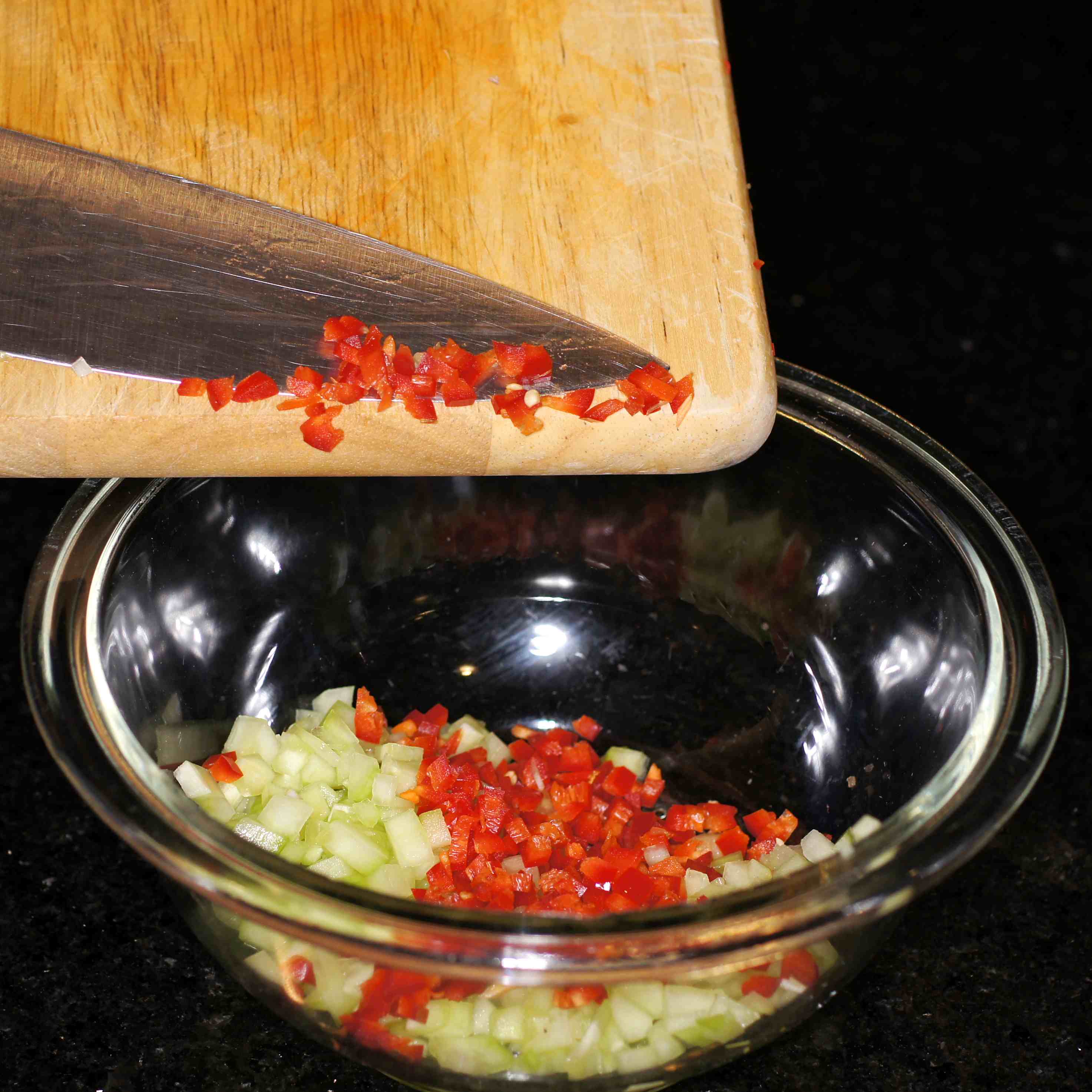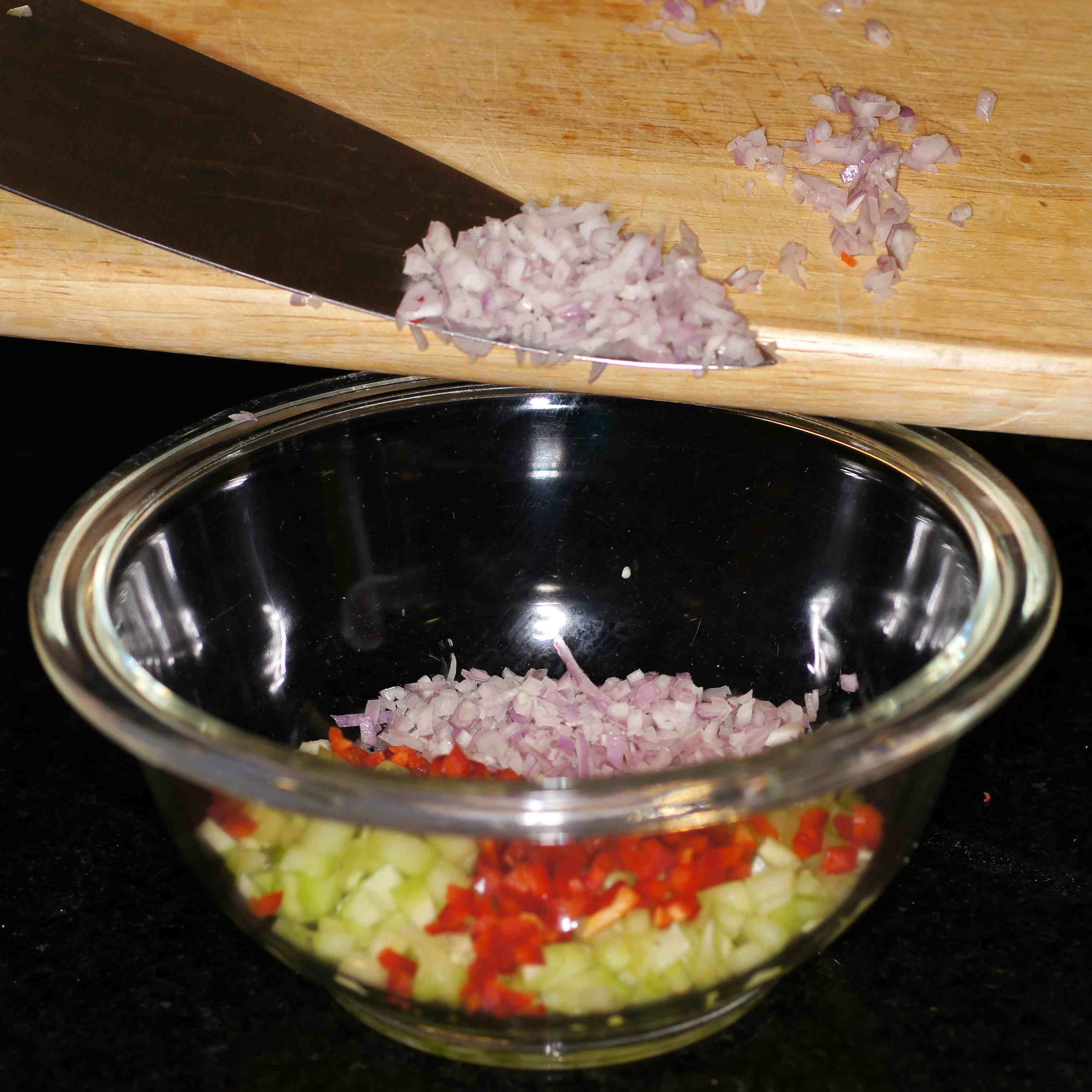 First, make the relish you are going to use as garnish. Start by adding the cucumber to a small mixing bowl,