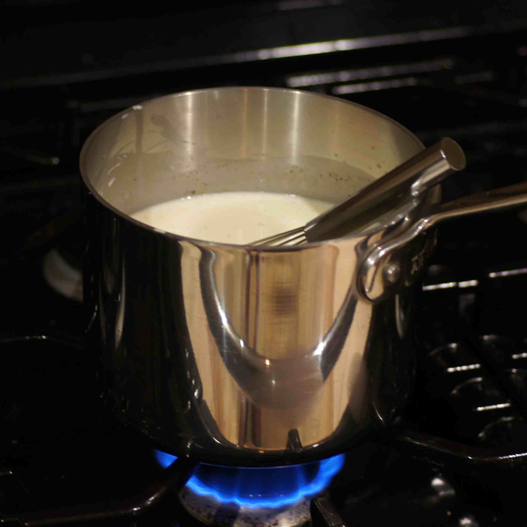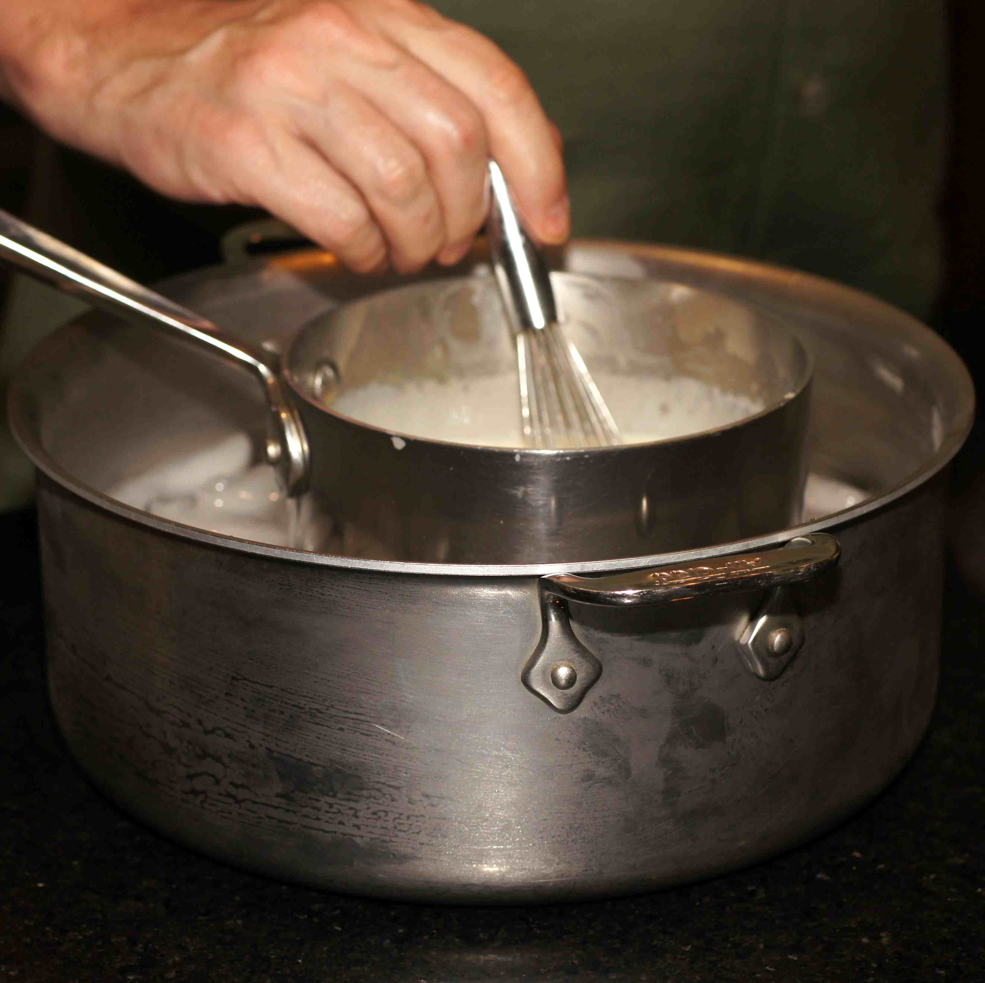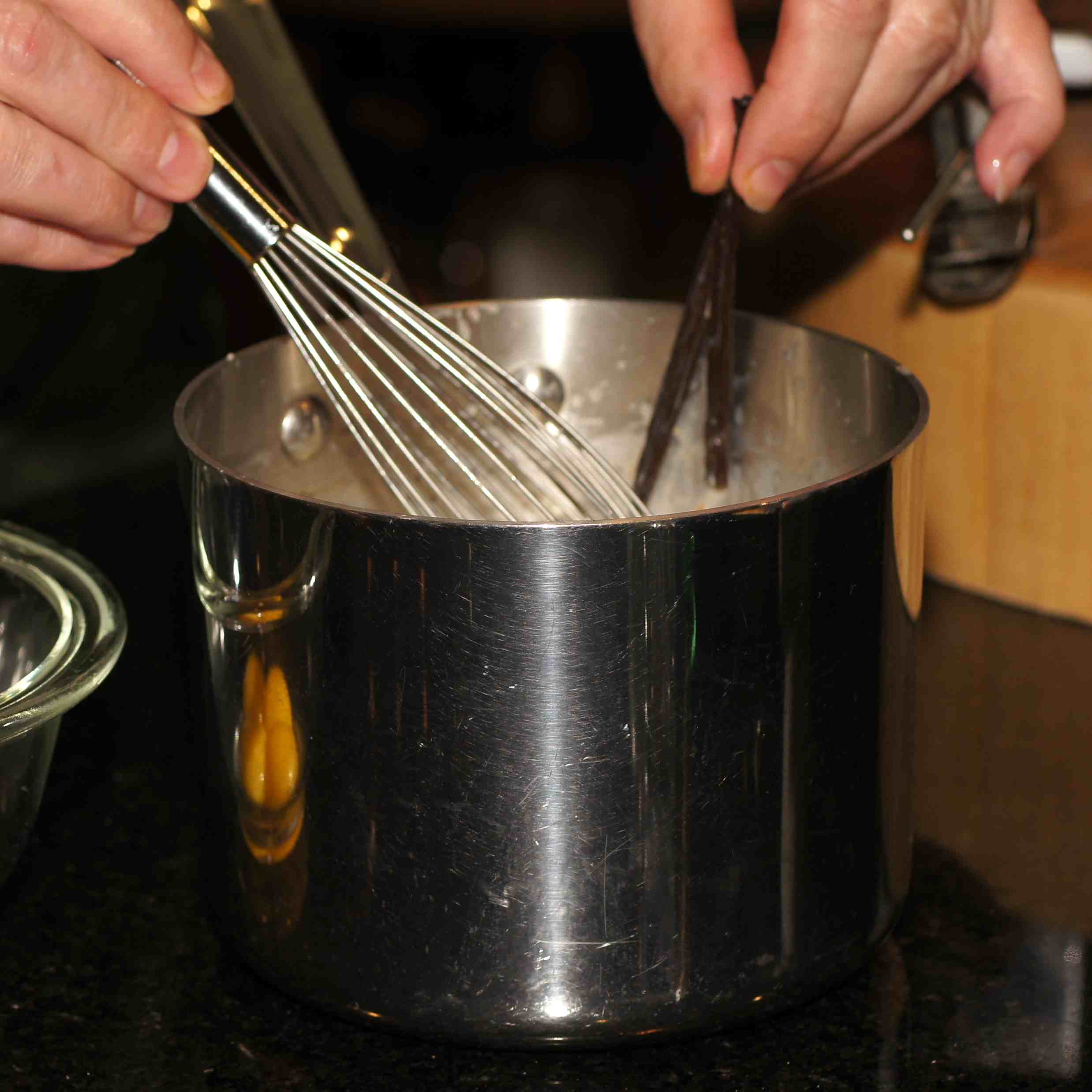 Return the saucepan to medium low heat, whisking frequently, heating until the mixture reaches 176 F or until it coats the back of a spoon. Remove from heat and place pan in a ice water bath to cool, whisking periodically.