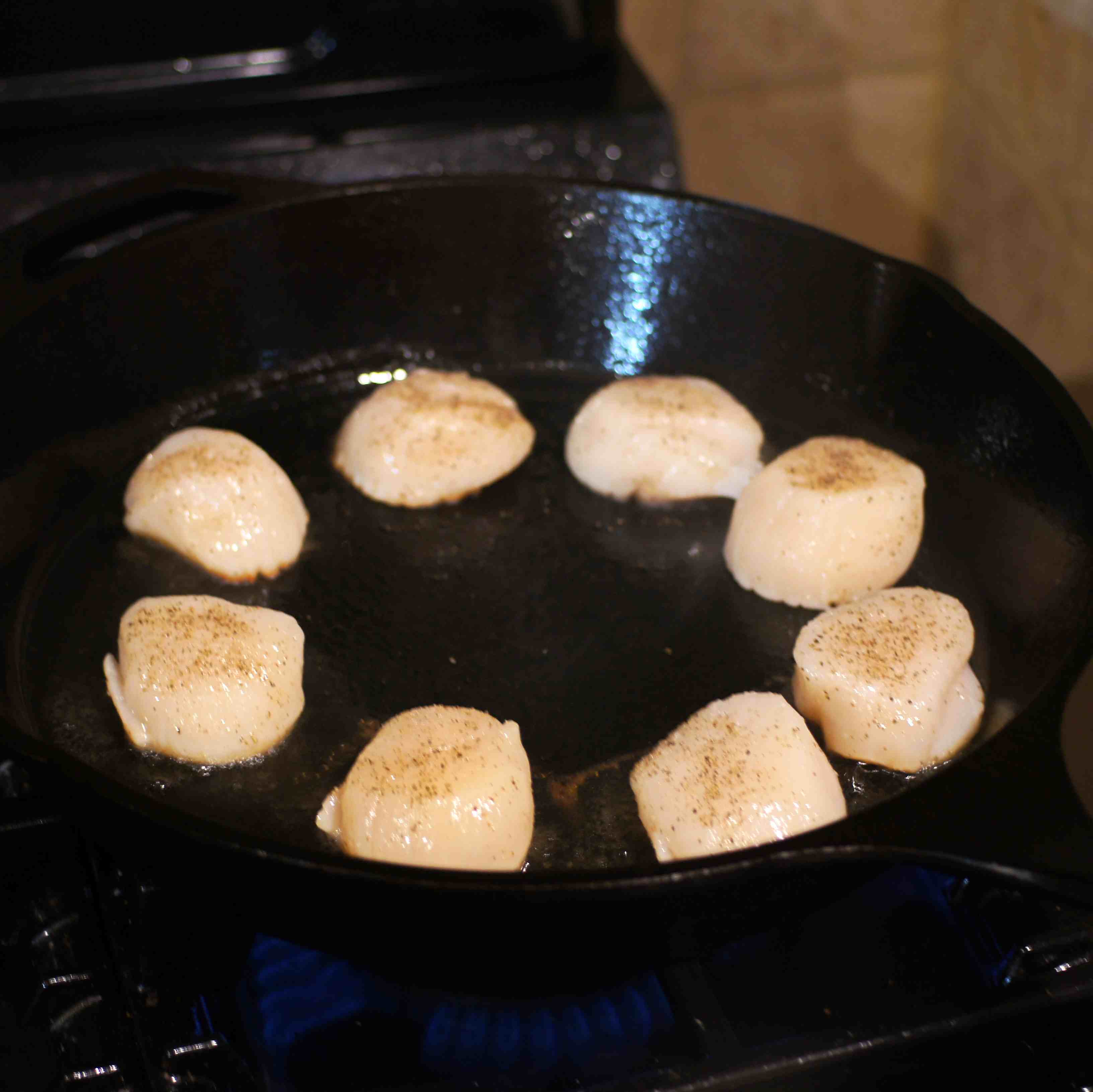 First, pat the scallops dry with a paper towel. This allows the scallops to caramelize and develop the nice little brown crust.