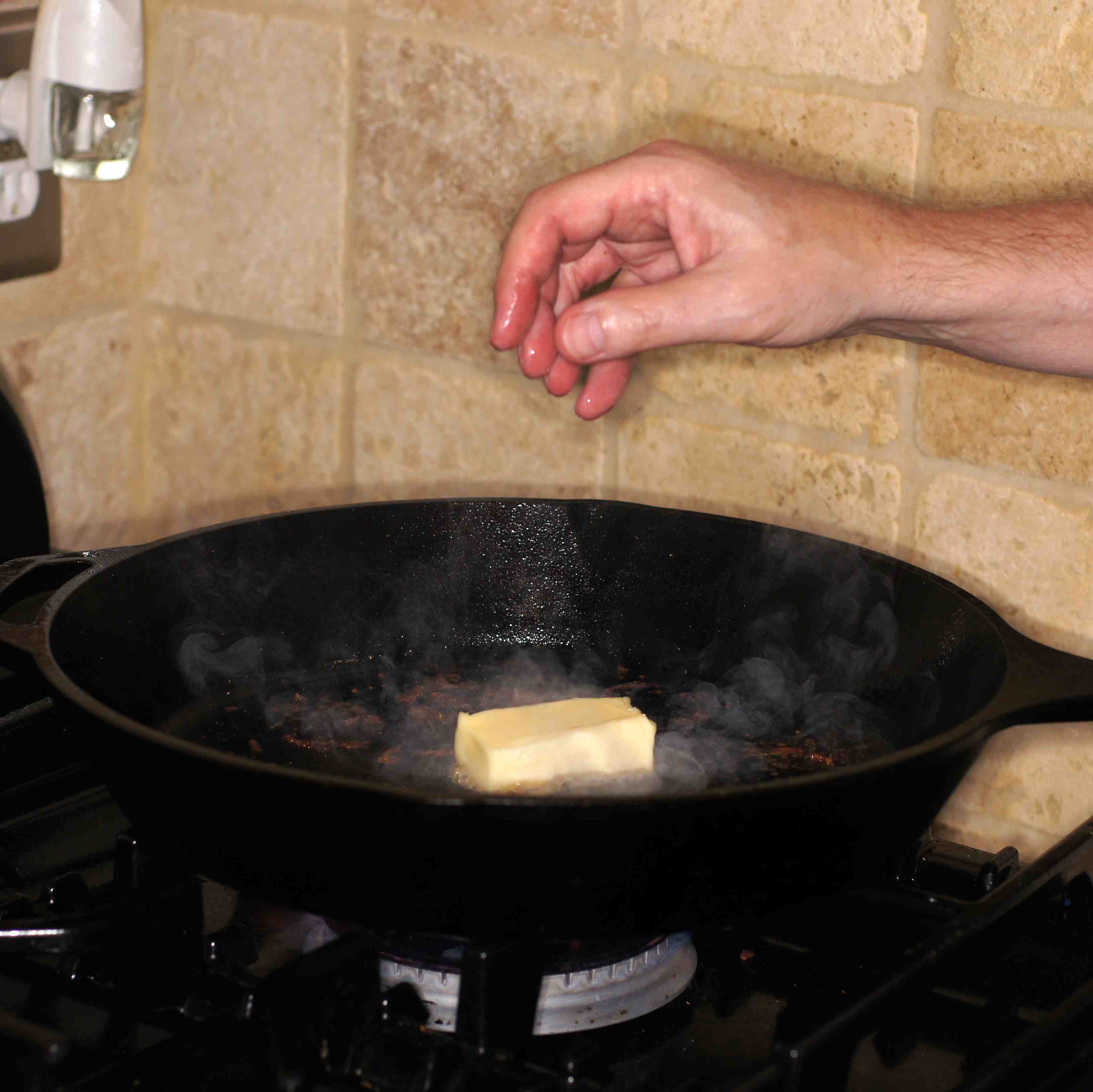 Heat a heavy bottom skillet over high heat. Do NOT use a non-stick skillet. If you use a non-stick skillet you will prevent the caramelization of scallops. Either use cast iron (my preference), stainless steel or stainless steel alloy. When hot, add the oil to the skillet.