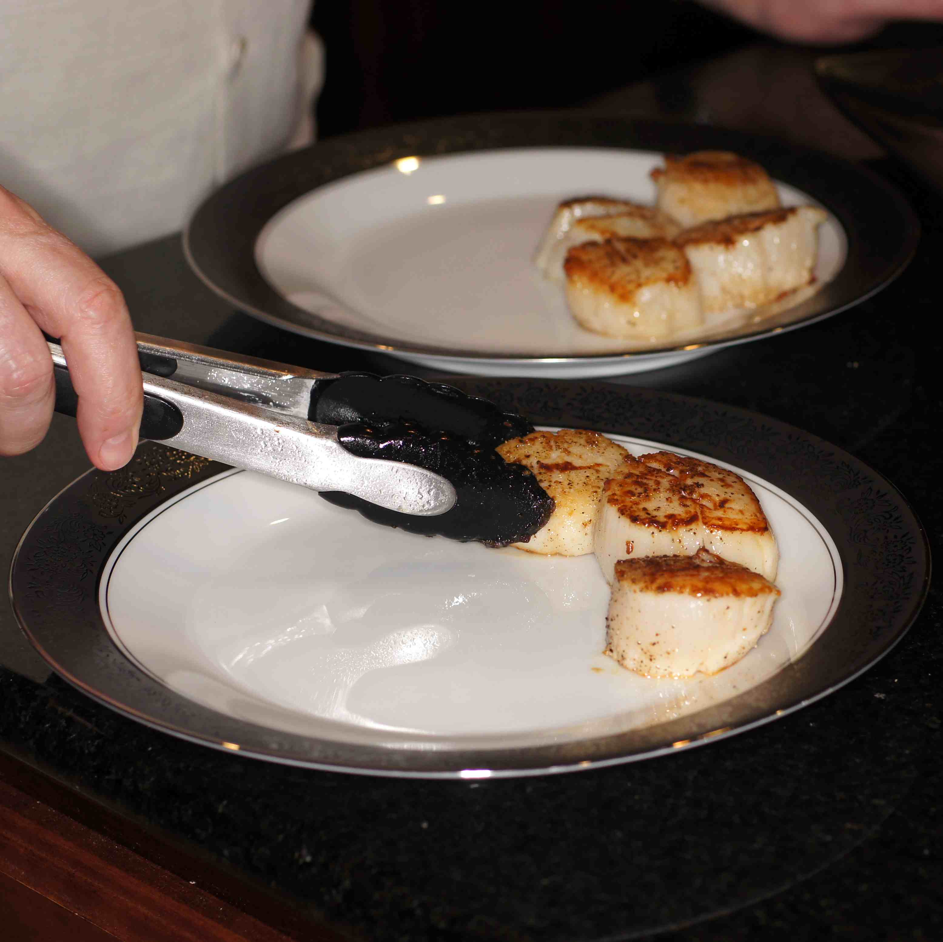Do not disturb them for 1-1/2 minutes. You will see them caramelize on the bottom. After 1-1/2 minutes, the scallops will have sufficiently caramelized so as to release from the pan. So, turn them, again maintaining their spacing.