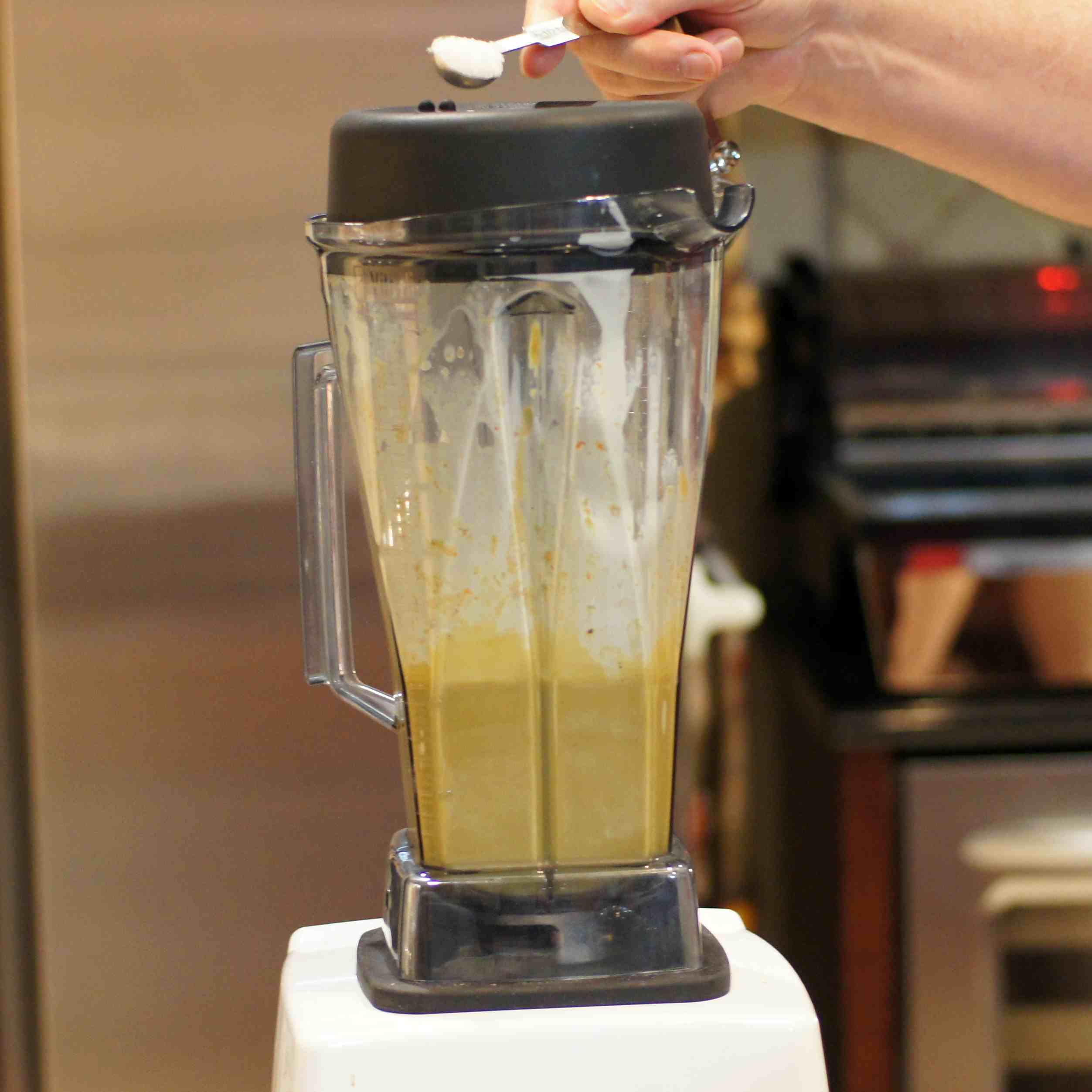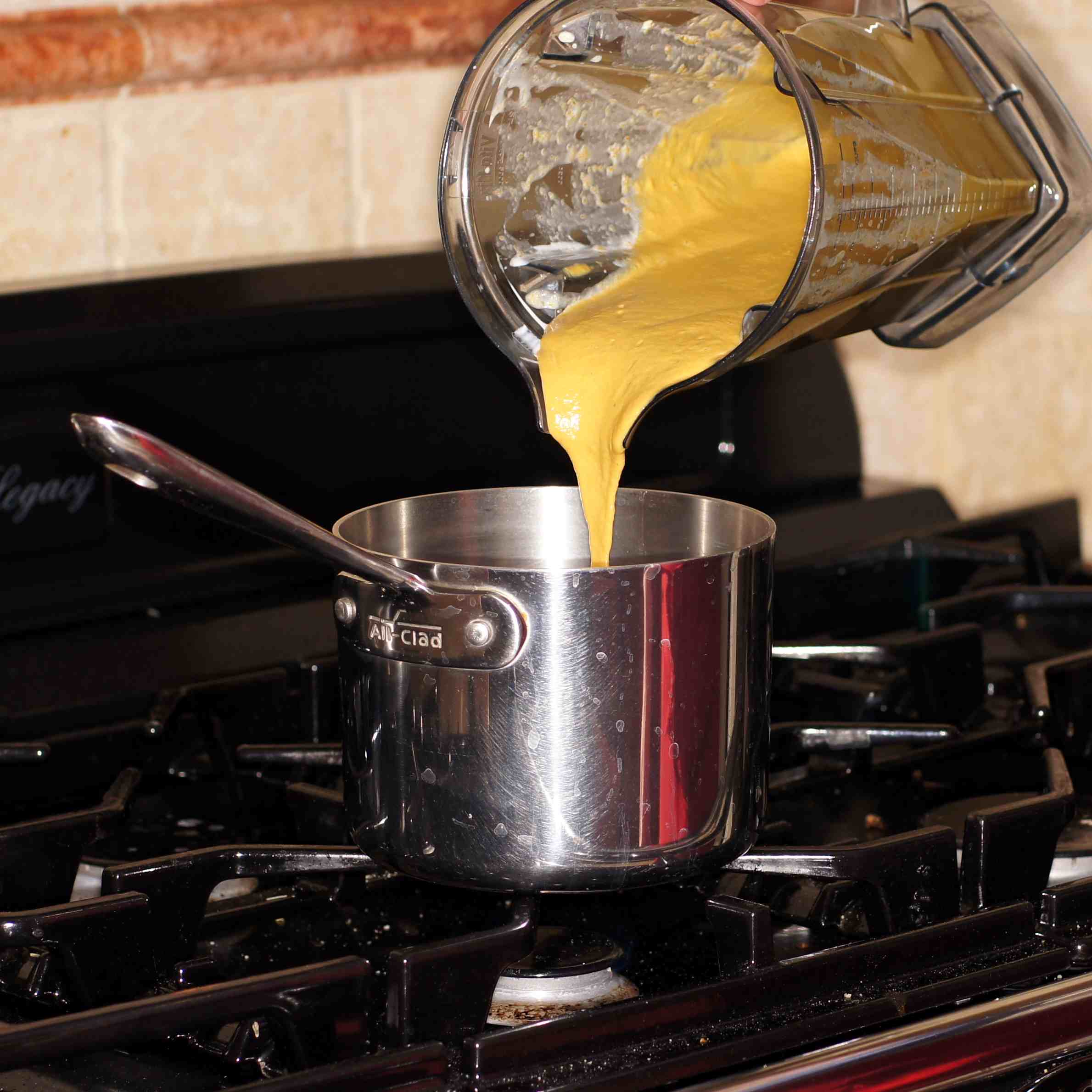 Cook over medium heat whisking frequently until it begins to give off a nutty aroma, some say it smells like roasting hazelnuts – roughly 2 – 3 minutes. This is when the flour is beginning to cook. Now, add the cream/chile mix in the blender to the sauce pot.