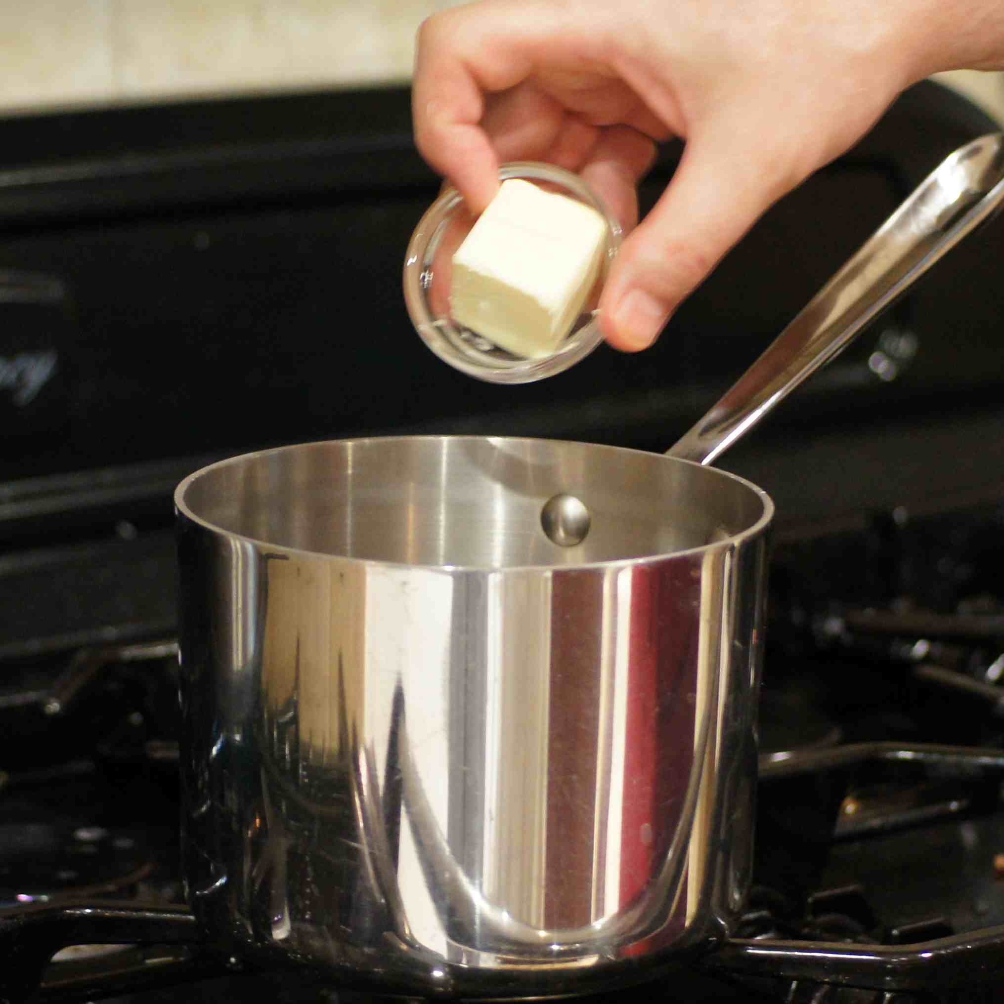 Now, make a blonde roux. Add the butter to a sauce pot over medium-high heat and melt