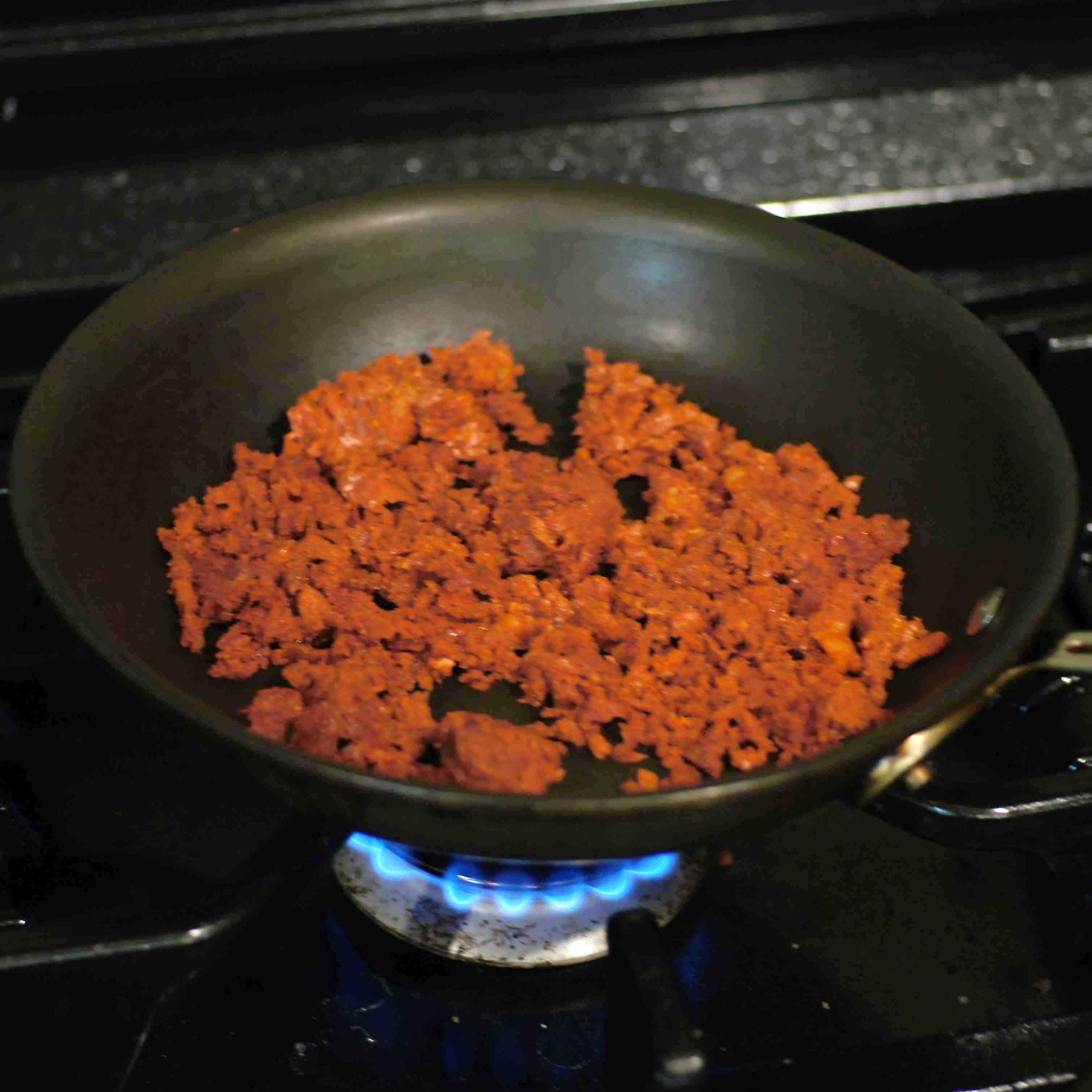 While the water for the eggs is coming to a boil, cook the chorizo.