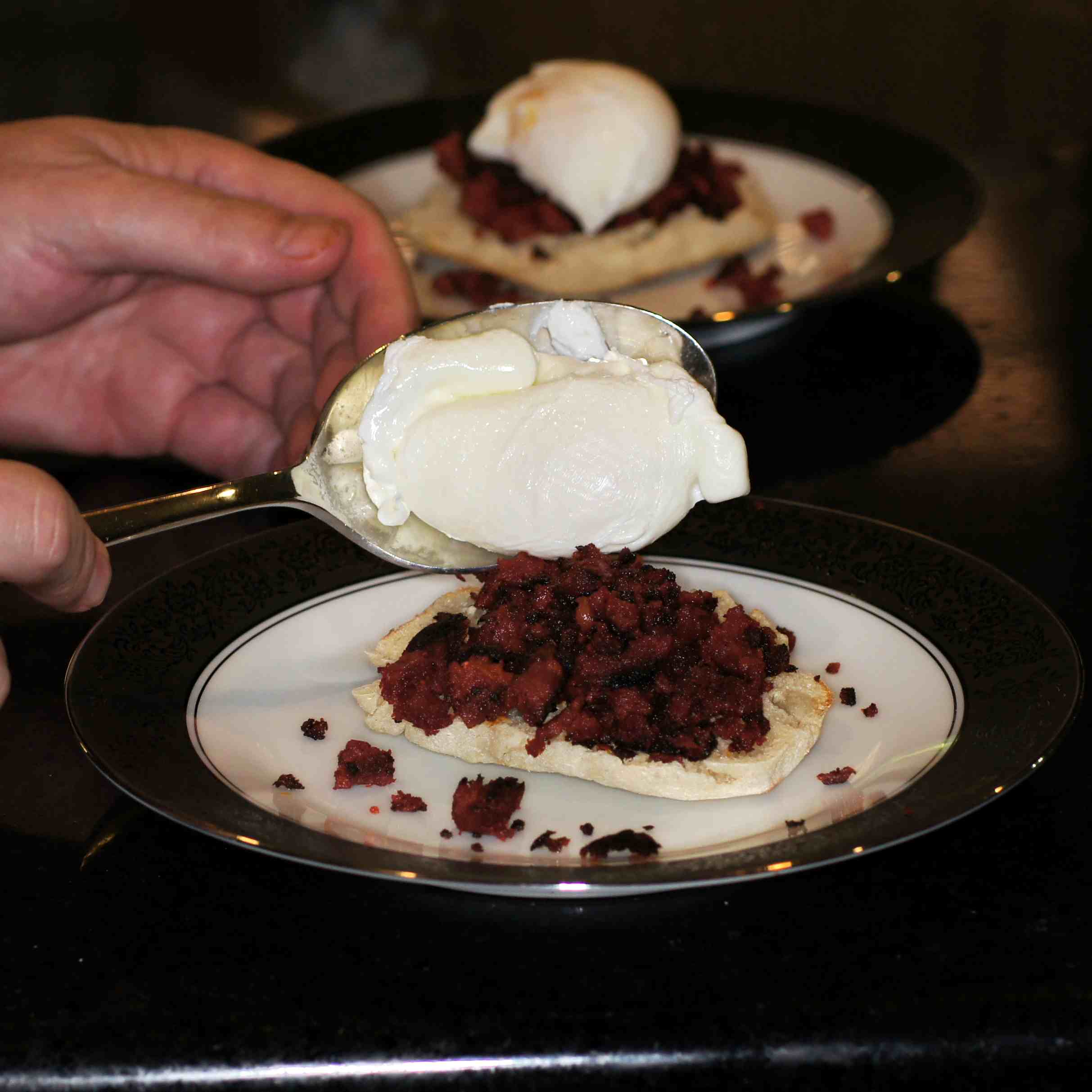 Fill a skillet with water. Add 1 Tbsp white vinegar and bring to a boil. Add the eggs to the boiling water 1 at a time.