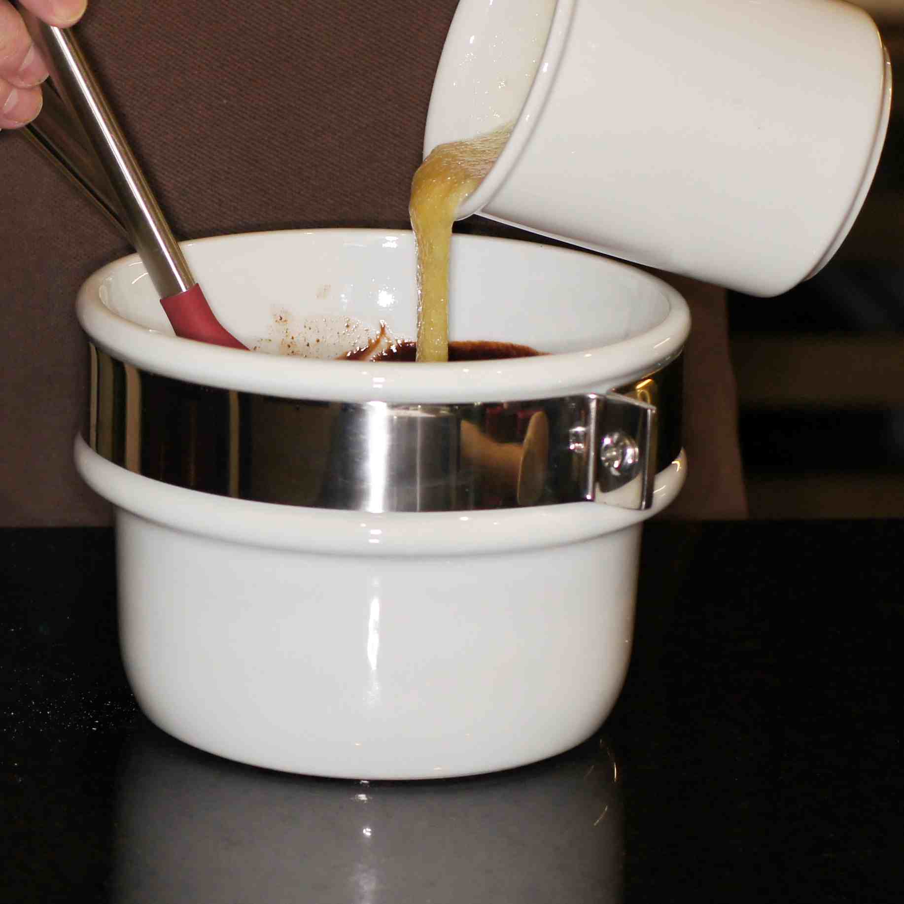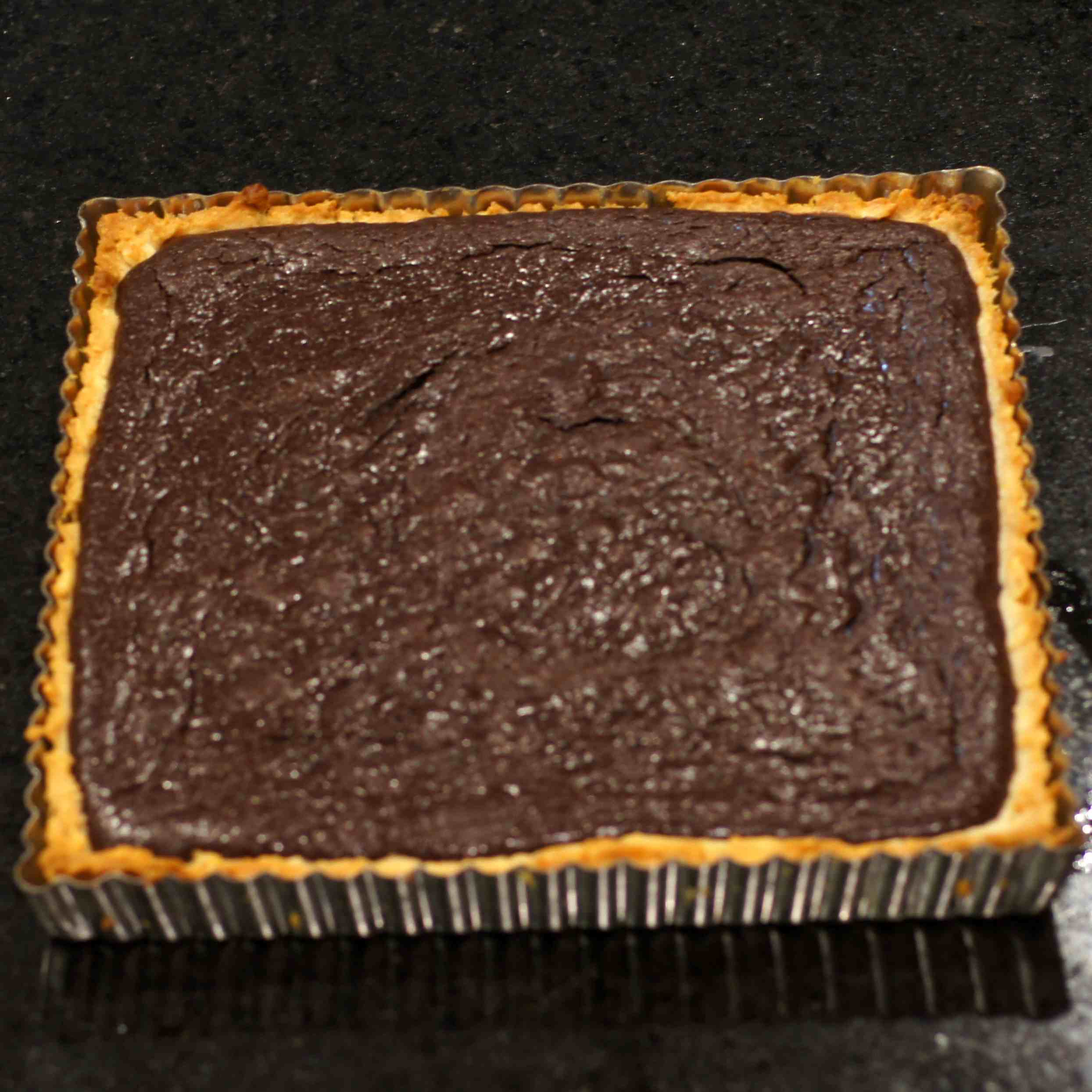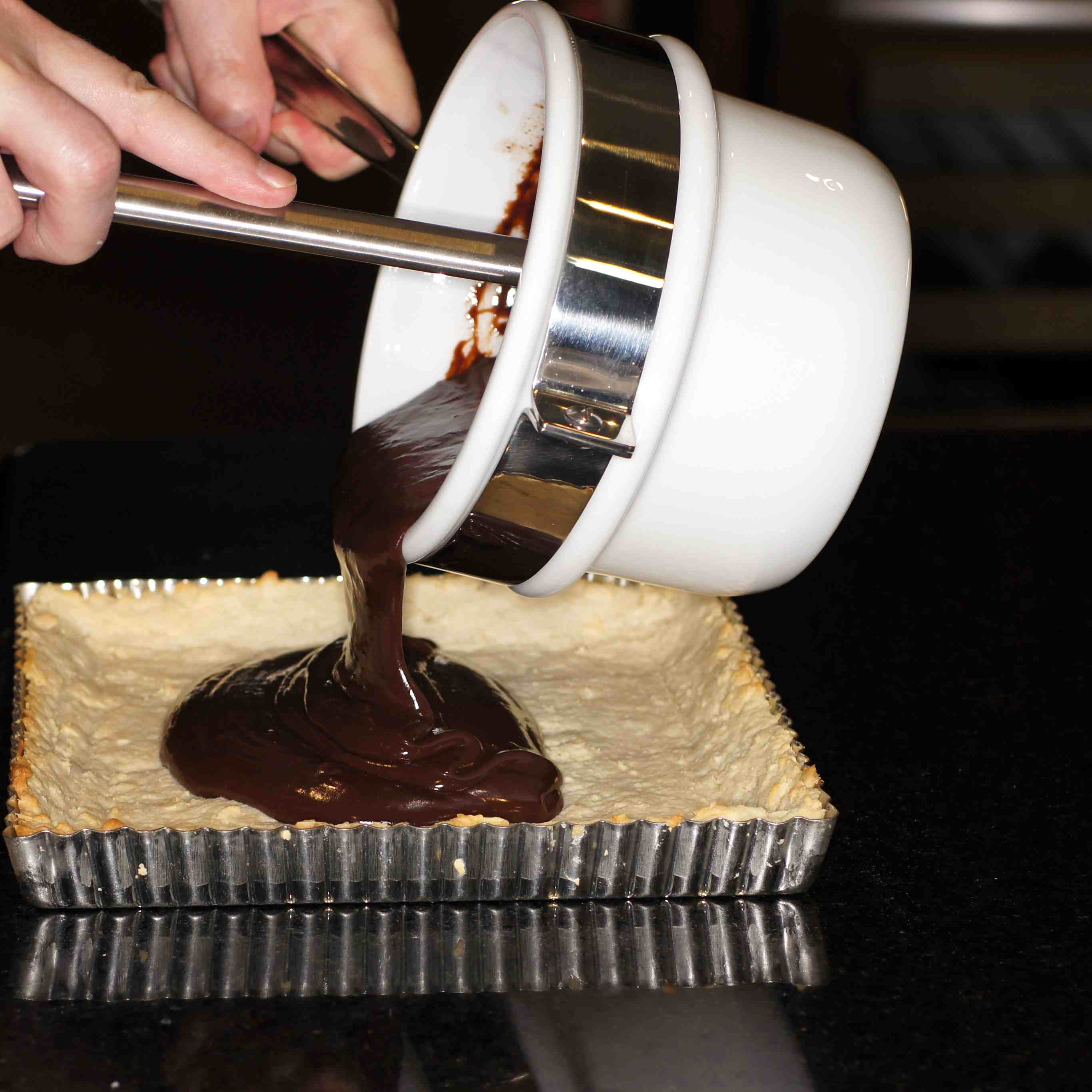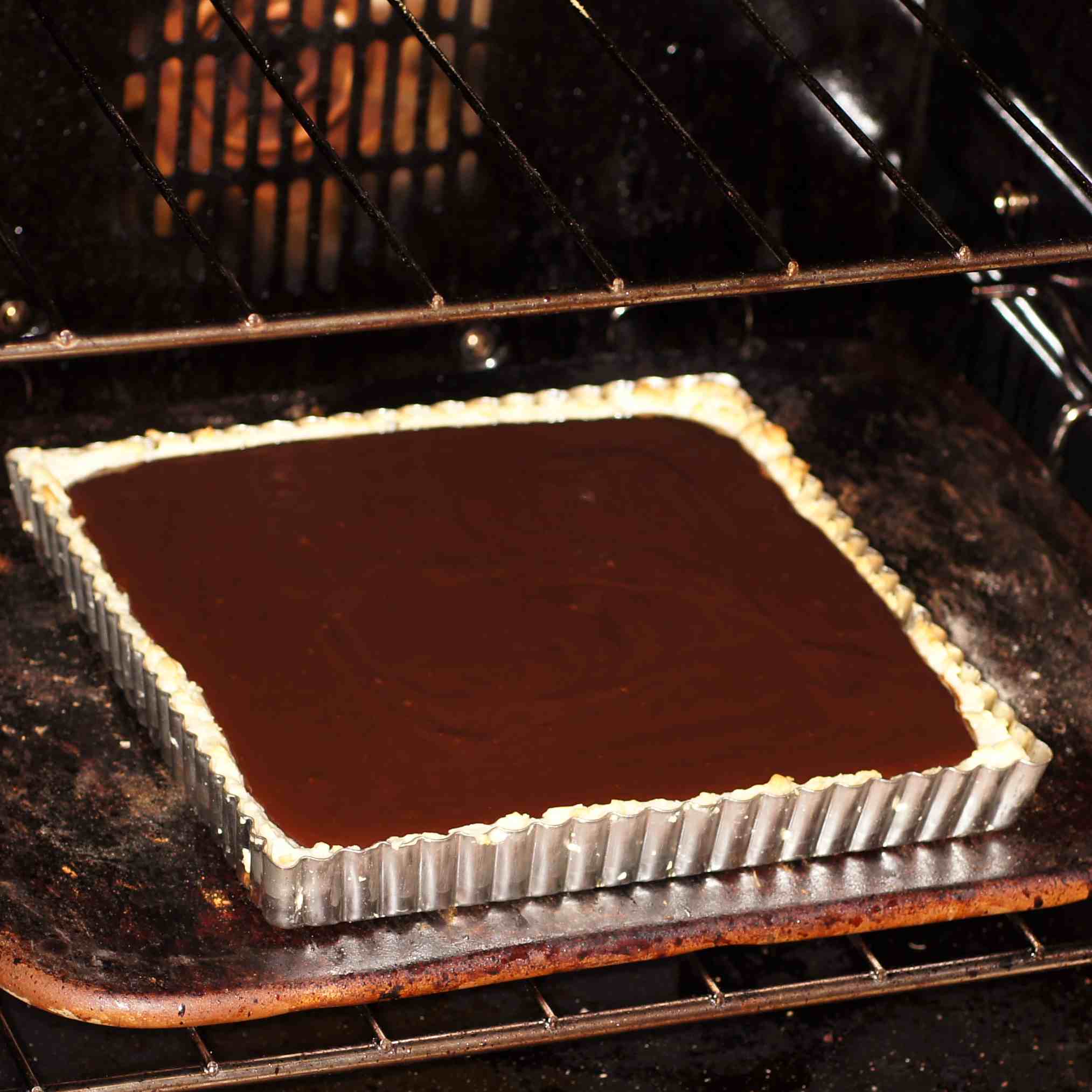 Pour chocolate mixture into pre-baked tart crust