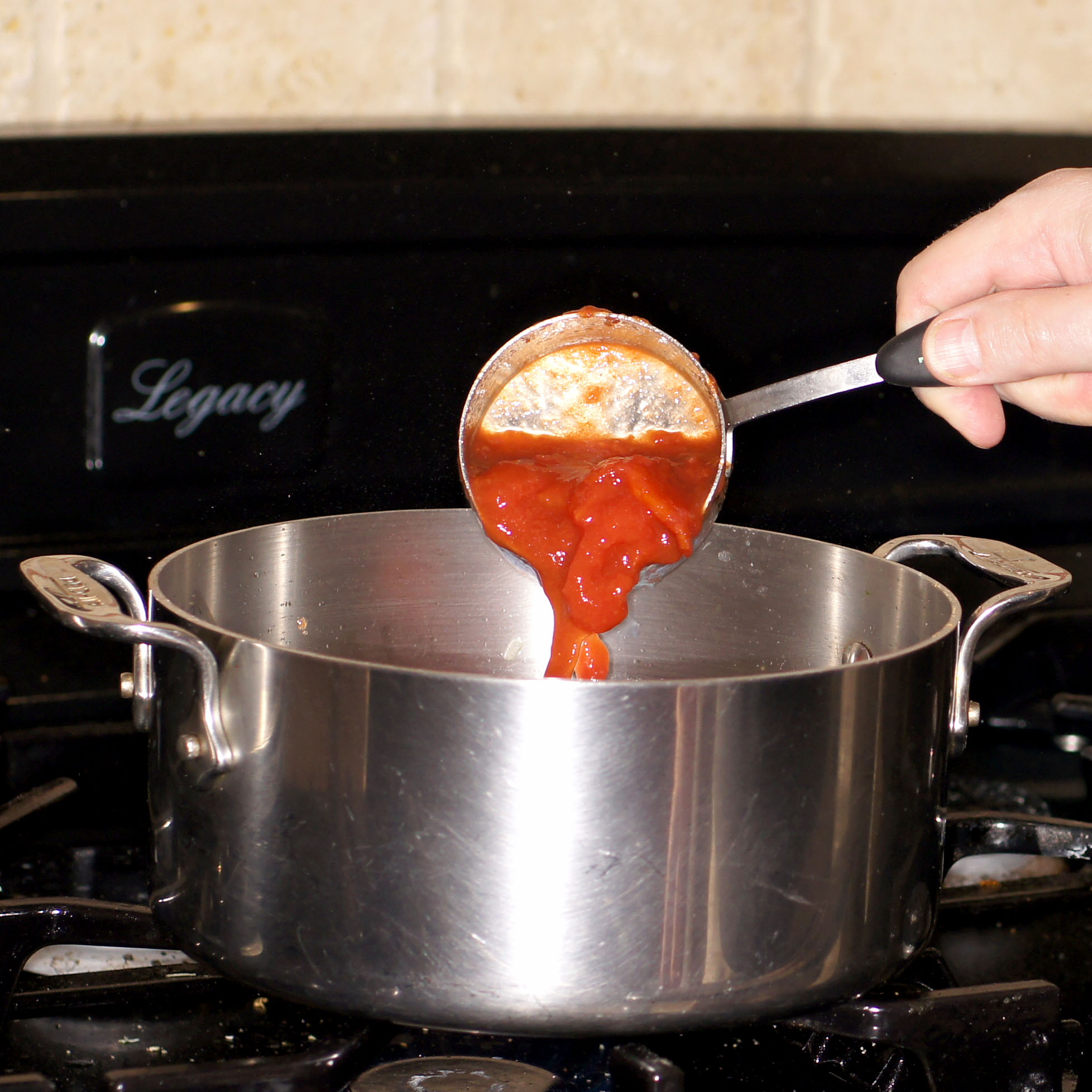 Next, add the tomato/veggie mixture and increase heat to medium.