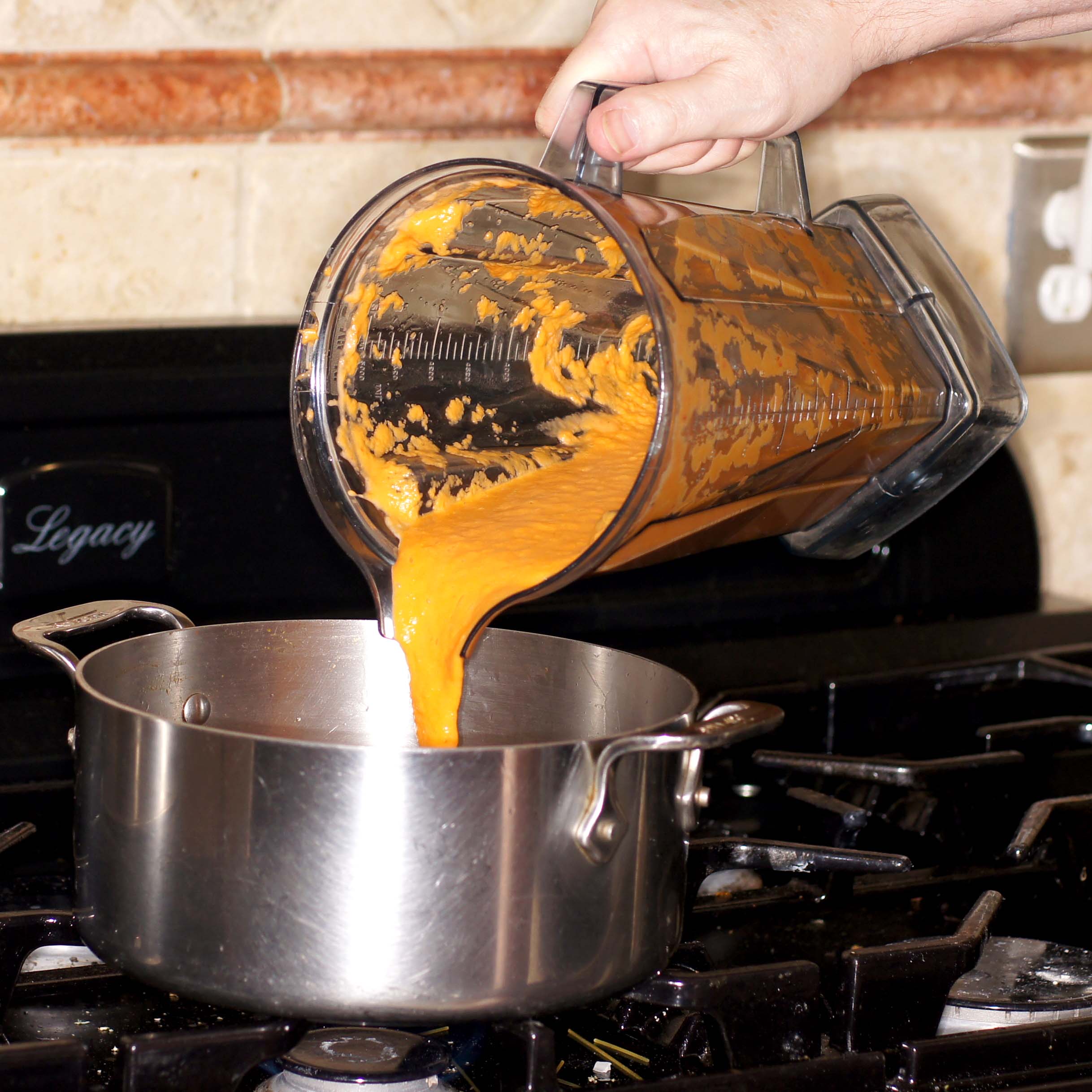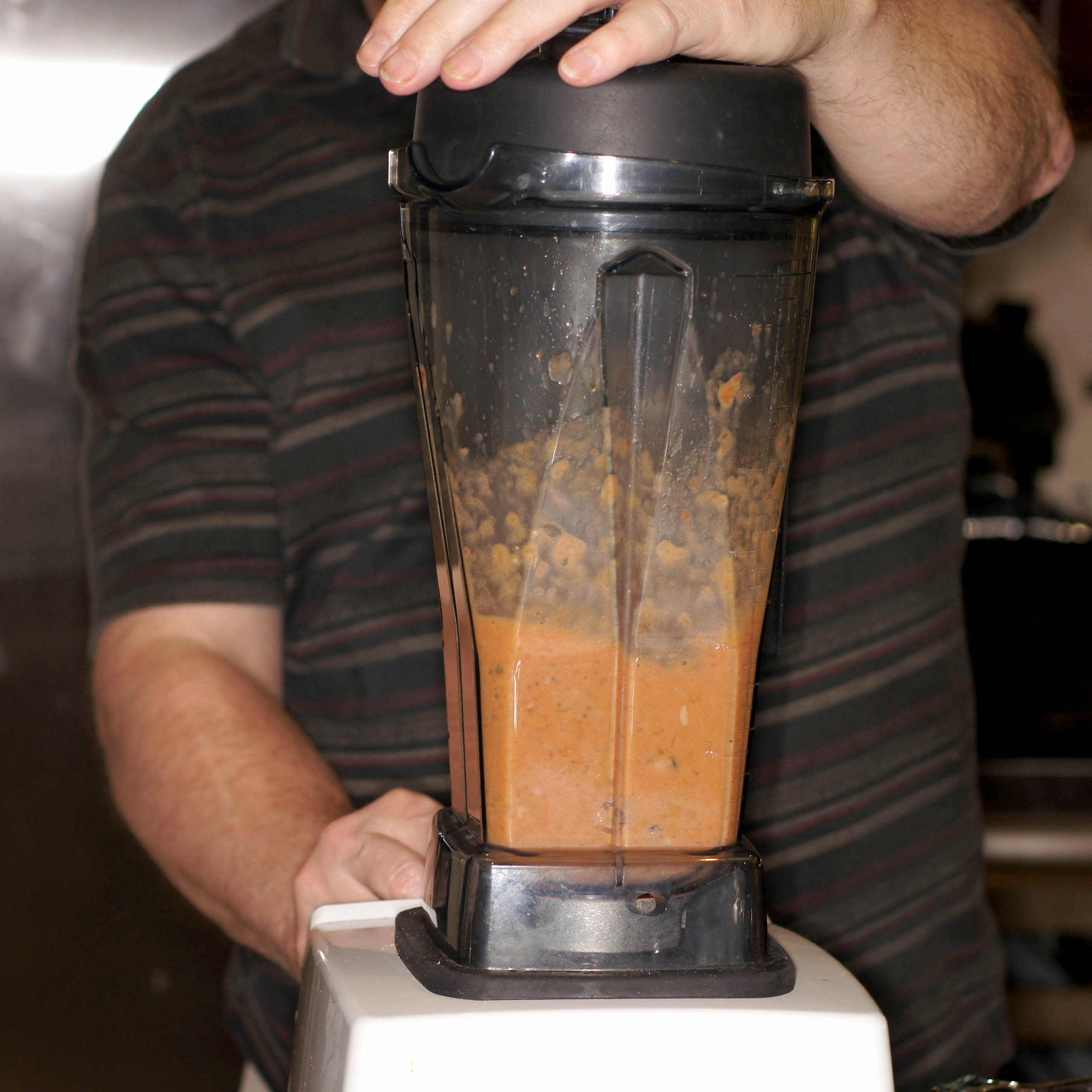 Pour the cooked tomatoes and veggies into a blender with 1/2 cup of water.