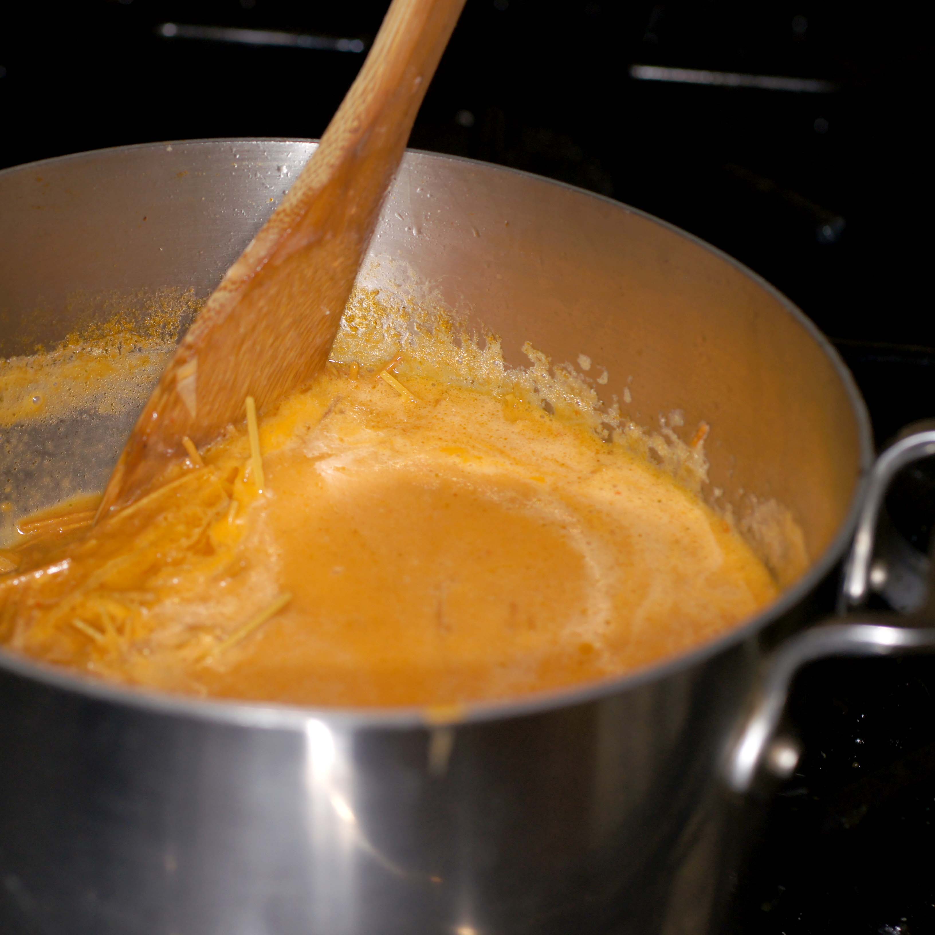 Fry the noodles, stirring constantly, until they turn light brown, roughly 5 – 6 minutes. DON”T BURN THE NOODLES.