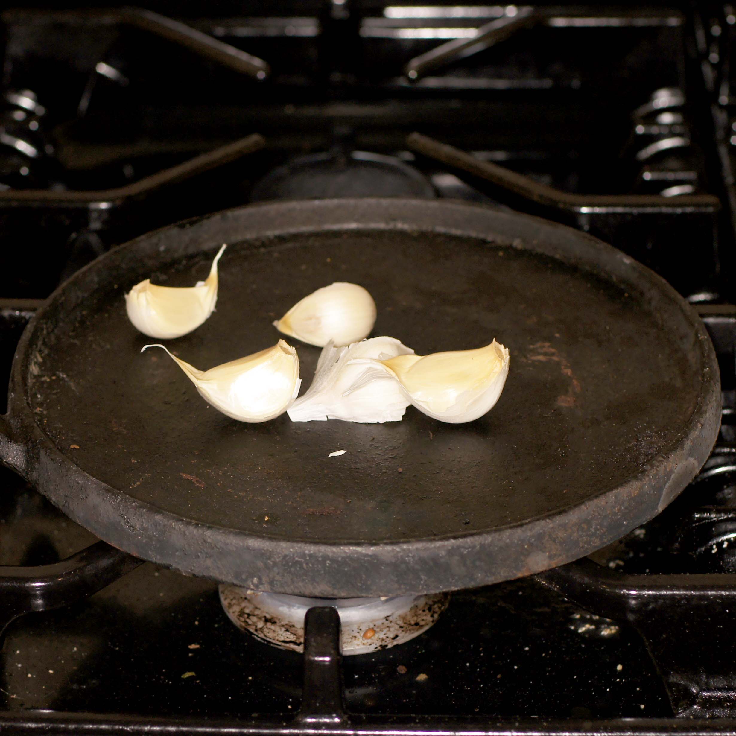 While the veggies are roasting, roast the garlic by placing the garlic (with the skin) on in heavy bottom skillet (or a comal) and cooking it over medium high heat until the skin is browned/blacked all around. Obviously, you have to peel them before using them.