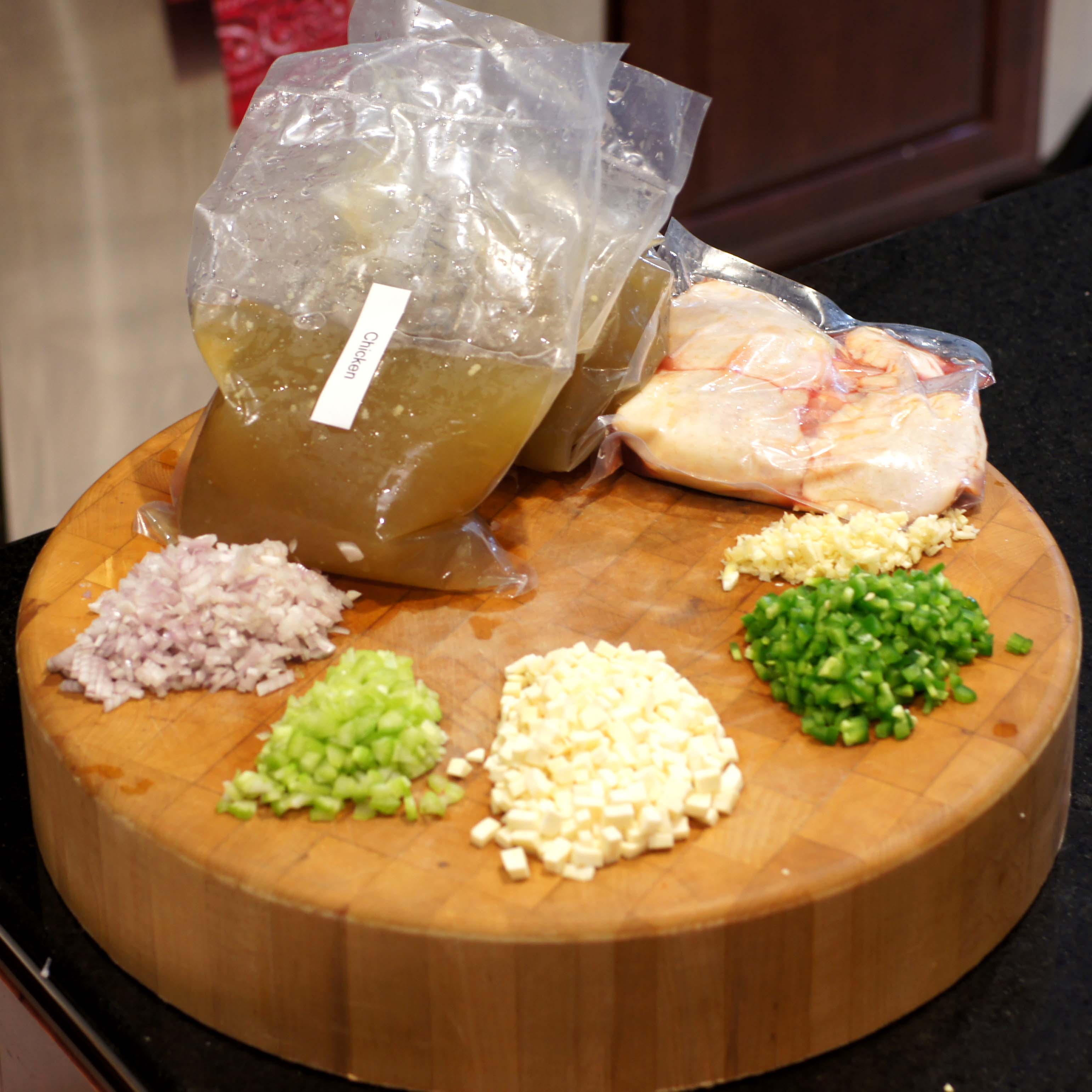 Return to a boil, reduce heat medium and allow chicken thighs to poach. Poaching the chicken thighs in the broth allows the chicken meat to retain much of its flavor. Also, poaching allows the meat to maintain it’s moisture. After 20 – 30 minutes, remove the chicken thighs from the pot, remove the bone, dice the chicken and set aside.